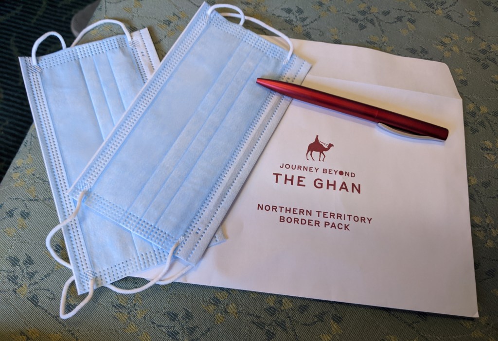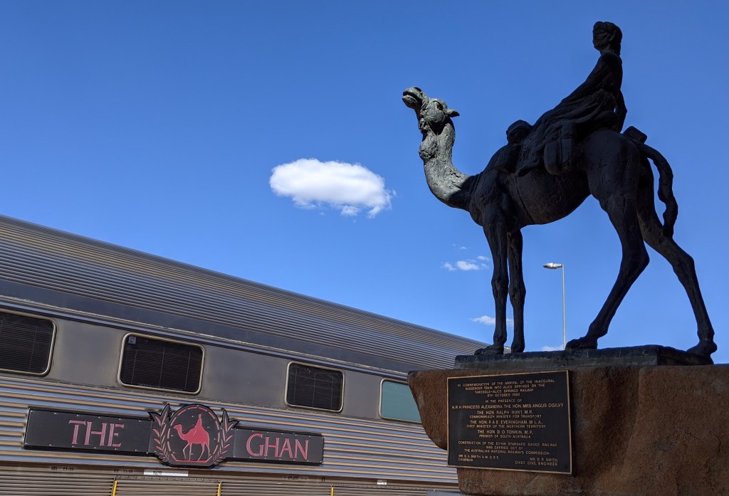 Before alighting in Alice Springs a health pack was distributed. Another Border Pass was viewed by efficient and pleasant staff. One of the only two camels I saw was this statue at the station. Note, The Ghan is so long one does not alight at what normally passes for a station. Steps were used for us to get to the ground.