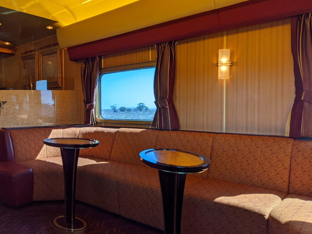 The lounge, rarely empty, but reminiscent of Michael Portillo’s trip on The Ghan televised in Great Australian Train Journeys. Plenty of champagne (and other drinks, of course), nibbles and discussion.