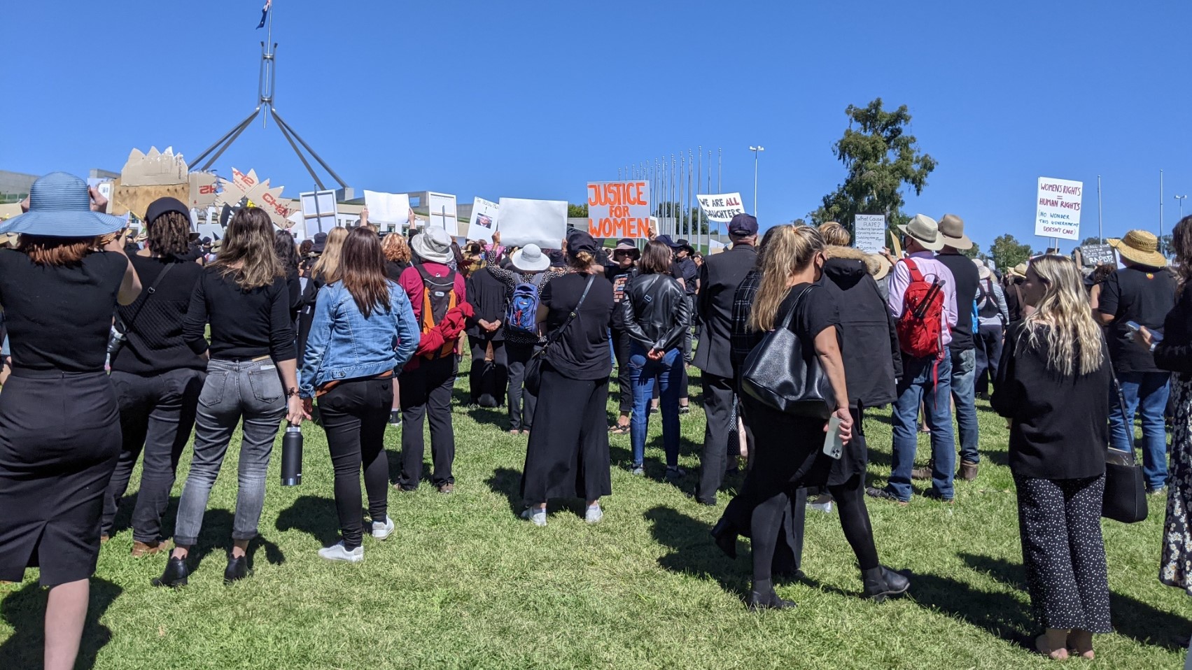 Thousands of people, predominantly women, but with plenty of men, children and dogs also in attendance, rallied at Parliament House, Canberra. The sun was shining, but my feeling is that the thousands would have been there in the rain. After all, Canberrans came out in droves, despite the snow, to Peoples Walks For Reconciliation in 2000. The anger about inequality is an important driver of rallying Canberrans, and today that anger, despair, demand for change, refusal to be fobbed off with meetings behind closed doors with people who consider themselves too important to appear where it would be normal to do so became a huge, peaceful rally for women.