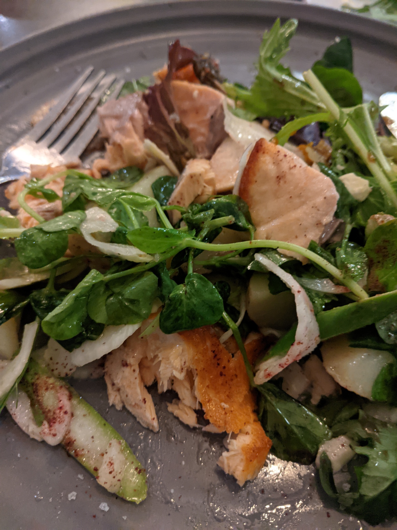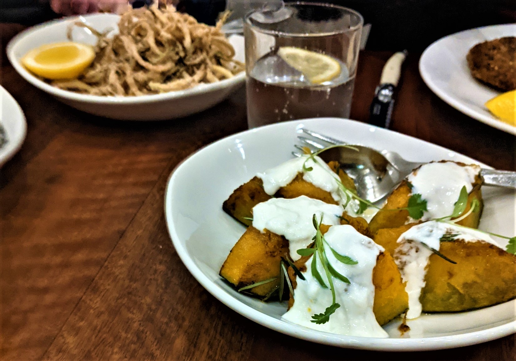 The halloumi pops are back on the menu which is wonderful. My salmon could have been a little less well cooked, but the crispy skin and accompaniments were delicious. Salads at Trev’s are always excellent, and the pumpkin salad with pine nuts, fetta, rocket and balsamic was a good choice. I also love the Pomme Salad which unfortunately was not available on this occasion. The New Zealand house white was very good indeed, served with generosity. It was delightful to see the pleasant and efficient staff again.