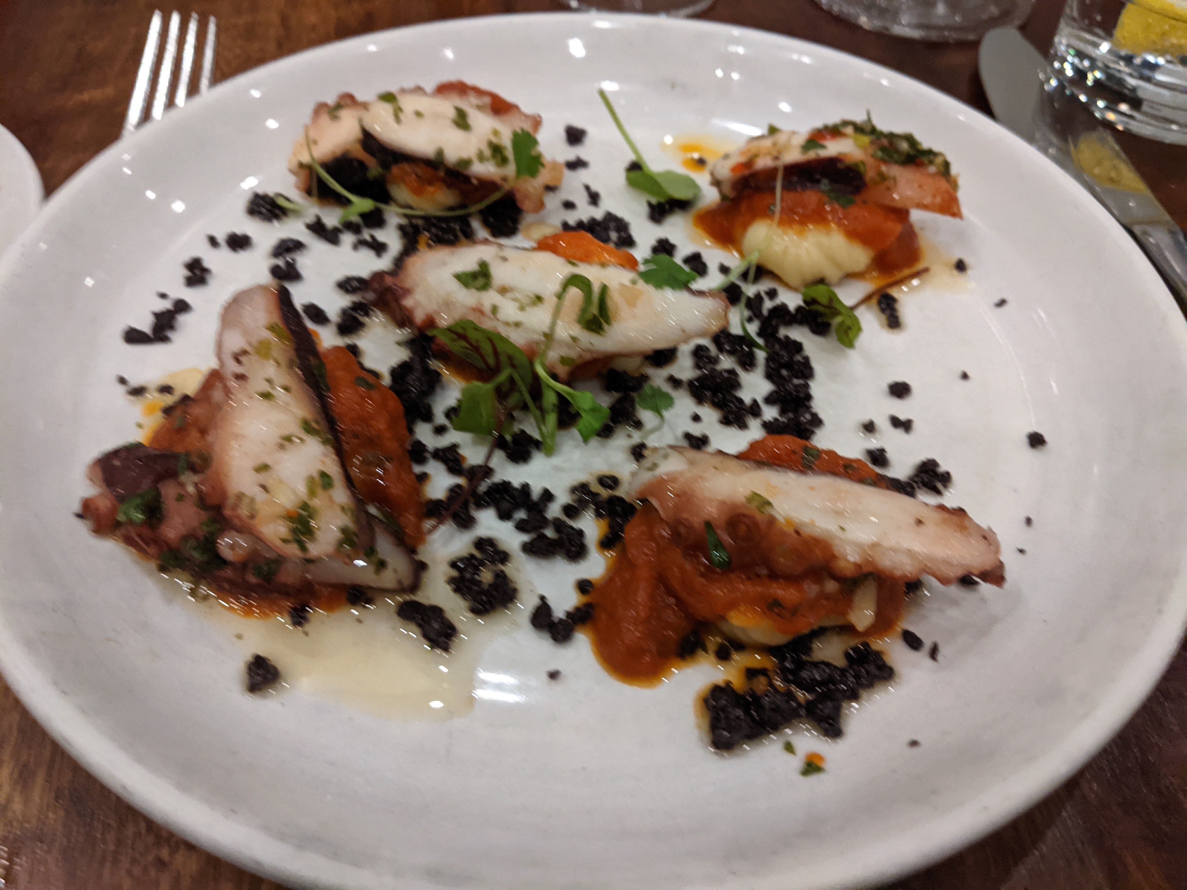 The menu is a delight. There is a wide variety of choice, but the authentic Italian theme is maintained. It was refreshing to choose different main courses, with shared accompaniments which were delicious with each individual meal. The zucchini fritters cannot be bettered – order them, you will be able to eat every scrap, whatever else you leave. The Wood Roast Pork Cutlet, Rosemary, Baked Fennel and Apple with Pork Jus was generous beyond measure; the entre of Grilled WA Octopus, Chilli, Smoked Eggplant and Lemon excellent; and yes, we had to try the wonderful traditional tiramisu. It met our expectations.