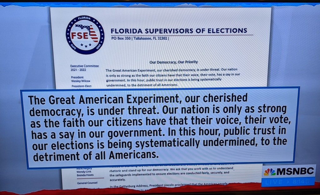 On TRMS Rachel was upbeat about several issues related to voting rights – she suggested that there are some glimmers of hope. One of these is the bipartisan report from the Florida Supervisors of Elections. Excepts appear below.