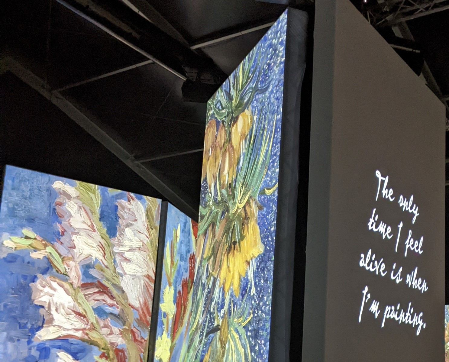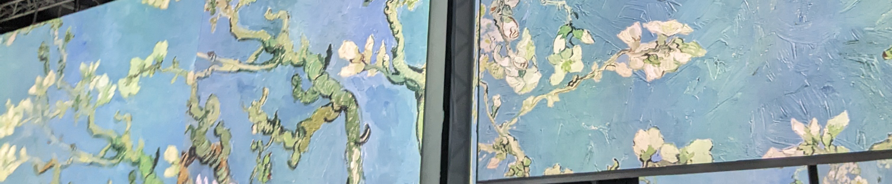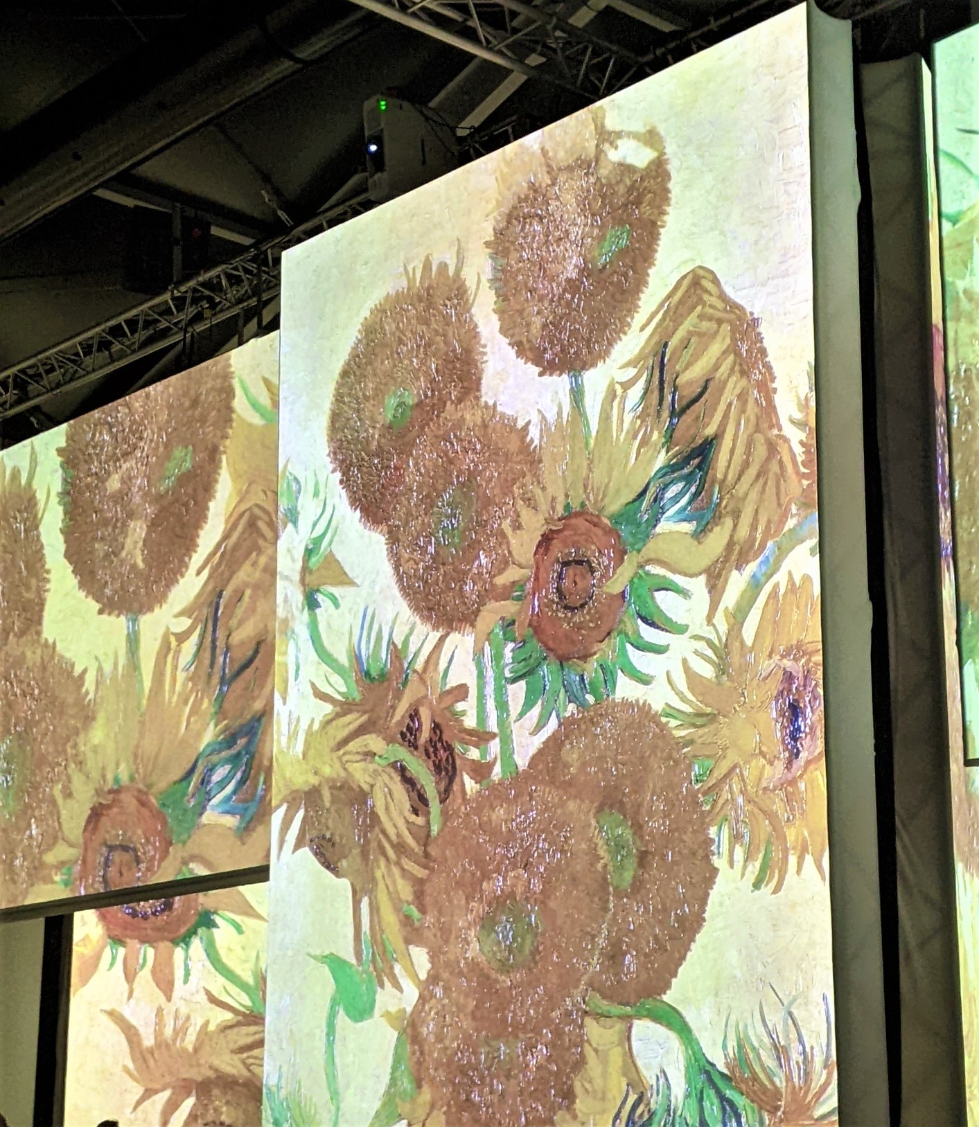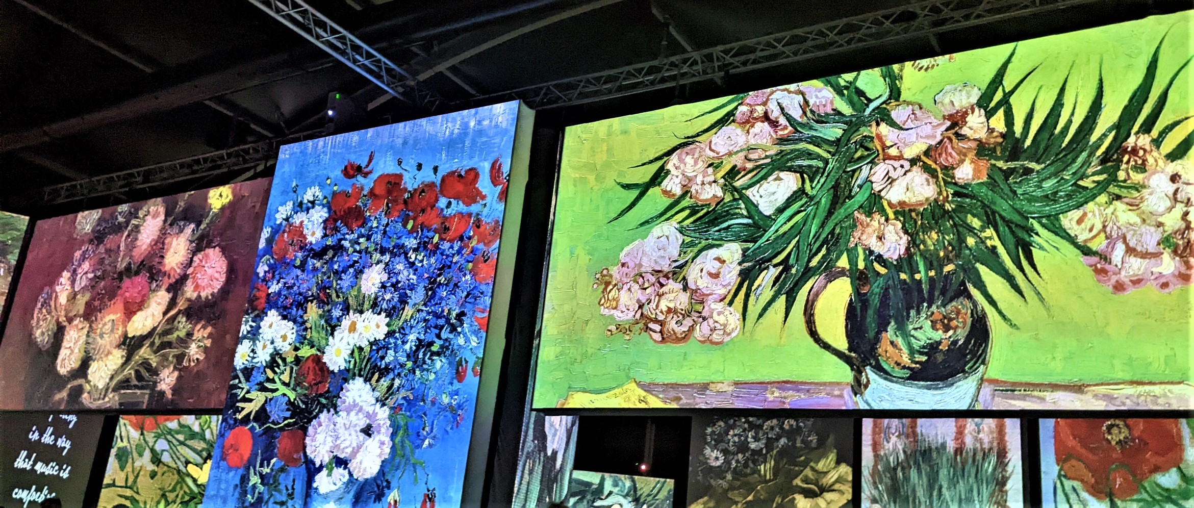 I visited this exhibition on Thursday, and found it interesting but not stunning. Paintings and quotes were projected onto screens, on the walls and in the centre of the exhibition space to a background of classical music. Although there was some seating, this was not generous. However, the length of the exhibition made it less important than it could have been . People of all ages sat on the carpeted floor, and appear to have had a satisfactory view from there. People observed social distancing, and many wore masks. The latter were encouraged. However, even after lengthy experience with glasses and a mask I have not mastered the art, so ensured that I observed social distancing, which was not difficult.