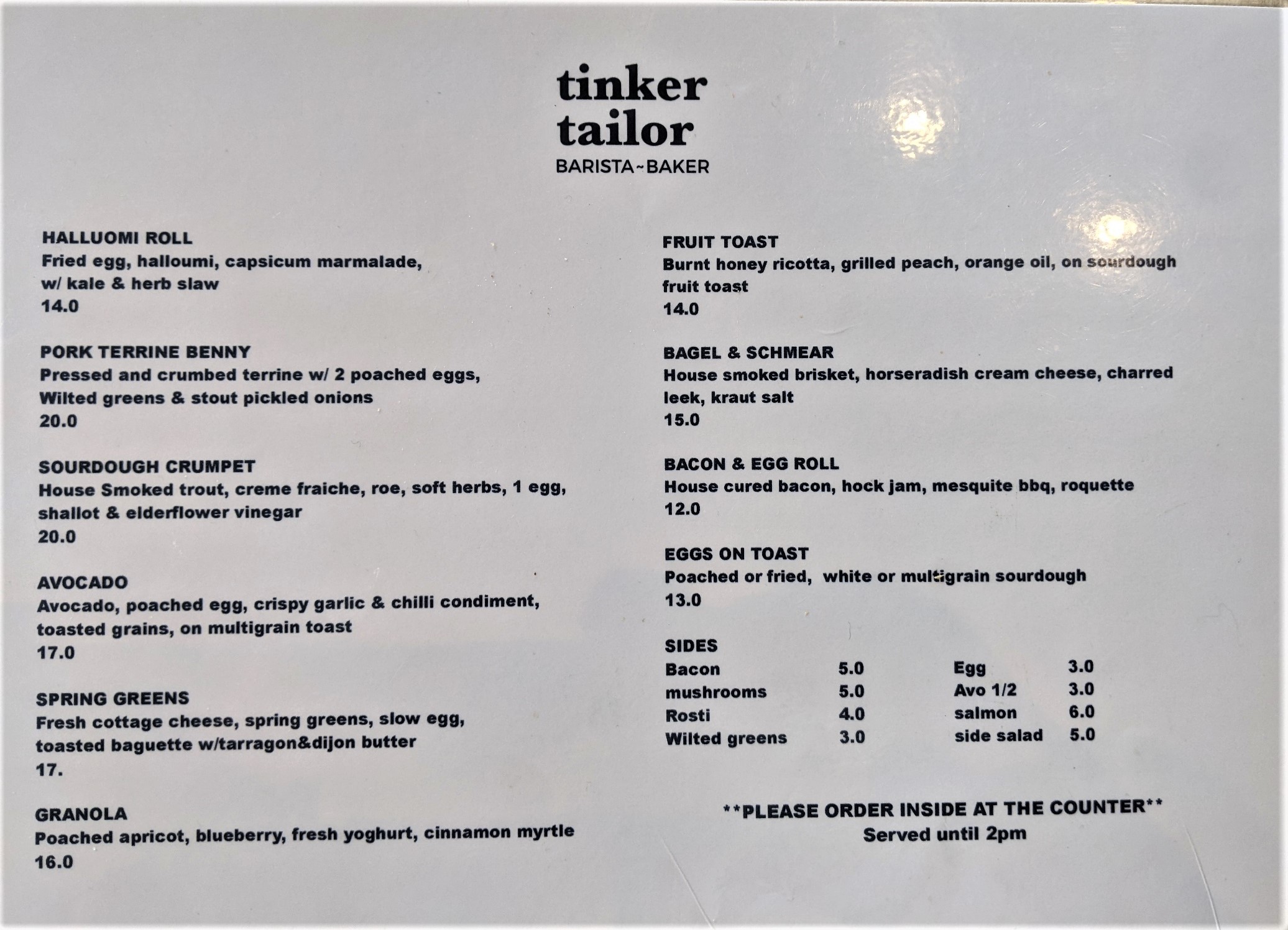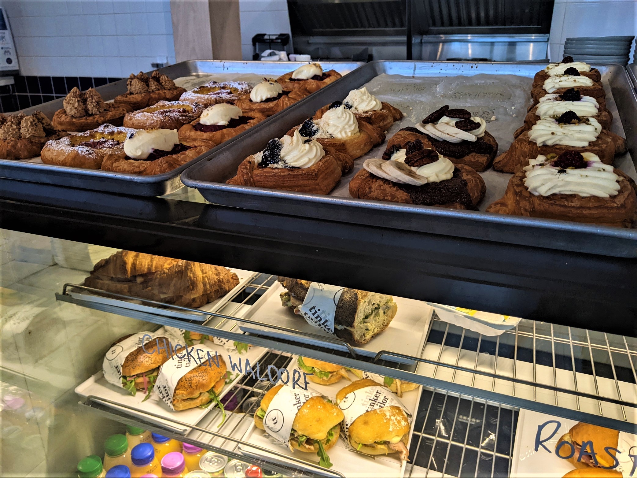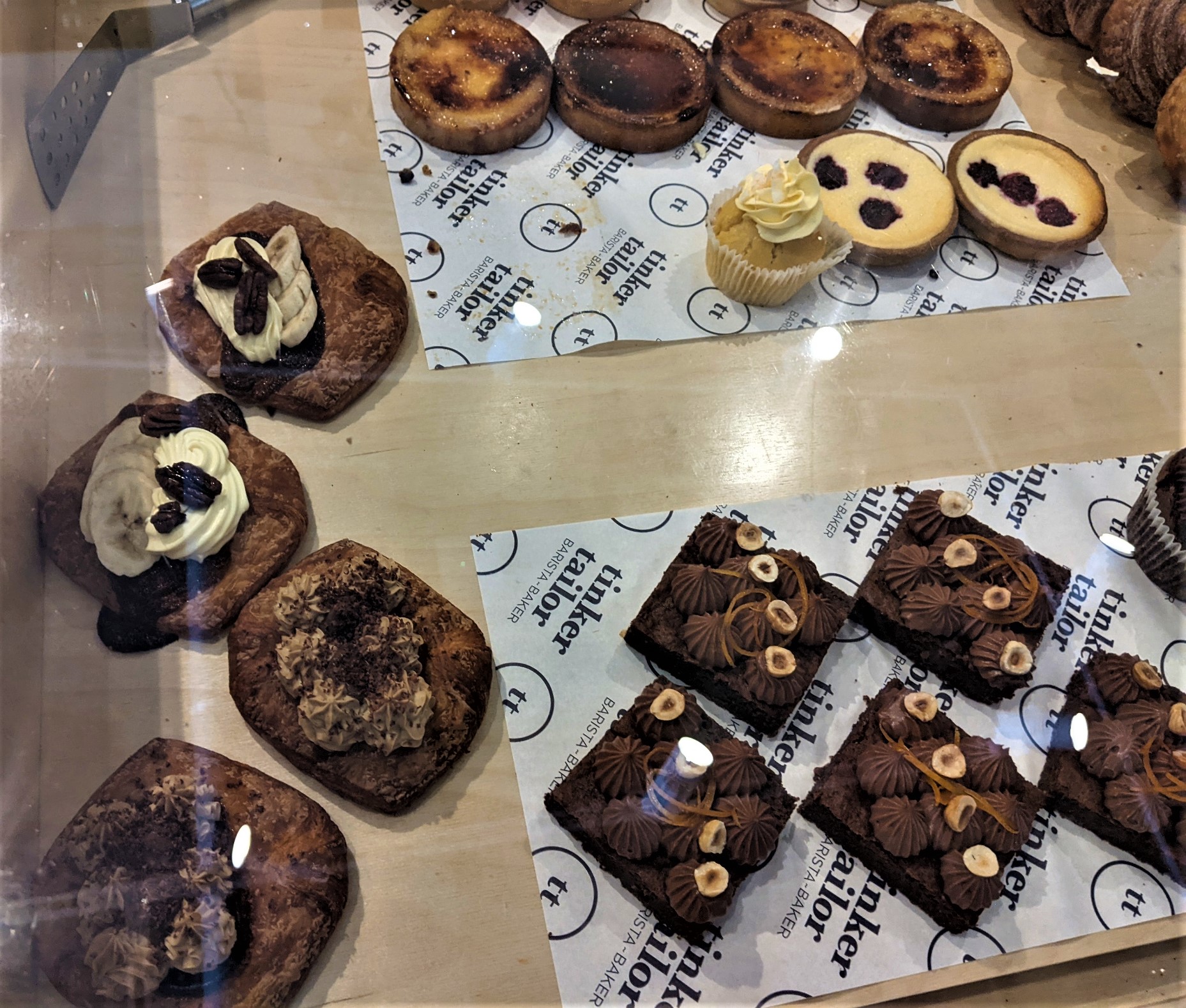 Tinker Tailor is a pleasant venue at the Jameson shops, adding to the variety of eating places there. There is an outside section, not glamorous, but well patronised in warmer weather. The staff are excellent – friendly, efficient and helpful. My smoked salmon bagel, gently warmed rather than squashed flat as so often happens, was fresh and flavoursome; the sausage roll with its generous, tasty salad was, I understand, delicious. Certainly the pastry looked crisp and attractive. Pastries and bread are baked on the premises.