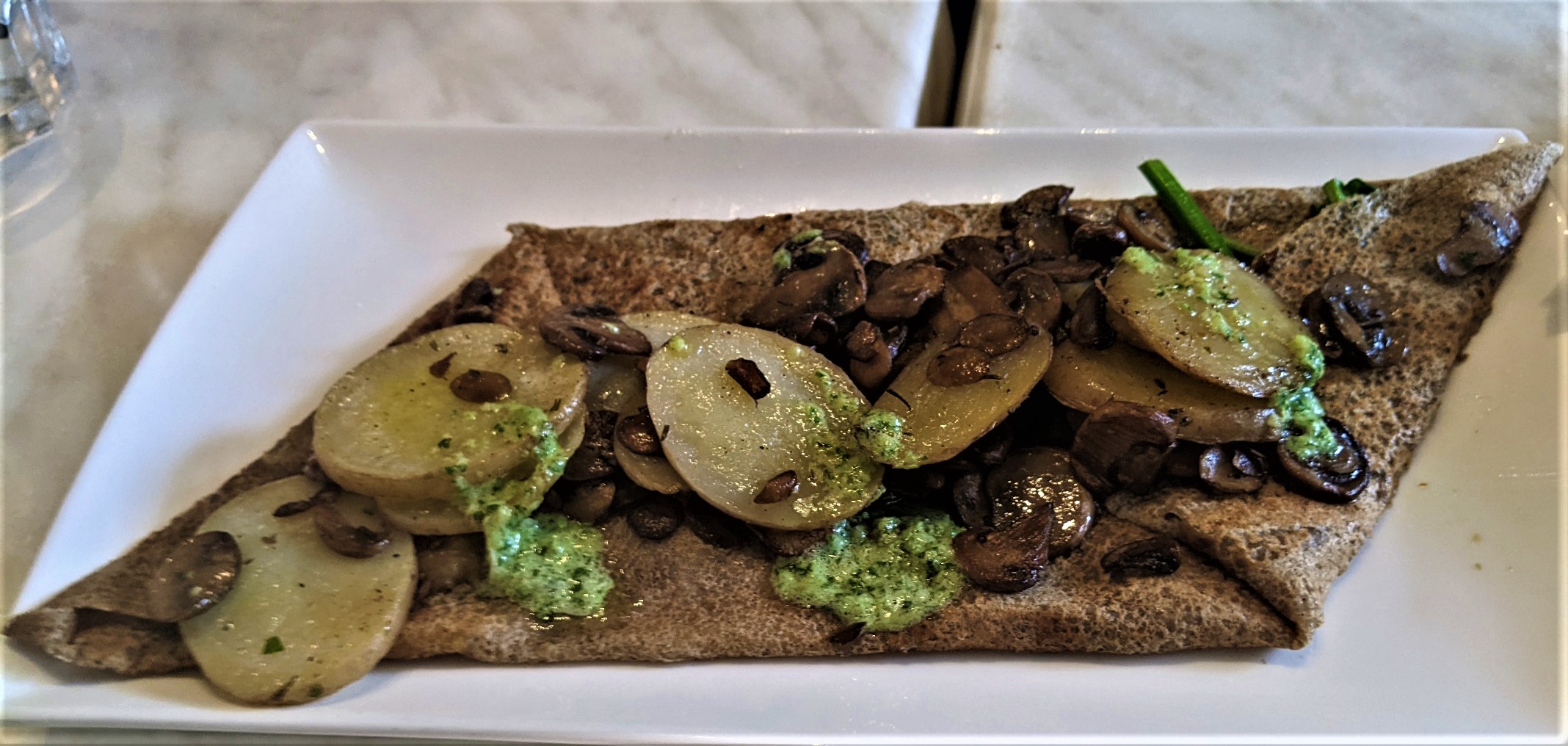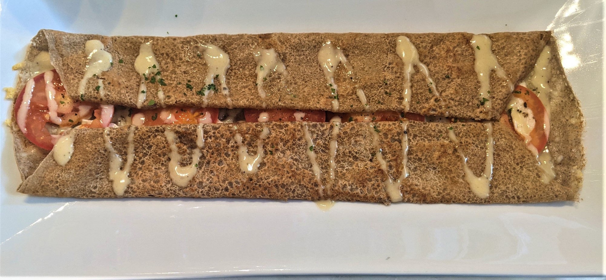It was lovely to introduce people to Breize under the new owners, after having had an excellent meal there a week ago. This time we sat inside, where it was warm and comfortable. However, despite it being cloudy plenty of people, some with their dogs, enjoyed the outside seating as well. We chose gallettes and omelettes, and coffees for our brunch. My ‘special’ , chicken, tomato and a delicious sauce in a buckwheat gallete was excellent, and the side salad was fresh and generous. Other dishes were the potato omelette, a splendid strawberry gallete and a generously filled mushroom gallete. There was a slight glitch in regard to timing , but this was caused by illness limiting the available staff. This was explained and apologies were made – once again, I felt, what lovely staff.