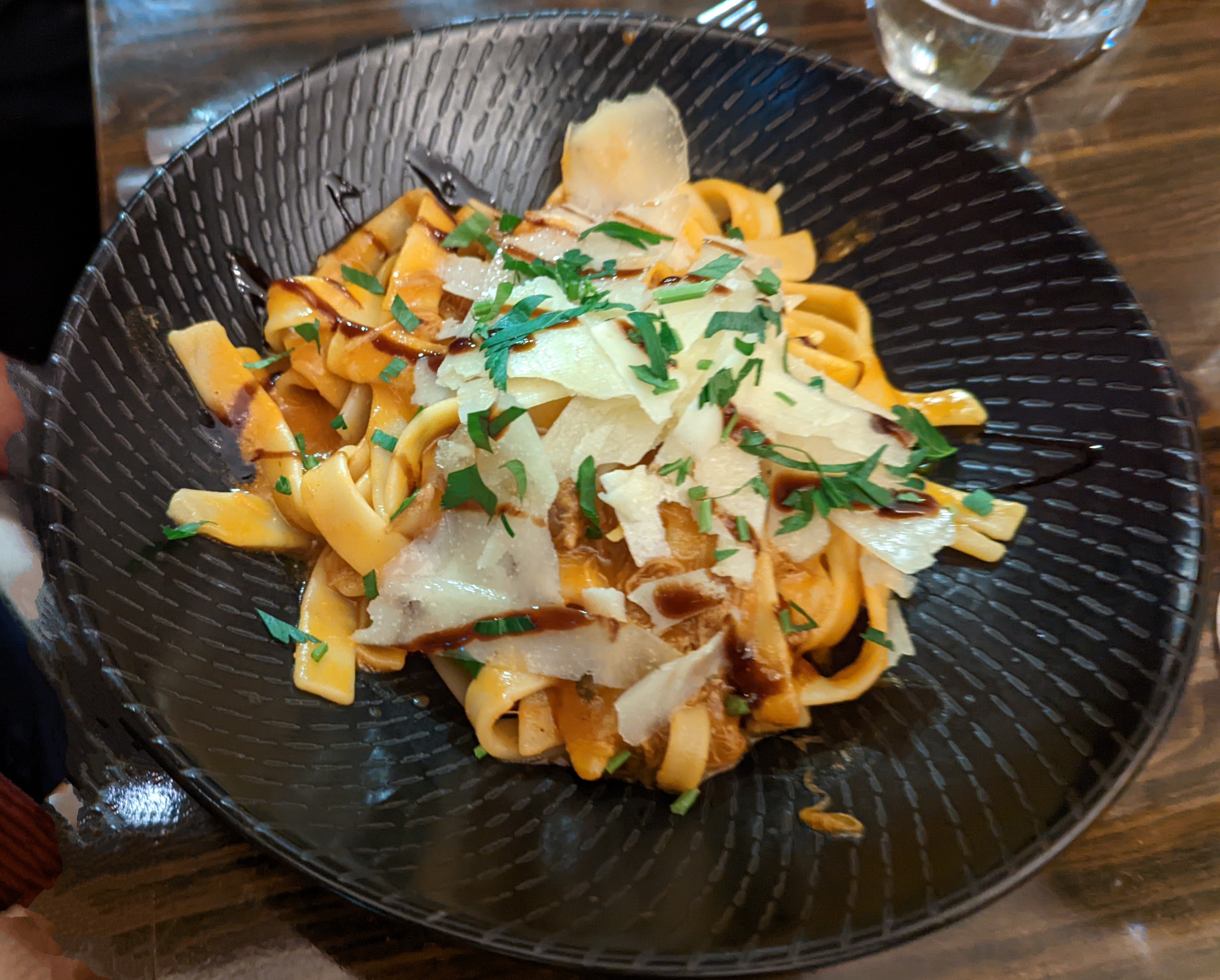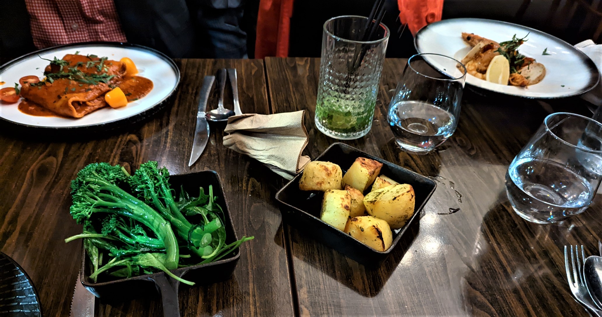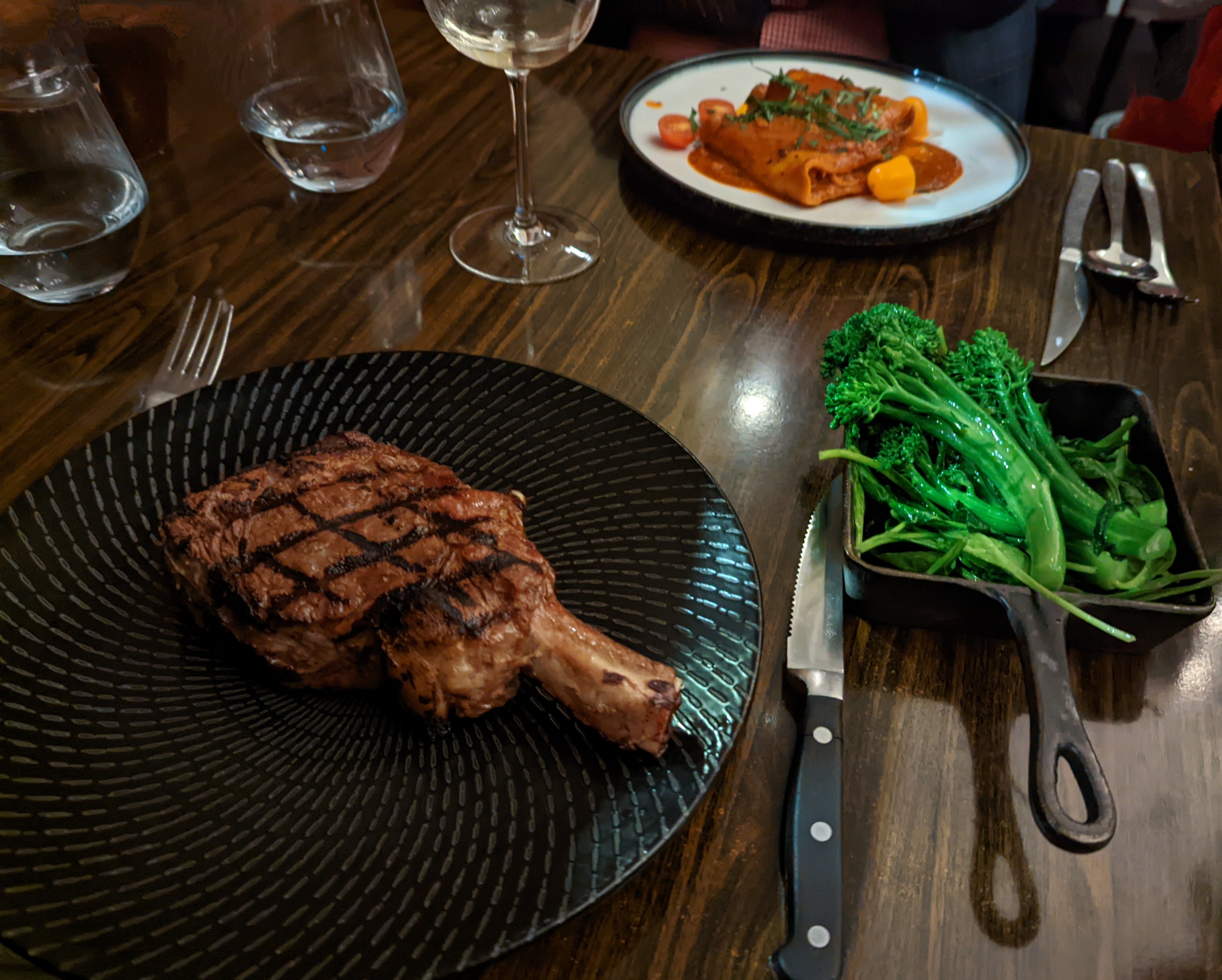 I ordered my usual crab stuffed peppers followed by prawns. Both were as delicious as usual. However, I was fortunate enough to be offered a taste of the haloumi in the salad in which succulent haloumi pieces were accompanied by shaved parsnip and slices, beetroot slices, fresh rocket and two delightful sauces. I might have to change my order next time. The other new dishes were two flavoursome pastas and a nicely cooked rib eye. This was accompanied by a side of greens – delicious – and we ordered the wonderful roast potatoes as well.