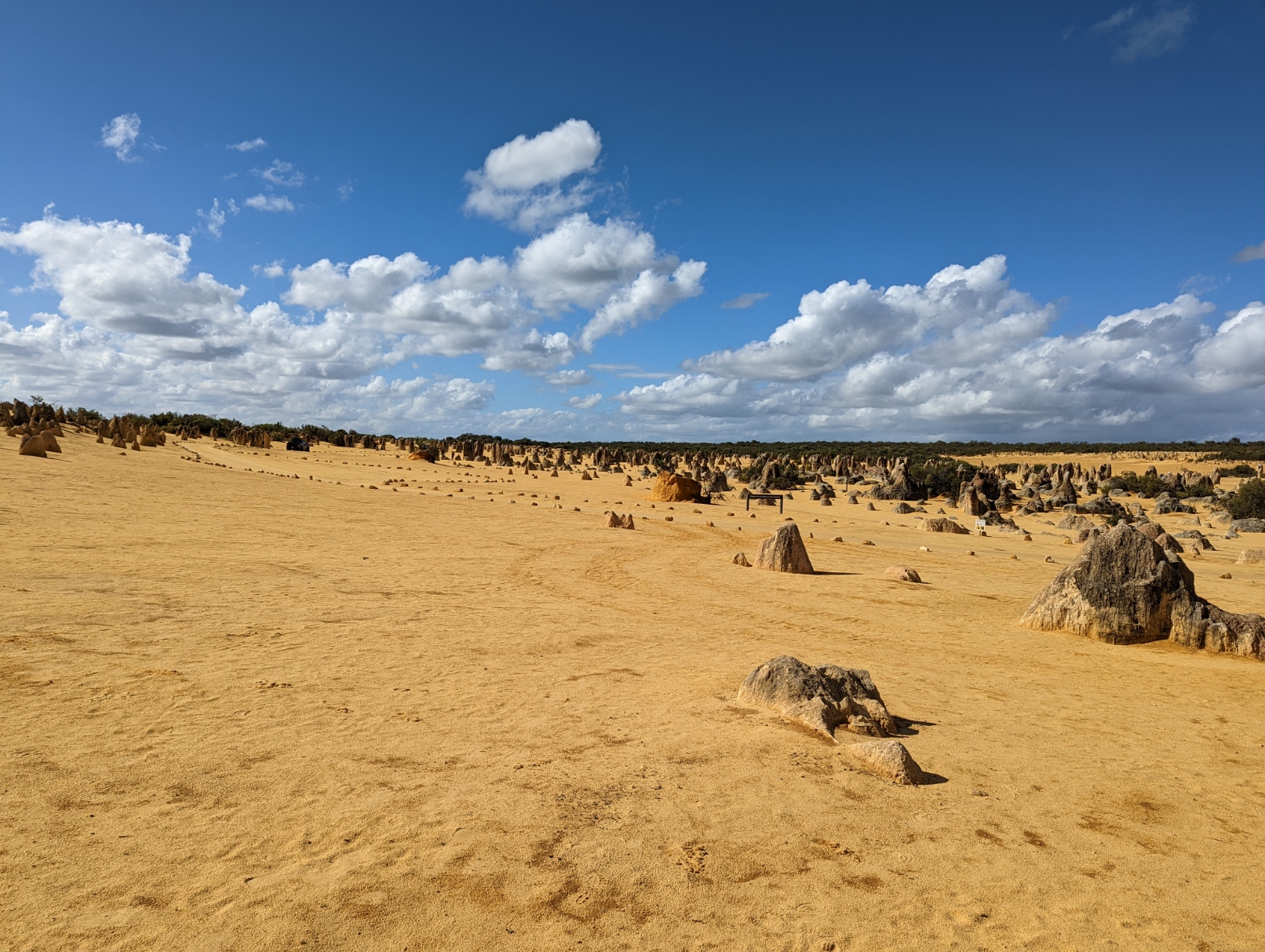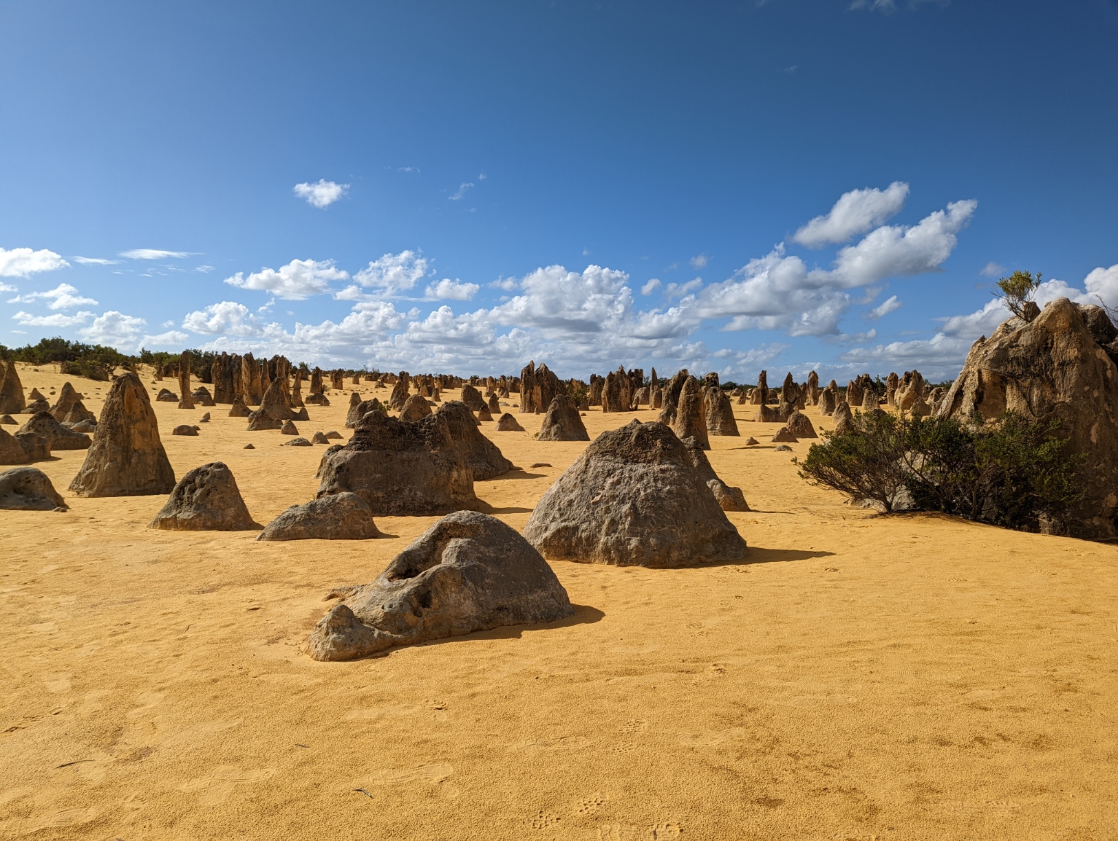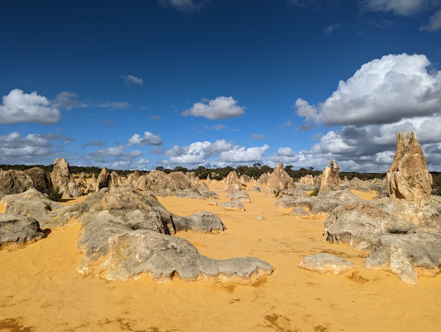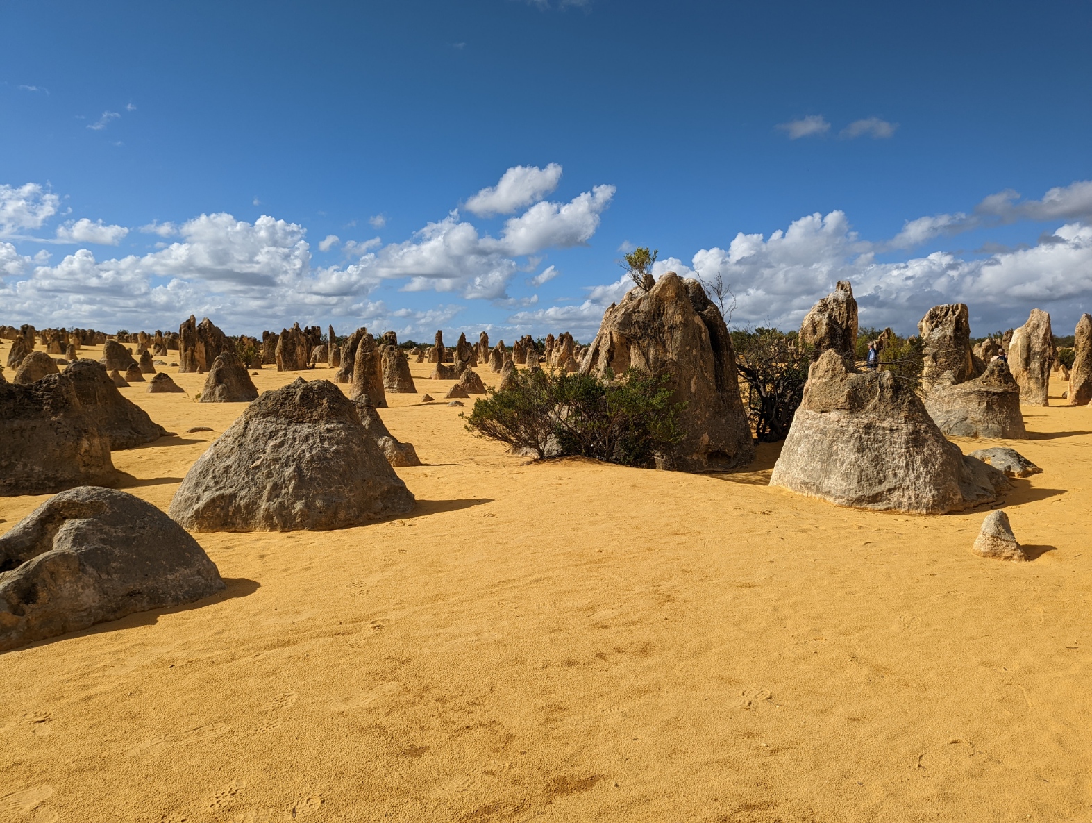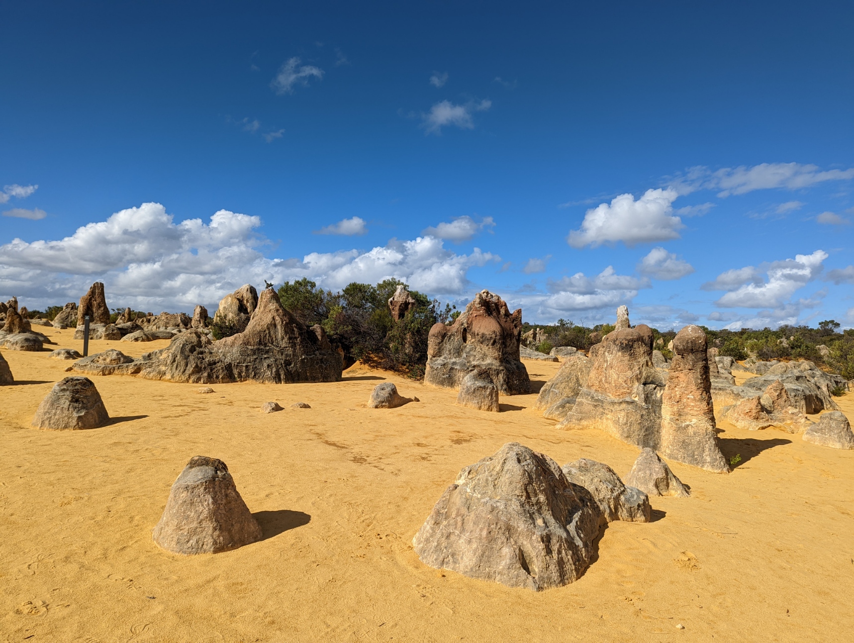 The Pinnacles tour included lunch at a lobster catching facility, and an amazing walk through the thousands of weathered limestone pillars. Wikipedia tells us: Some of the tallest pinnacles reach heights of up to 3.5m above the yellow sand base. The different types of formations include ones which are much taller than they are wide and resemble columns—suggesting the name of Pinnacles—while others are only a meter or so in height and width resembling short tombstones. A cross-bedding structure can be observed in many pinnacles where the angle of deposited sand changed suddenly due to changes in prevailing winds during formation of the limestone beds. Pinnacles with tops similar to mushrooms are created when the calcrete capping is harder than the limestone layer below it. The relatively softer lower layers weather and erode at a faster rate than the top layer leaving behind more material at the top of the pinnacle.