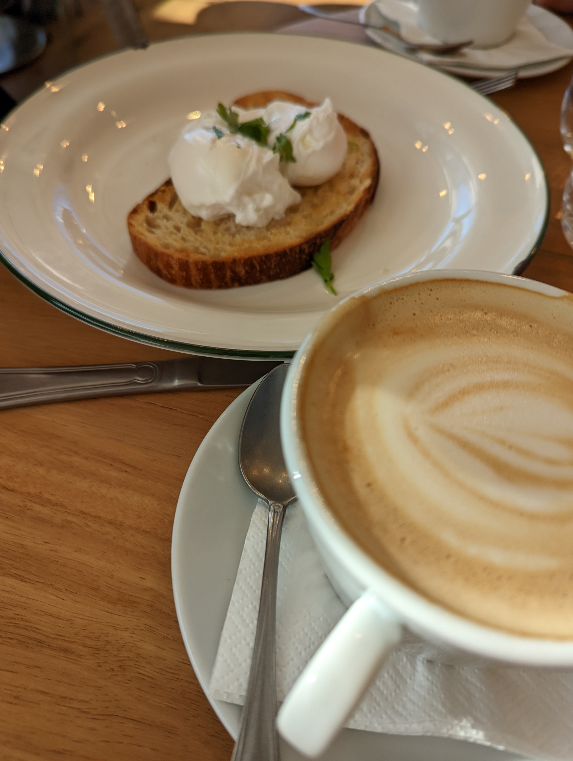 My fritters with salmon and additional pleasant flavours were good. However, the eggs were overcooked, as they were on my friend’s dish of poached eggs. The coffees were generous and exactly right.