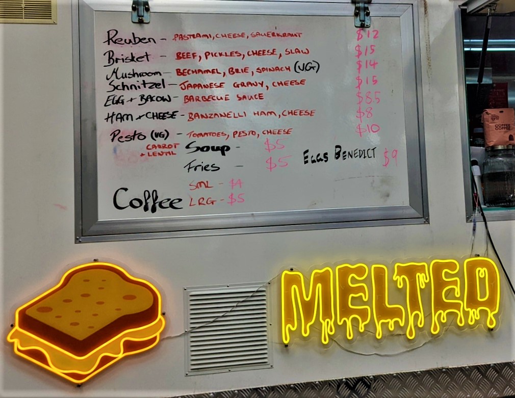 Melted is a relatively new caravan eating place in O’Connor. It has always looked as though the customers, seated at wooden tables under umbrellas, were having fun. We decided to join in on a grey Canberra day when we just wanted a coffee and something simple to eat. We enjoyed ourselves. My friend had a tremendous toasted melt, full of savoury beef, cheese, pickles and slaw . Mine was a little less exotic – tomato, cheese and pesto, but also really delicious. The coffees were good. Service was friendly and efficient.