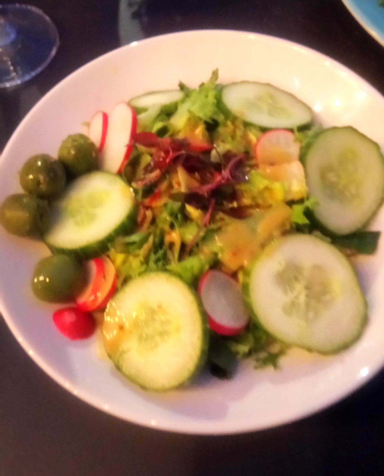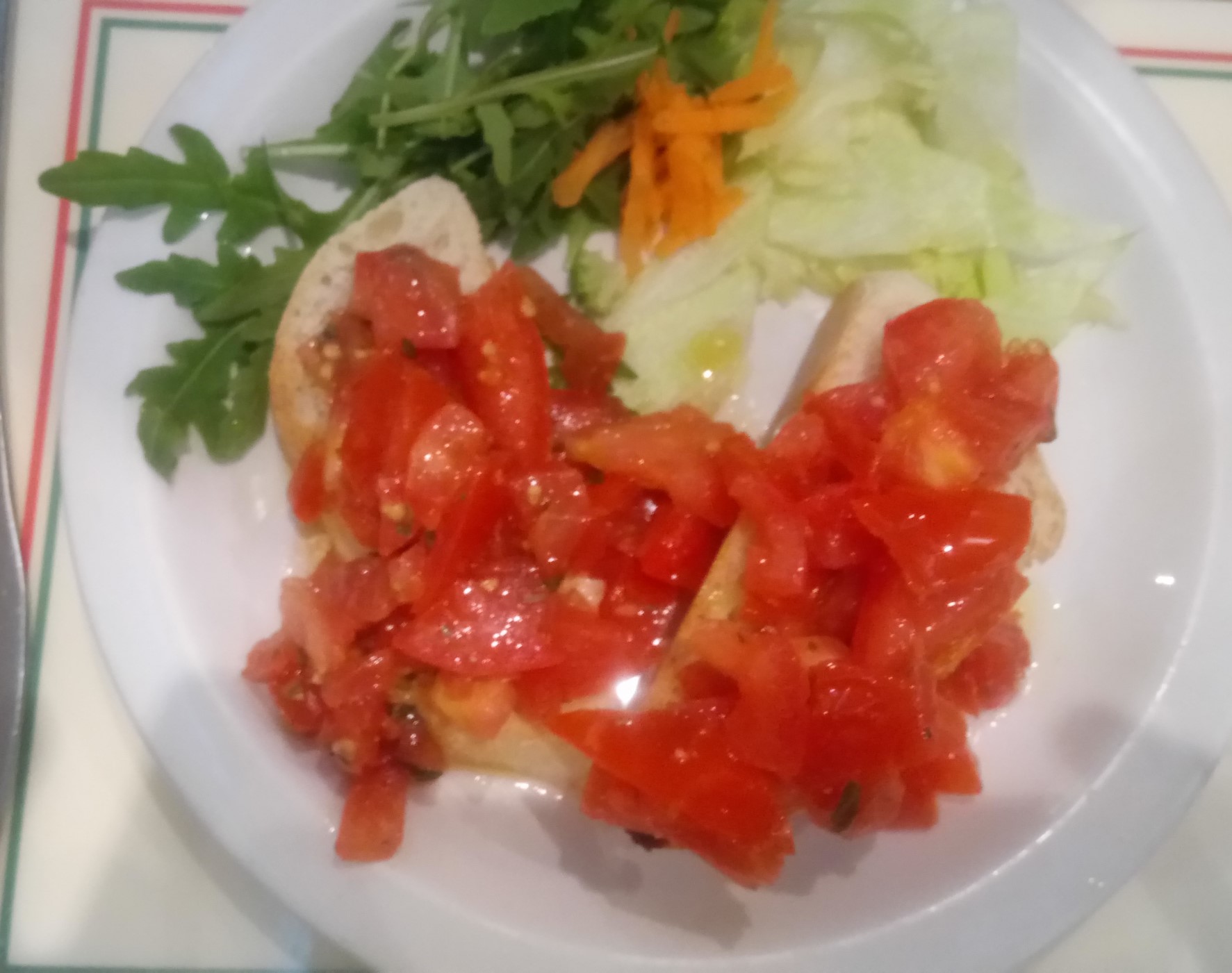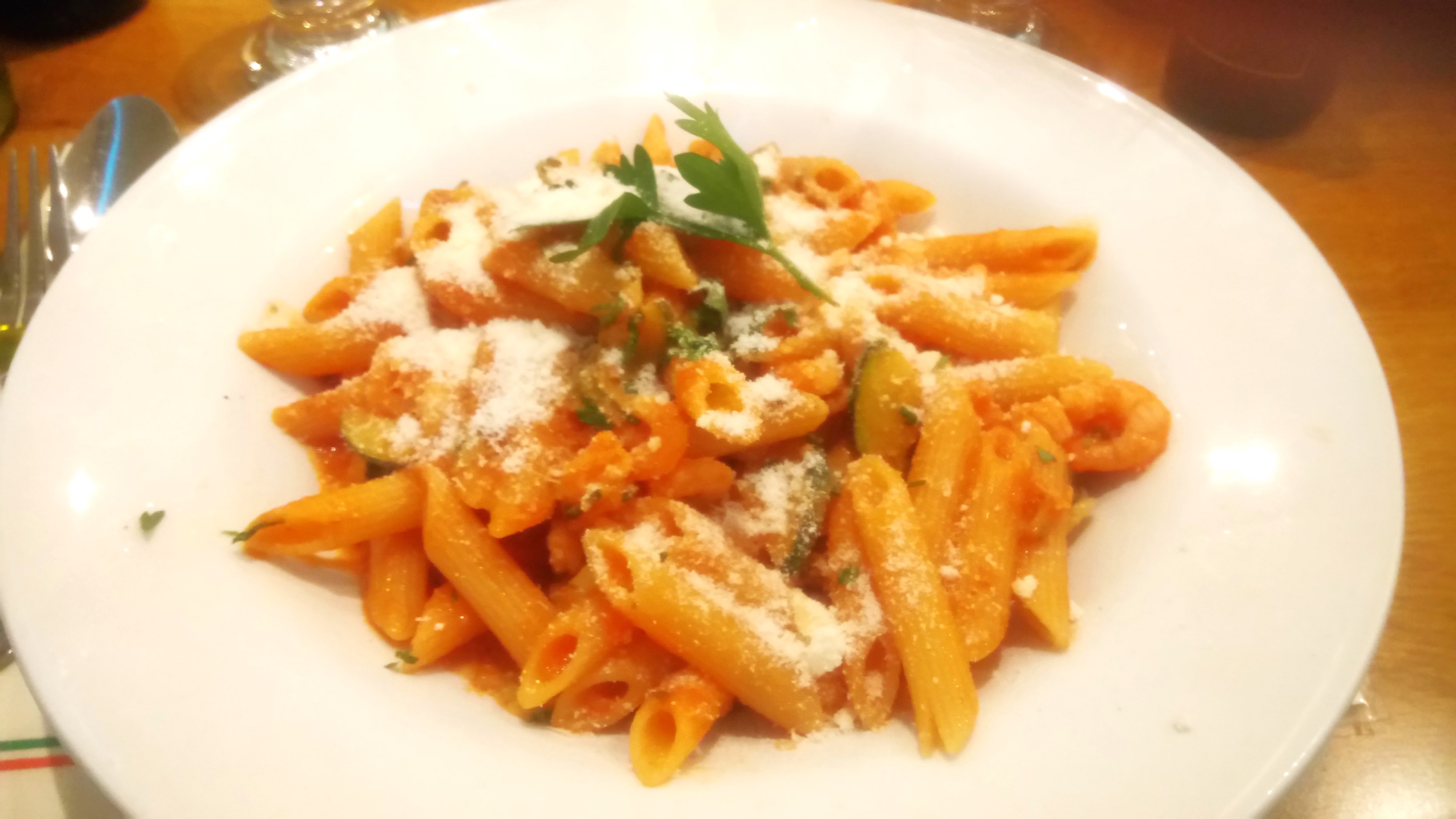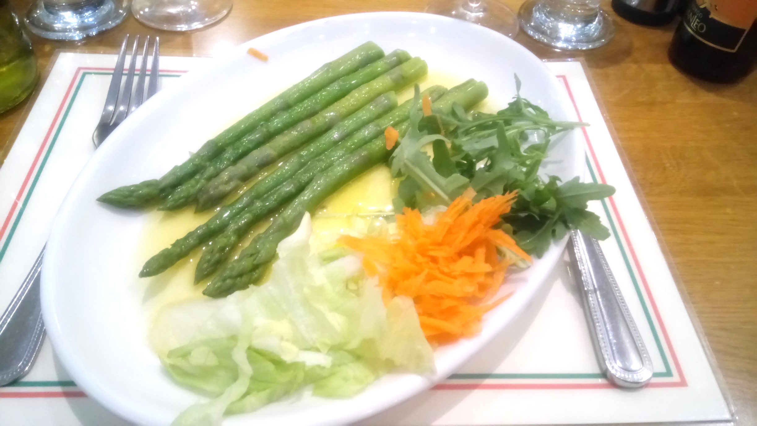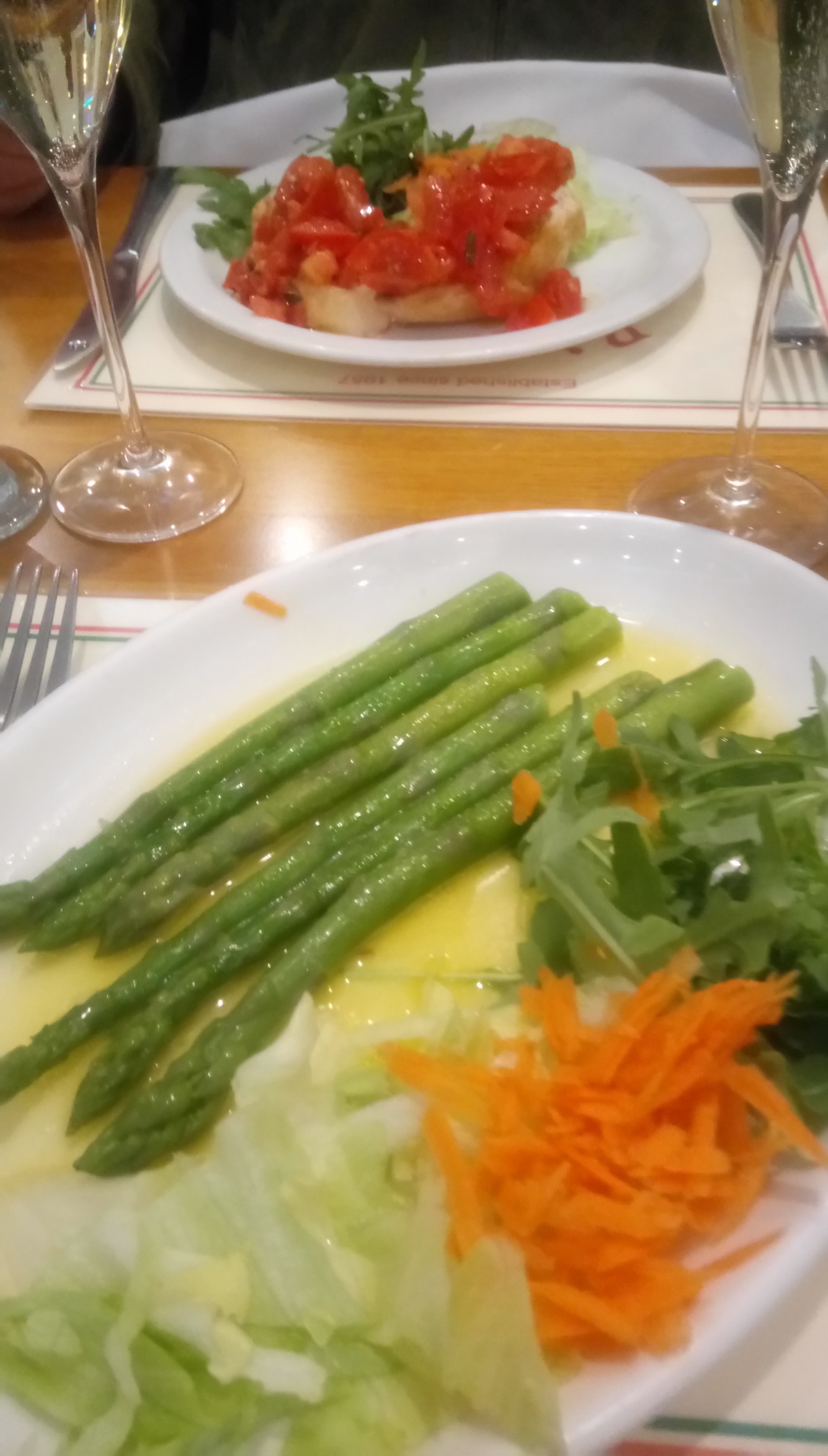 The starters were excellent – bruschetta with piles of fresh tomato and basil, and the most delicious buttered asparagus. The main courses, both pasta, were generous and flavoursome. Mine, with prawns, not large, but numerous, was particularly full of flavour. The green salad was fresh, plentiful, and varied – rocket, iceberg, tomato and cucumber. Balsamic and oil were provided. This was a lovely meal, and although no pasta seems to reach the heights of that I had in Italy, it was nicely cooked.