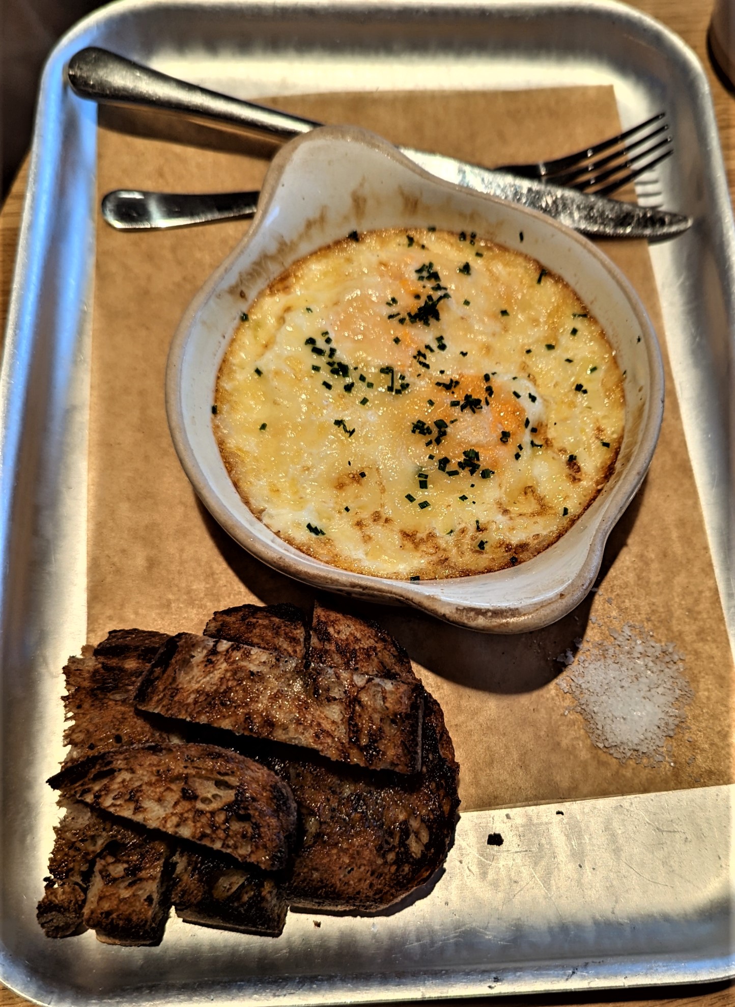 There is seating inside and out, but on a chilly London morning we chose to be inside. There is a vast array of luscious looking cakes and pastries, including the rather magnificent chocolate bread. We chose savoury this time – baked eggs and rye toast, and avocado on rye with a side of smoked salmon. Booth meals were excellent – flavoursome, a reasonable portion, and served attractively.