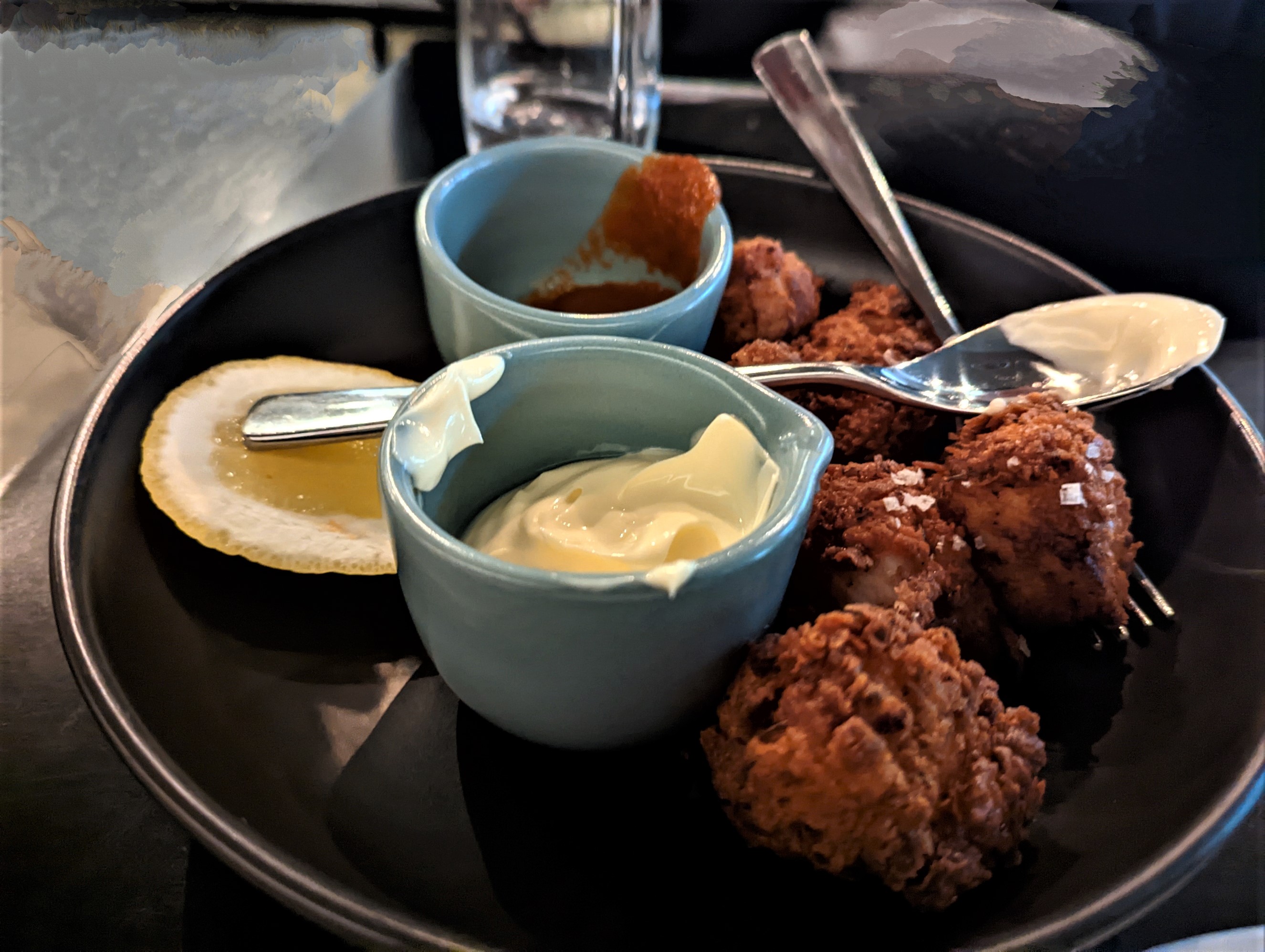 All of the dishes were delicious – the charred corn is a scrumptious starter, although a bit messy to eat. But it is worth it. Next, we were served the fried chicken which comes with two sauces- one a pleasant aioli, and the other a sauce with a fiery bite. The cauliflower is a Moroccan dish, and again, an excellent choice. As usual, we had the pumpkin ravioli with burnt butter sage sauce – and as usual, the only pasta better is that served in Bagni di Lucca on my holiday there. No dessert! No coffee! And a relatively brisk (no dog to potter) walk home.