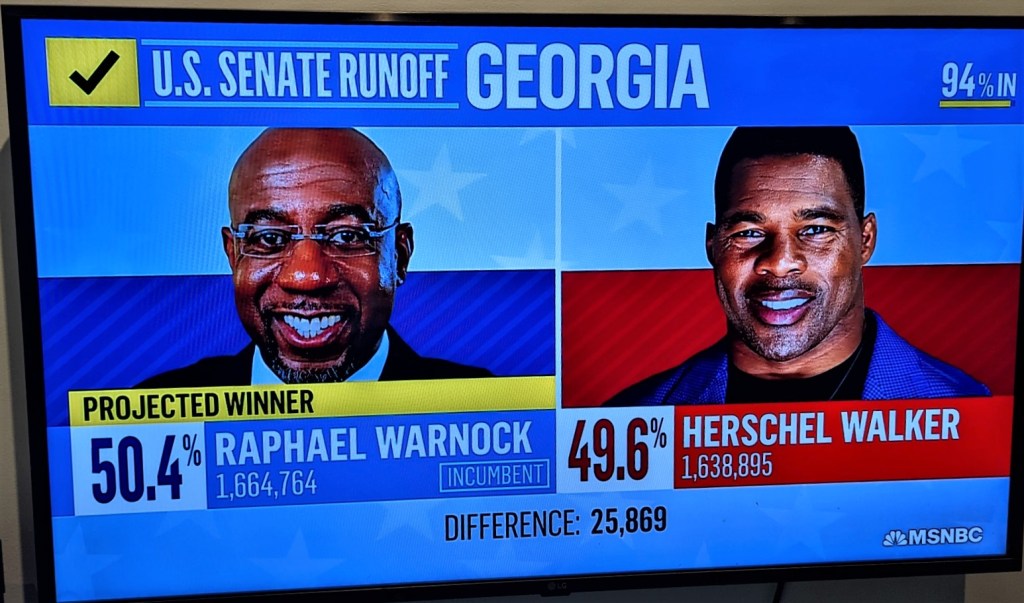 Late news today: Warnock wins in runoff in Georgia – again, and the numbers keep rising for Warnock to an increased margin from his previous vote in the Mid Terms. Warnock’s winning margin is now nearly 100,000 votes. That is, more than he won by in 2020 runoff.