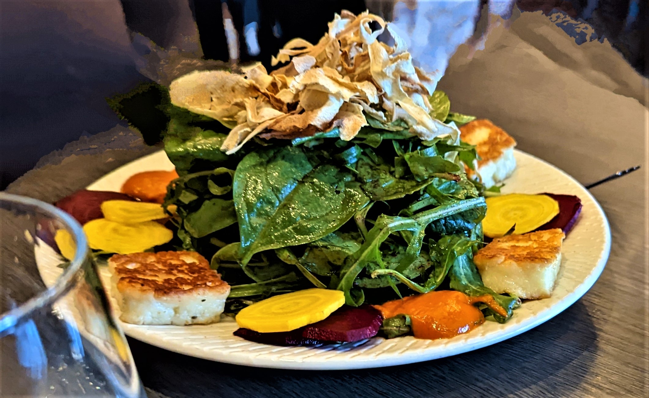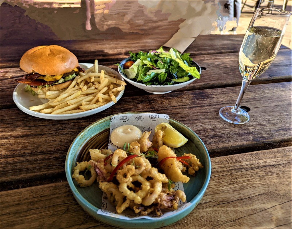 The Duxton serves a variety of meals, and I have found that I prefer the snacks to the main courses. The Calamari is succulent, lightly battered, and not a smidgin of old tyre about it! The dish is reasonably generous, served with a portion of lemon, and aioli. The green salad I ordered with it, is resplendent with crisp lettuce, cucumber, tomatoes and thinly sliced red opinion with a very light dressing. The cheeseburger enjoyed by my companion is served with chips and is generous with plenty of salad. There is also a large portion of bacon, some of which went under the table for the dog. With a Sav. Blanc for one, and prosecco for the other, this was an enjoyable light meal on a warm Saturday evening in Canberra.