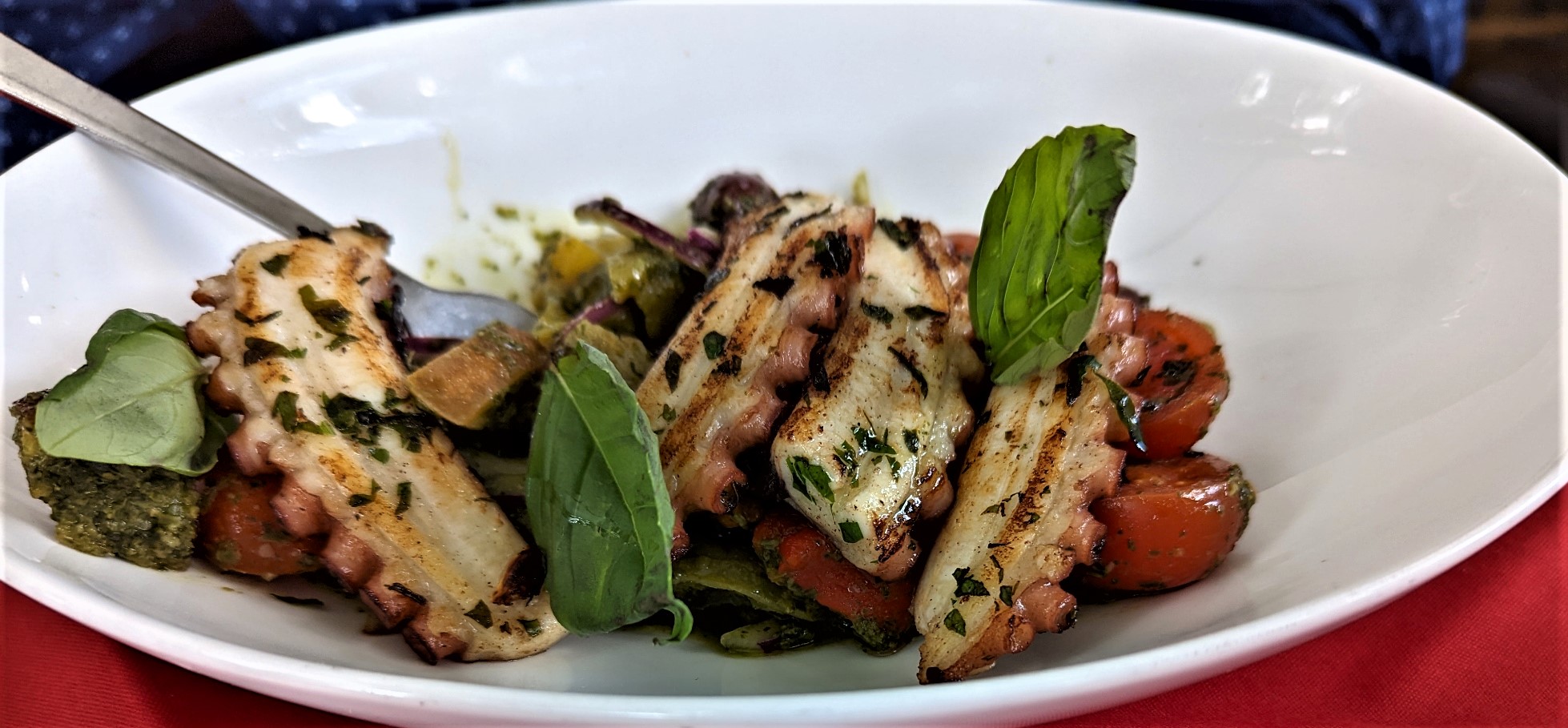 The food was a mixed pleasure. It is always nice to be served warm rolls and oil, and this is a pleasant feature of The Italian Place. I enjoyed my prawns, although I found them a little over cooked. One friend found the pasta dish with sausage was flavoursome, although the sausage was hard to find at first – it is generously smothered with a delicious sauce. The octopus was good, but the salad underneath disappointing for another friend. The stuffed zucchini flowers needed to be far better. The nectarine salad was excellent, although unfortunately I do not have a photo of it – perhaps we all leapt to demolish it before I remembered to take the photo! Coffee was very good indeed.