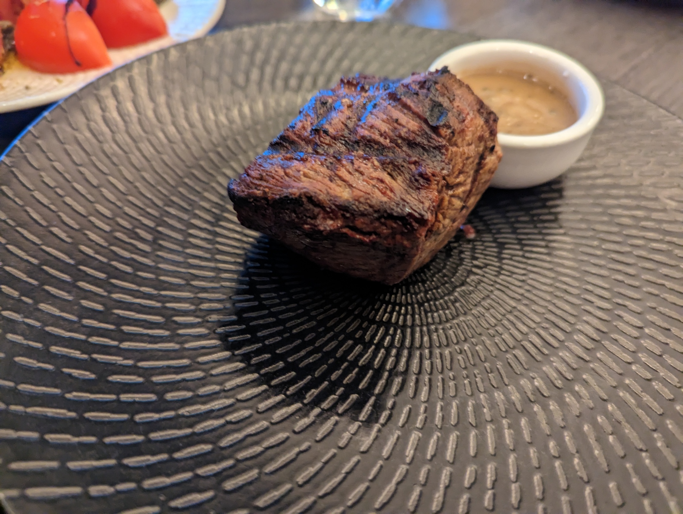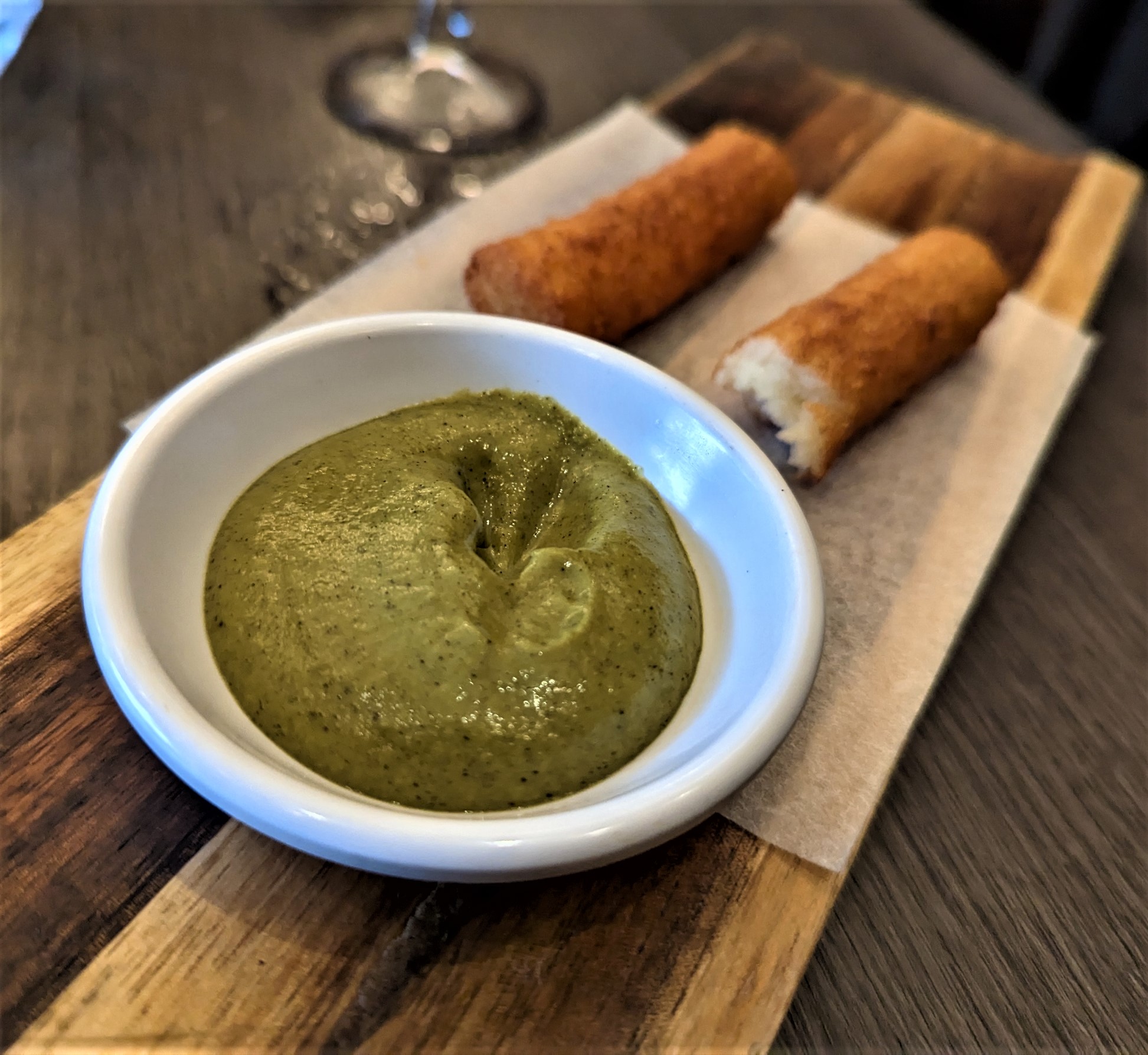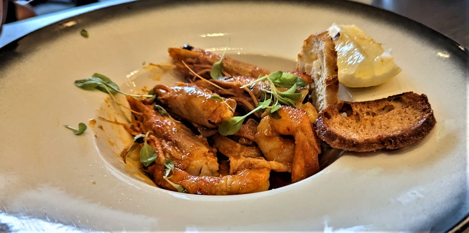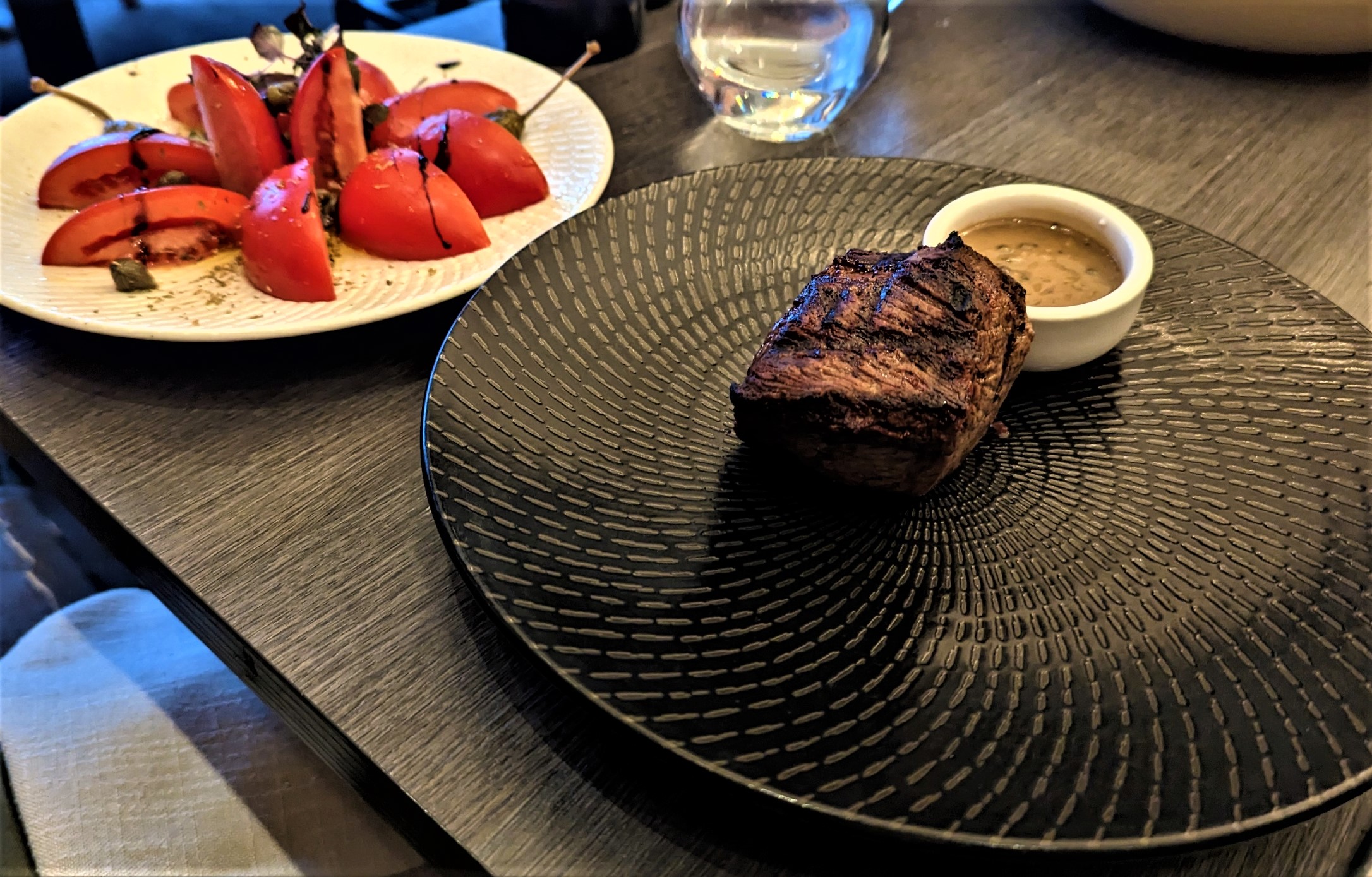 It’s always pleasant to try something different, and this time I did not have my crab filled red peppers followed by the chili prawns. There were four of us and we began with Spanish olives, which were accompanied by crisp slices of toasted crusty bread, and anchovies; and the delicious Pan Tumca – bread with a fresh tomato topping. A mushroom dish, the goats cheese churros and prawns made light entrees. The puttanesca pasta was nice, but not as silky as I would like, although the sauce was very good. Another pasta, a hearty Maltagliati, made a delicious meal. Butifarra Blanco is a Spanish sausage dish, served with a generous portion of mushrooms. The steak was cooked to order and served with a side of choice – on this occasion a fresh tomato dish with capers.