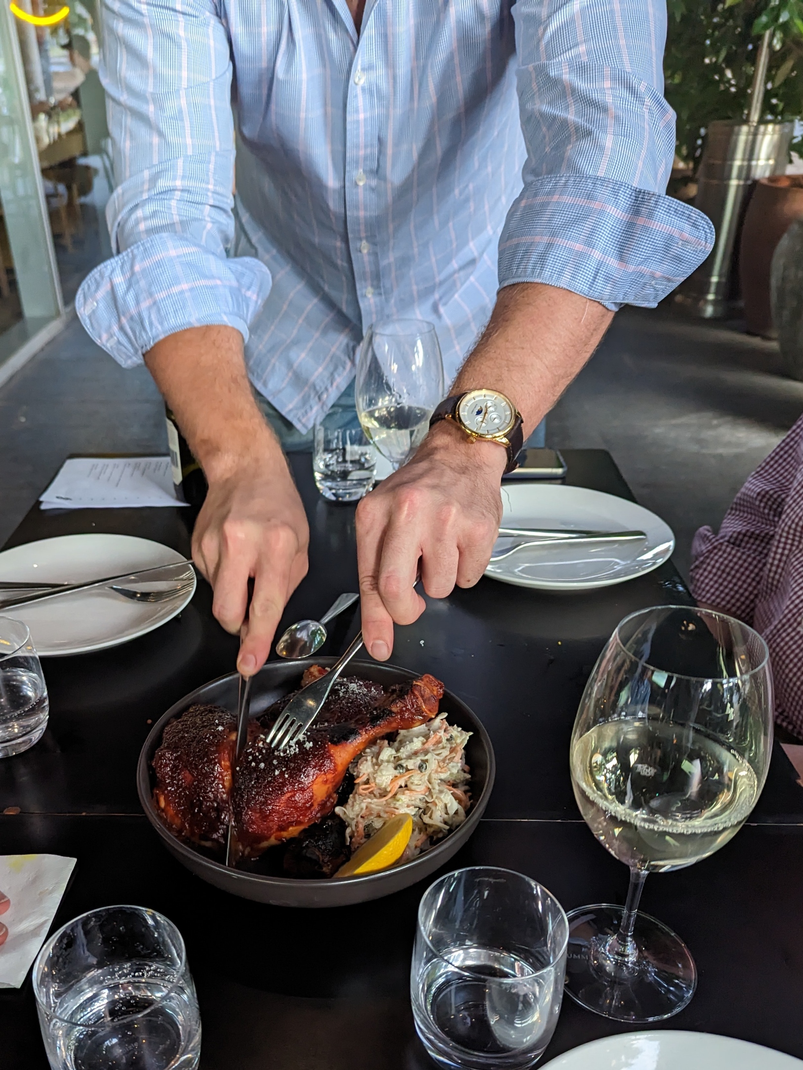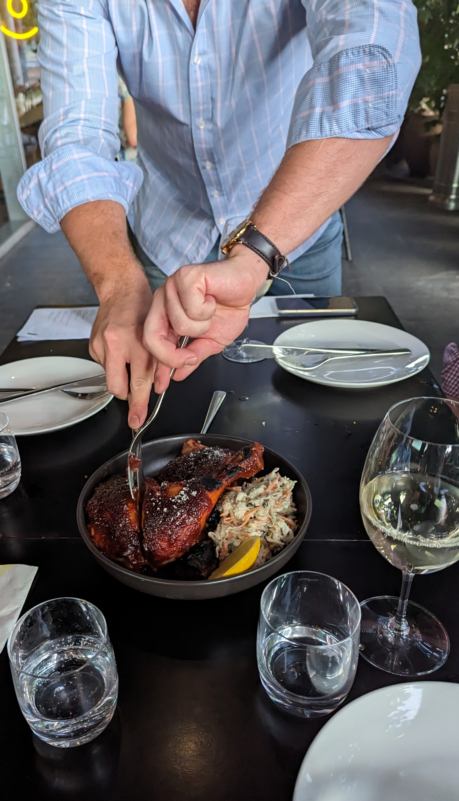 We were able to try two new dishes, along with the always popular corn cobs in a delicious sauce, with parmesan and cilantro. Yes, these require a napkin around the neck, giving up on looking sophisticated, and a firm intention to enjoy them whatever the consequences to face and image. They are worth it. The new dishes we tried were the tuna ceviche and the black chicken with buttermilk slaw. And for dessert, we shared the child’s favourite (mine), Carmel Popcorn Sundae with the sophisticated Frozen Margarita. They were a winning combination.