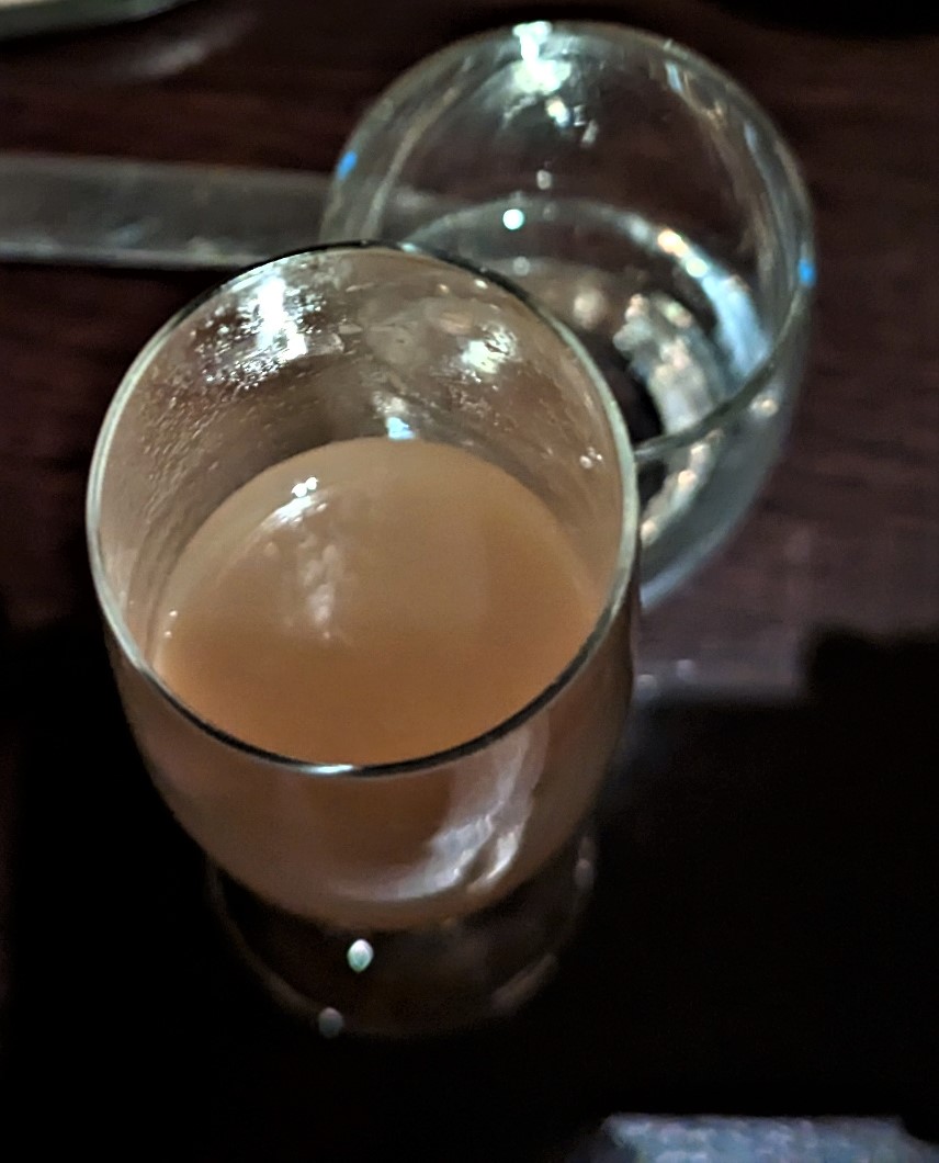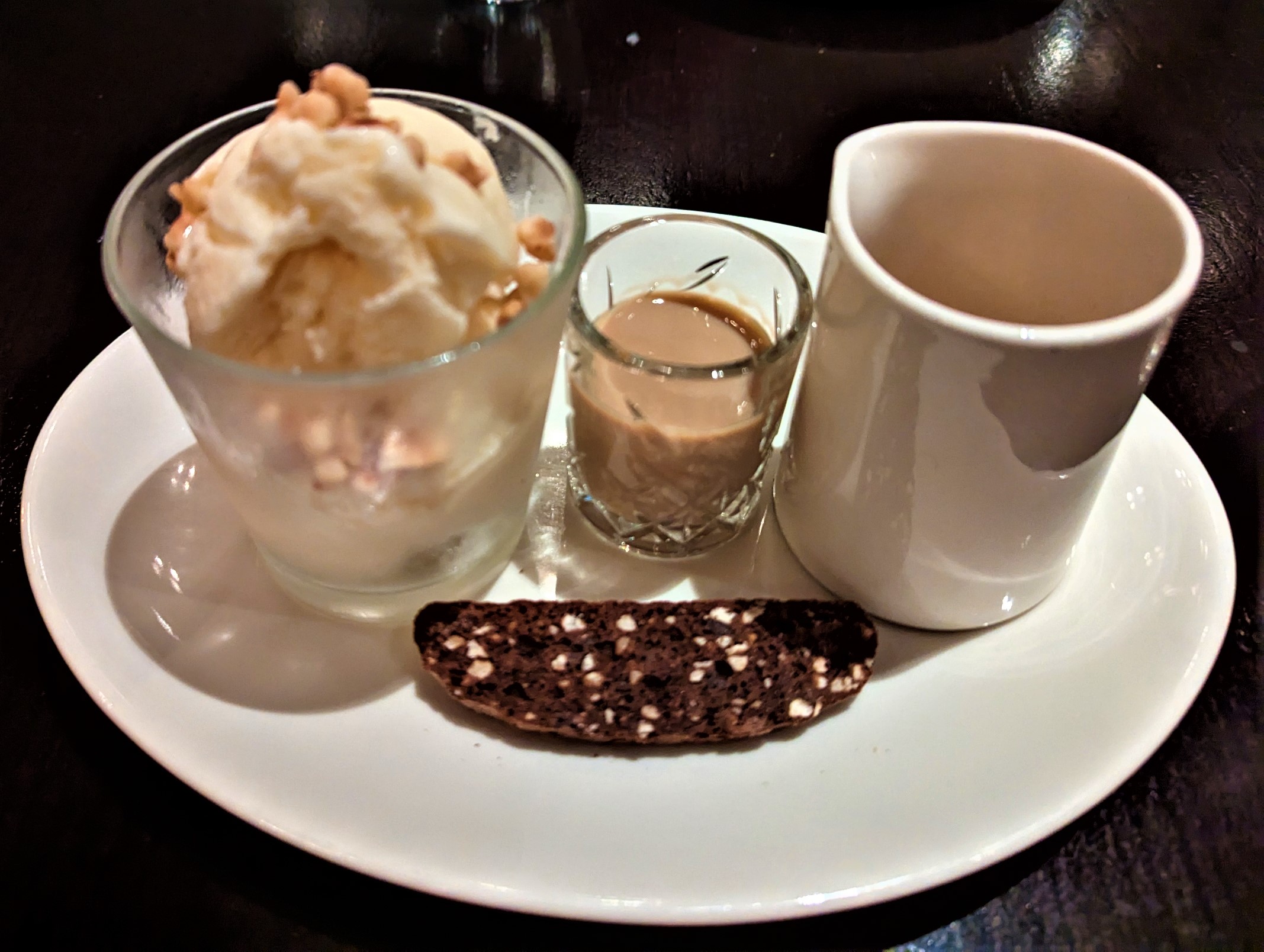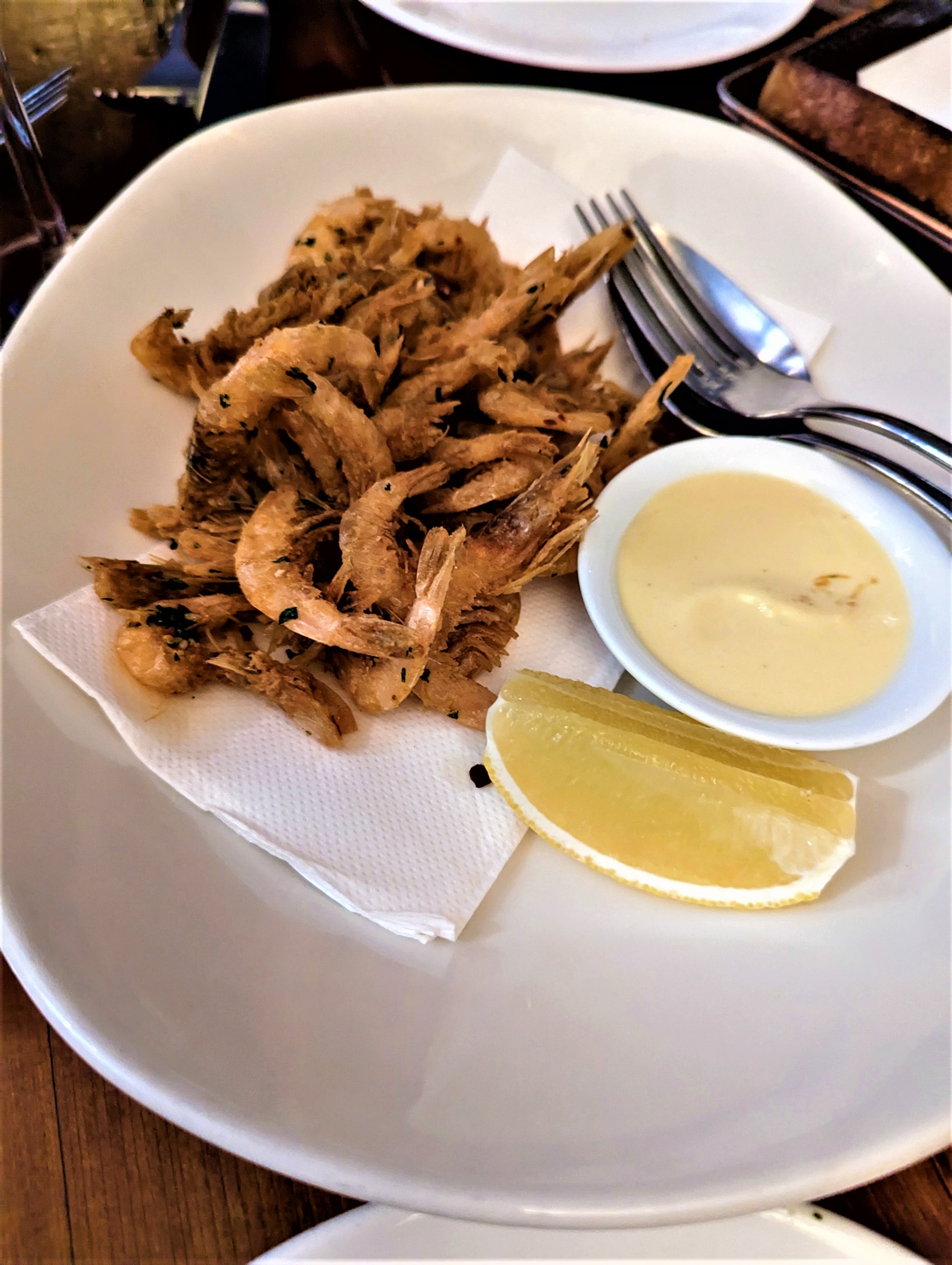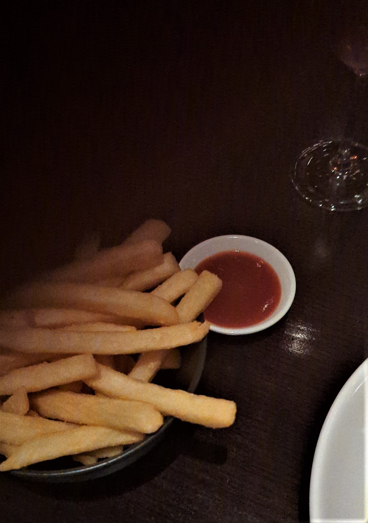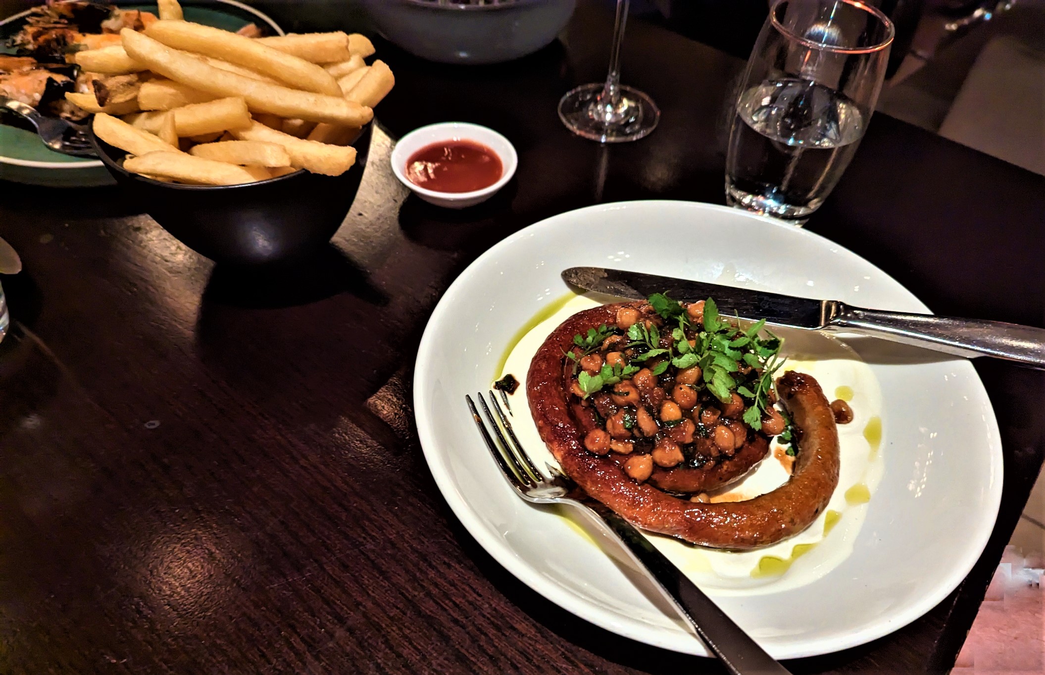 Eating here is a delight. I recall a magnificent breakfast last time, and this meal late at night after a fruitless search for something simple, was really enjoyable. The something simple was fulfilled by the chips – served with tomato sauce! The succulent prawns I had been hoping for on an earlier occasion eventuated here. Served with a crisp salad with just the right amount of dressing, they were delicious. Sausages with chickpeas completed the savoury part of the meal. The drinks and desserts were excellent.