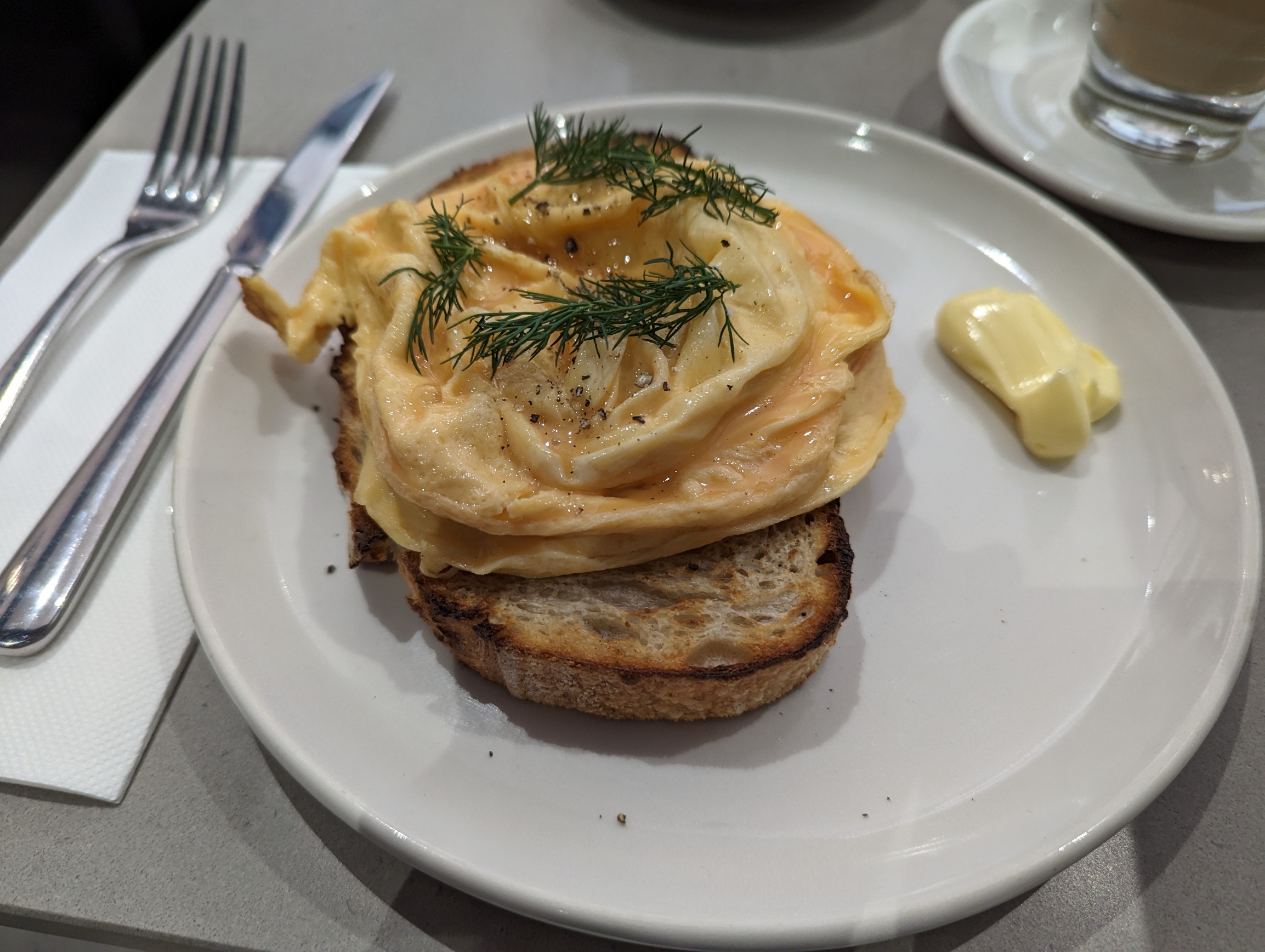 This is a pleasant coffee shop, with pastries, and breakfast and lunch menus. The coffee is very good, and the meals generous. The folded eggs were served with dill and black pepper. They needed the pepper, and I shall try another of the offerings on the menu next time. The service was friendly and efficient. On a warmer morning the outside seating would have been terrific. However, inside was not too noisy and the seating is comfortable. I would return to this coffee shop on another occasion.