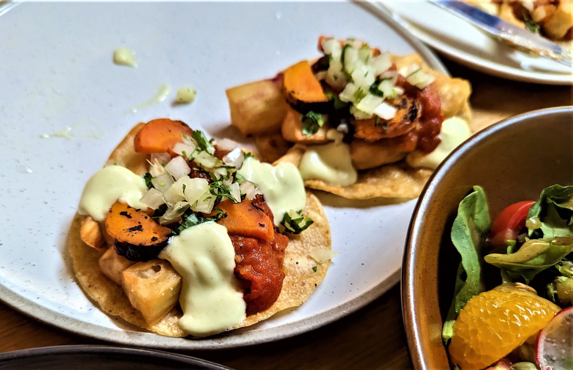 The menu is interesting, not overwhelming, and detailed. We chose the sweet potato tacos, a salad with mandarin pieces, and a wonderful pumpkin dish. The latter was half served before I thought to photograph it. This is a restaurant which will be on my list to return to any time I visit Melbourne.