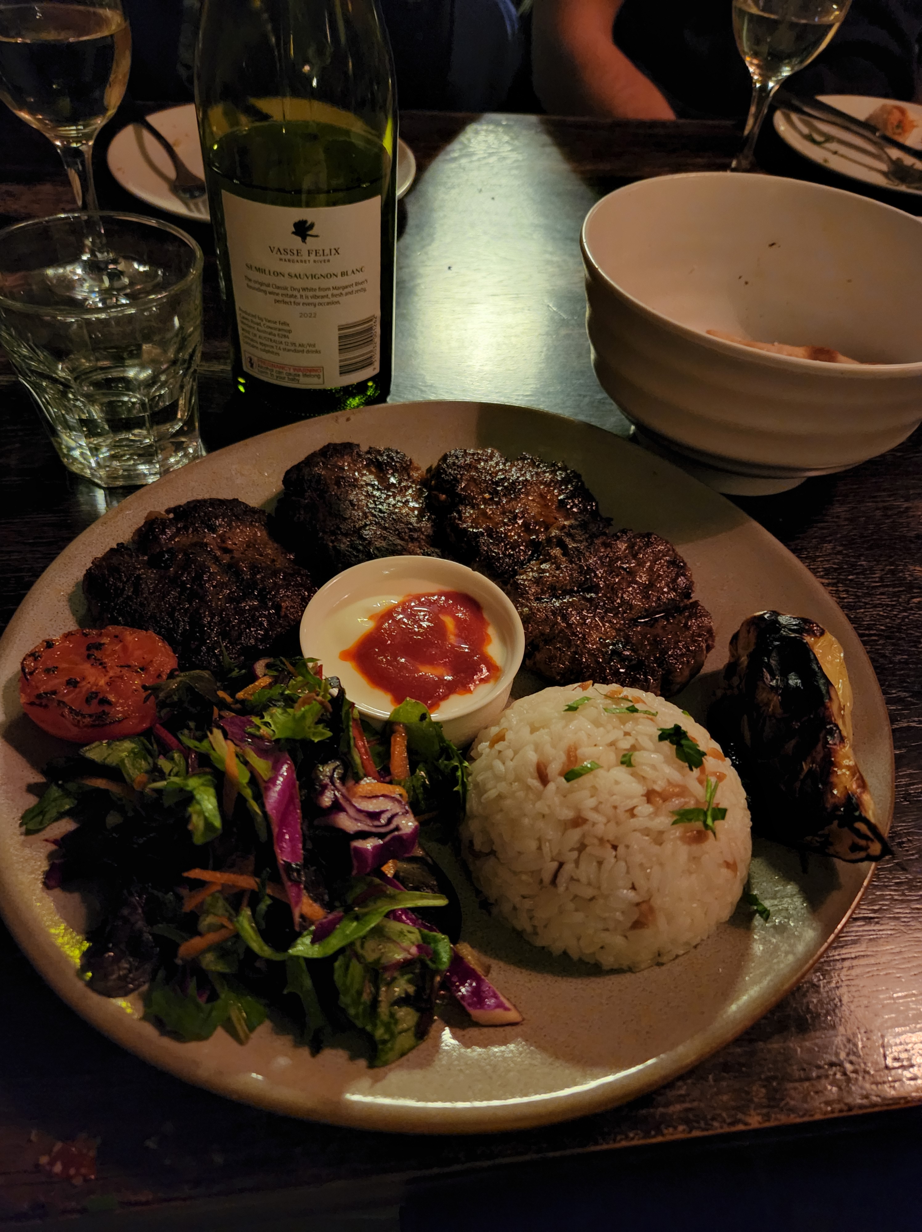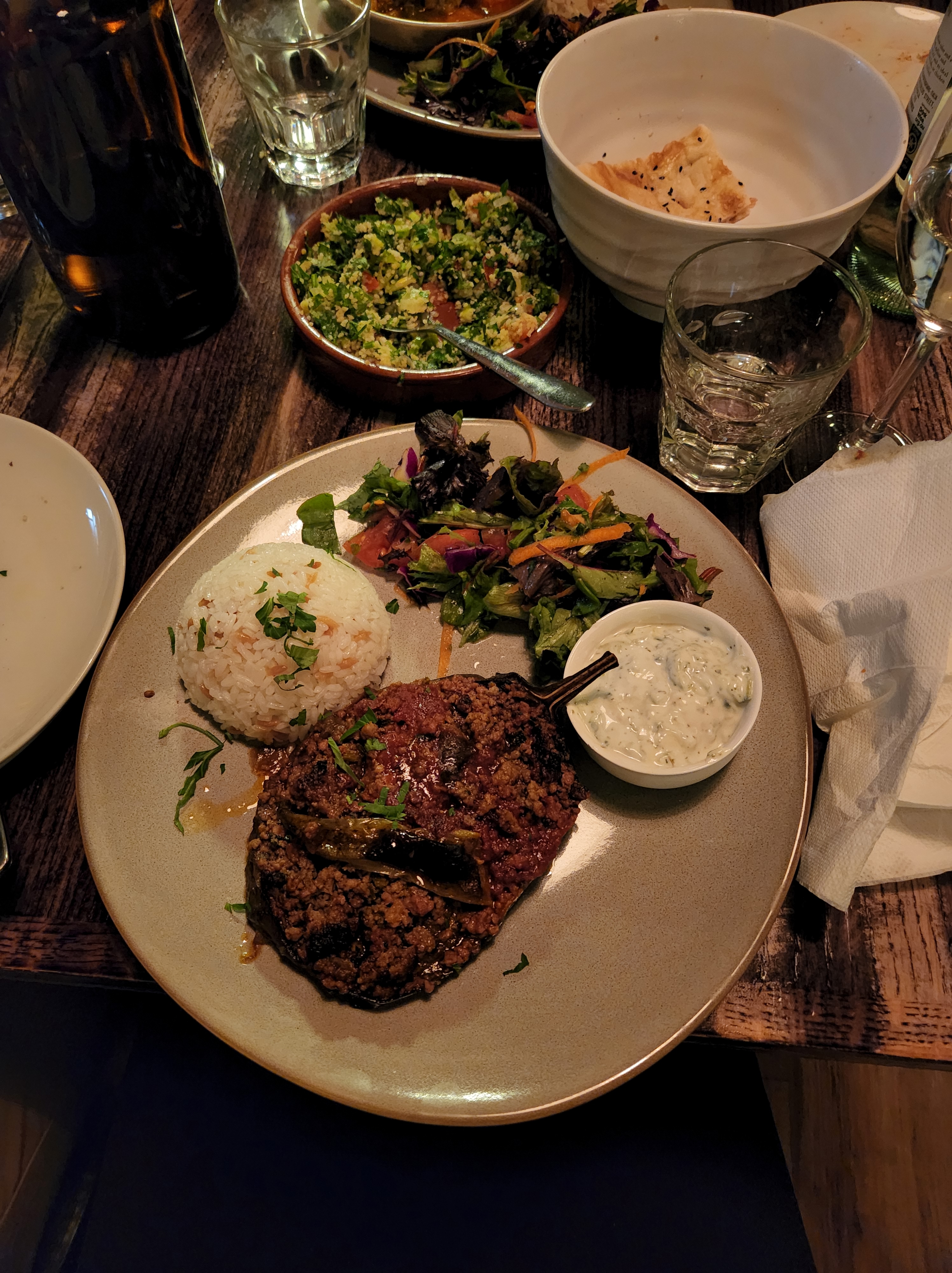 Melbourne friends suggested that this was a restaurant not to be missed if we wanted authentic Turkish food. I have to agree about the baba ghanoush in particular – it was the smokiest I have tasted since being in Turkey. The bread with the five dips with which we began was hot, crisp on the crust and chewy (in the best possible way) on the inside. A truly delightful beginning to a very good meal. The dishes were generous in size and flavorsome. My chicken skewers, not pictured, were beautifully moist and tender. The salad and rice, with a lovely pepper were excellent accompaniments.