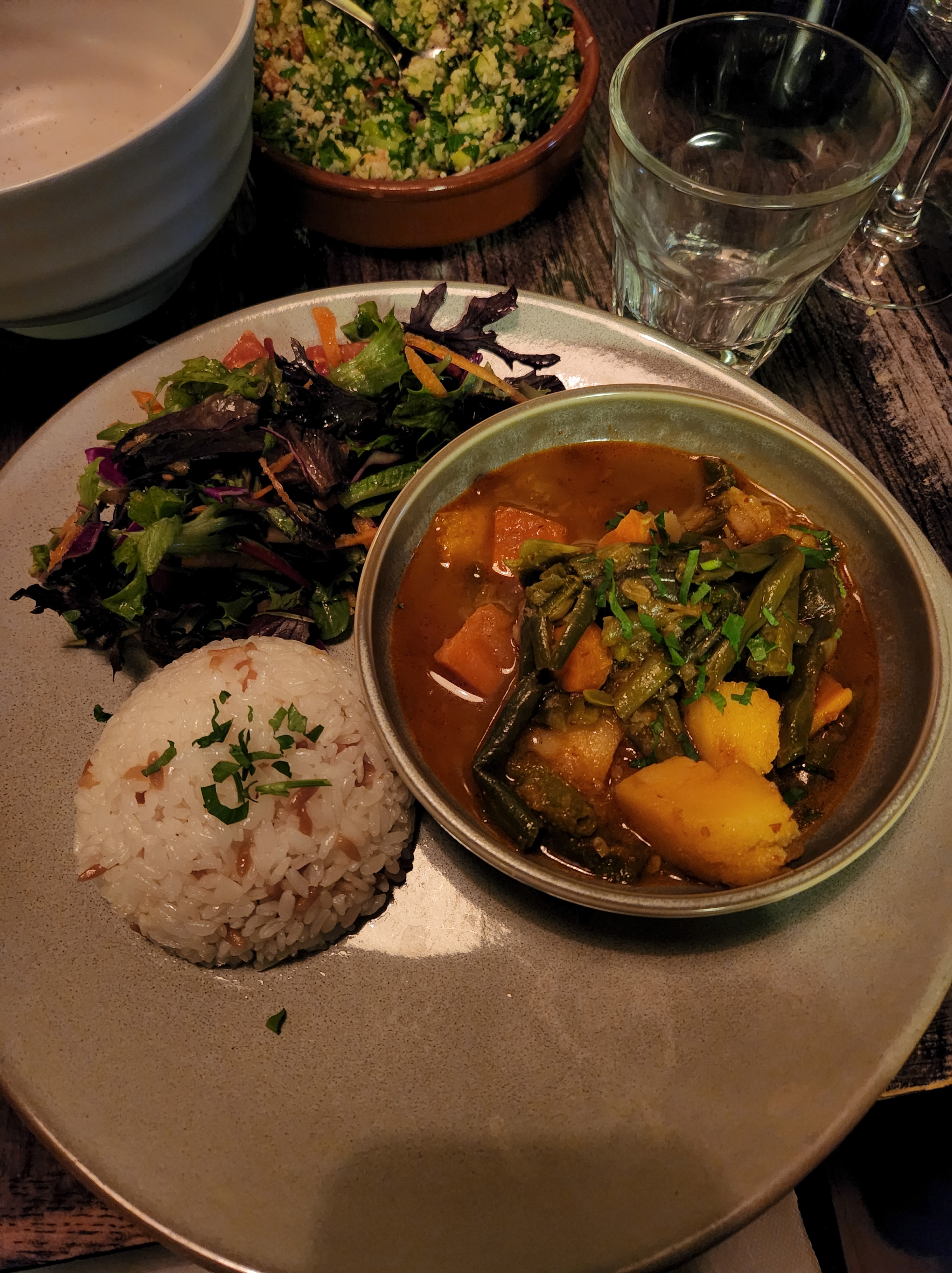 The atmosphere was lively – and even more so when a charming belly dancer appeared. She made a delightful addition to what was already a very pleasant evening. She was sensitive to the crowd, encouraging some brave people to join her, and leaving the not so brave to quietly enjoy. One of our companions was amongst the former and was magnificent in her smilingly enthusiastic approach to the dancing. She was excellent, and we certainly did not tell her to keep her day job!