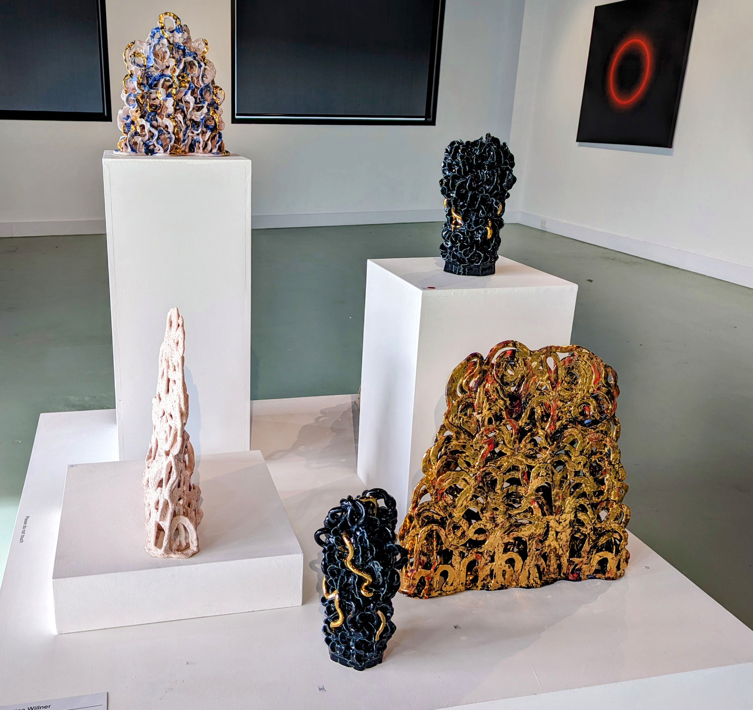 Artists on display at Divisions Gallery – Bettina Willner, Hamura Rimene, Te Kahuwhero Alexander – Tu’inukuafe, Luke Neil, Abbey Rich and Nanou Dupois.