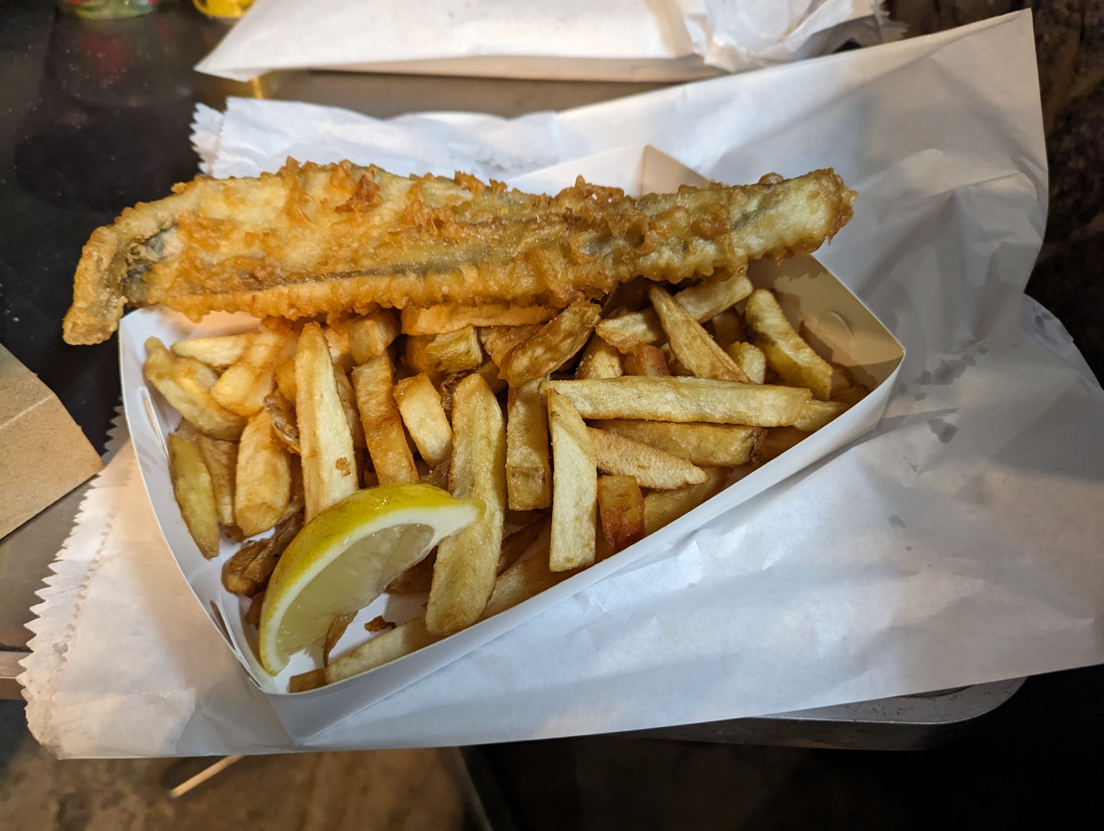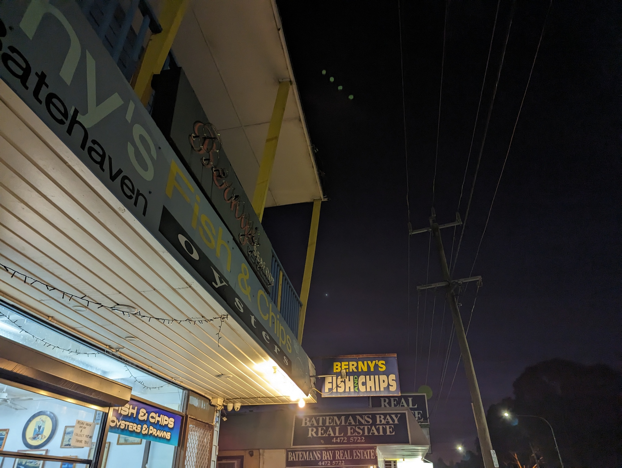 Berny’s Fish and Chips was a delightful find at Batehaven. The friendliness was only surpassed by the quality of the meal. The chips were crips and succulent and the fish with its light batter so much better than anything I have had since the Benito fish meals in New York and LA. There is outside seating and parking close by. The hamburger (complete with beetroot) was bought for the non- fish eater at the next-door cafe. They also provided the coffees pictured below.