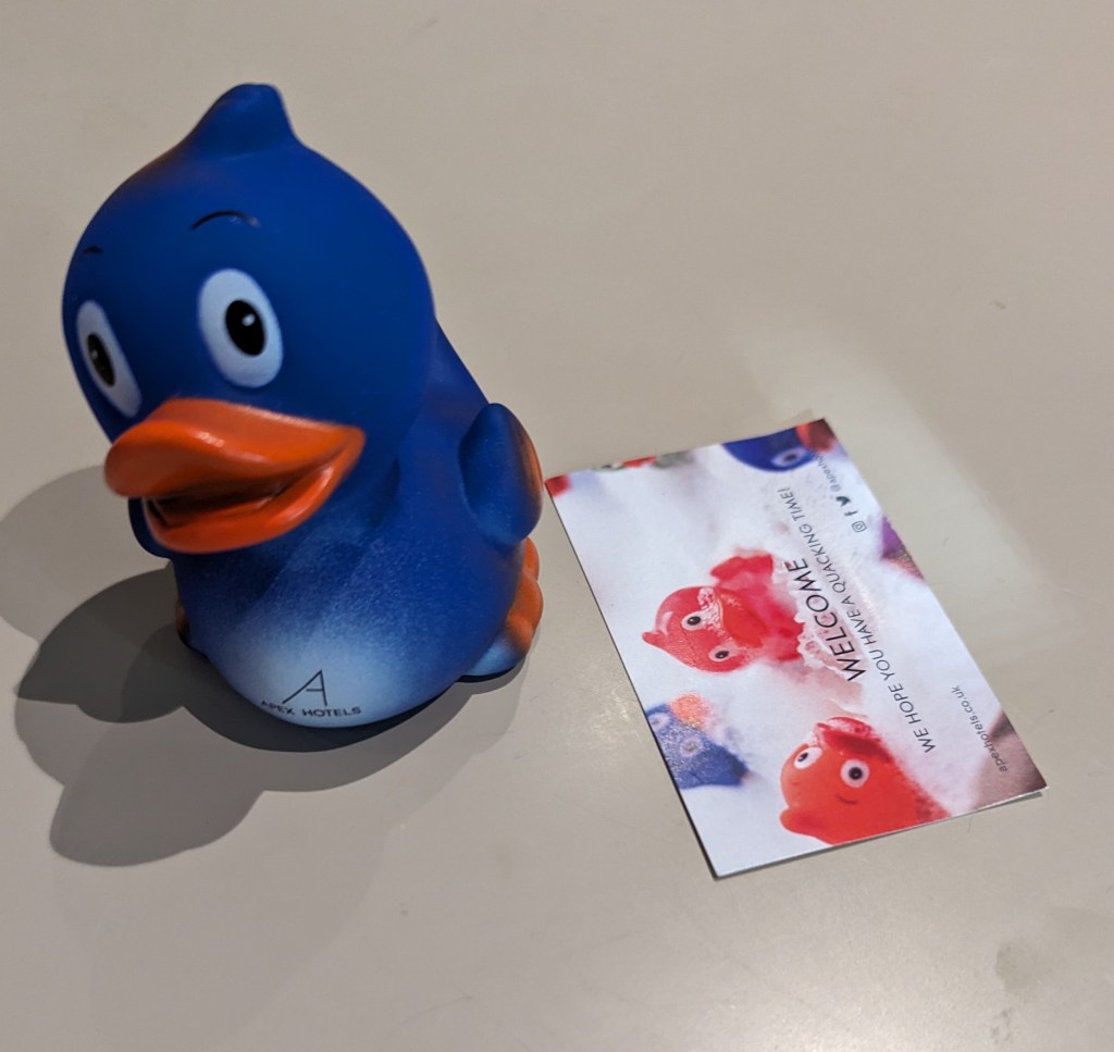 Associated with the hotel in Bath is its range of ducks. One is left on the bed with the towels and is to be taken to advertise the hotel chain. Its QR code actually worked so I know that its name is Oliver, and about the other locations. So, I’ll advertise. Although we were unable to check in as early as planned, the remainder of the stay was very good indeed.
