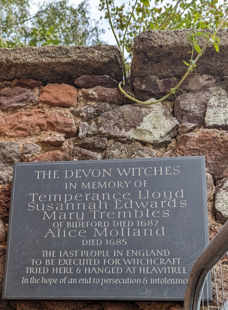 The plaque dedicated to the Devon Witches is placed on the wall of the castle in the Rougemont Gardens, Exeter. Unfortunately, the plaque has been partially obscured by a fencing around buildings associated with work taking place at the gardens. When I saw the plaque (taking the photo required scrambling around a large truck and the fencing) I recalled the book by John Callow, The Last Witches of England A Tragedy of Sorcery and Superstition, that I reviewed early in this blog. The first paragraphs are repeated here.