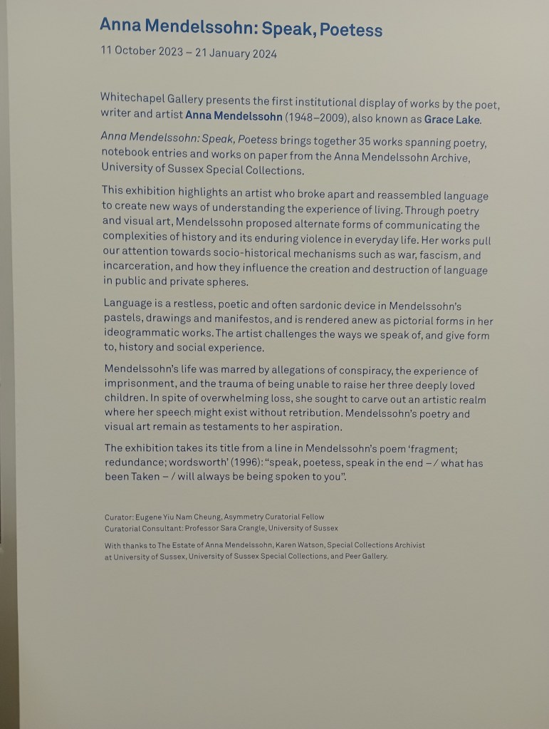 Anna Mendelssohn (b. 1948—d. 2009) authored poetry, fiction, drama, and life writing; she was also a visual artist, musician and translator. From 1971 to 1977 she served time at Holloway Prison in London due to her involvement in extreme leftist activism. From the early 1980s, Mendelssohn composed fifteen poetry collections and published in journals receptive to her experimental, charged lyrics, among them, Parataxis, Critical Quarterly, and Jacket. Her work appeared in seminal anthologies including Denise Riley’s Poets on Writing (1992), Iain Sinclair’s Conductors of Chaos (1996), and Rod Mengham and John Kinsella’s Vanishing Points: New Modernist Poems (2004). Often situated within the British Poetry Revival, Mendelssohn retained a marginal, if constant, presence in the poetry community in Cambridge, England, where she lived from 1983 until her death. In 2010, her vast archive of writings and drawings was generously donated by her three children to Special Collections at the University of Sussex.