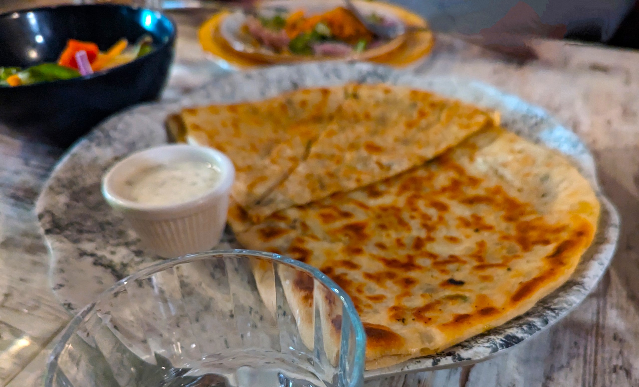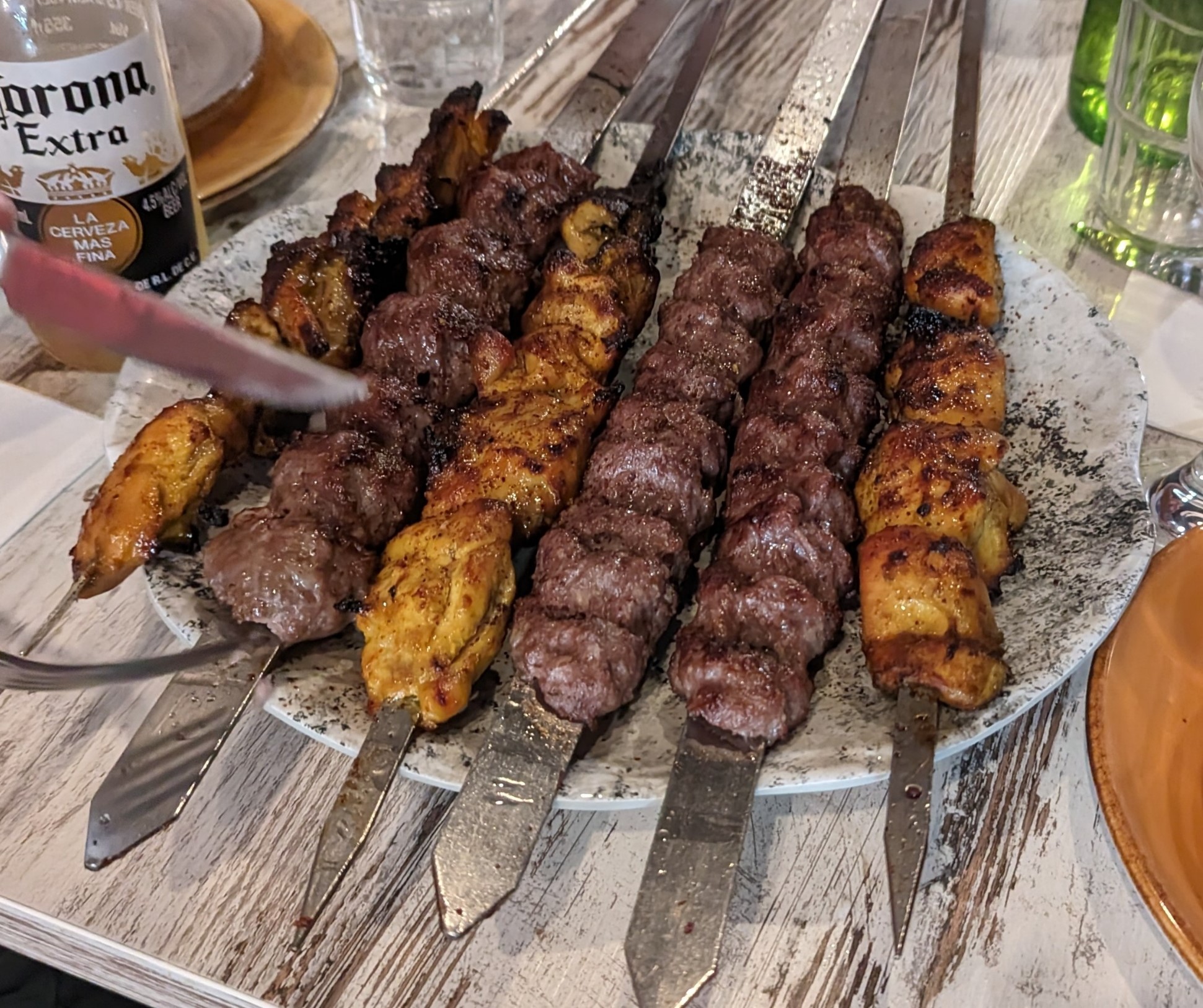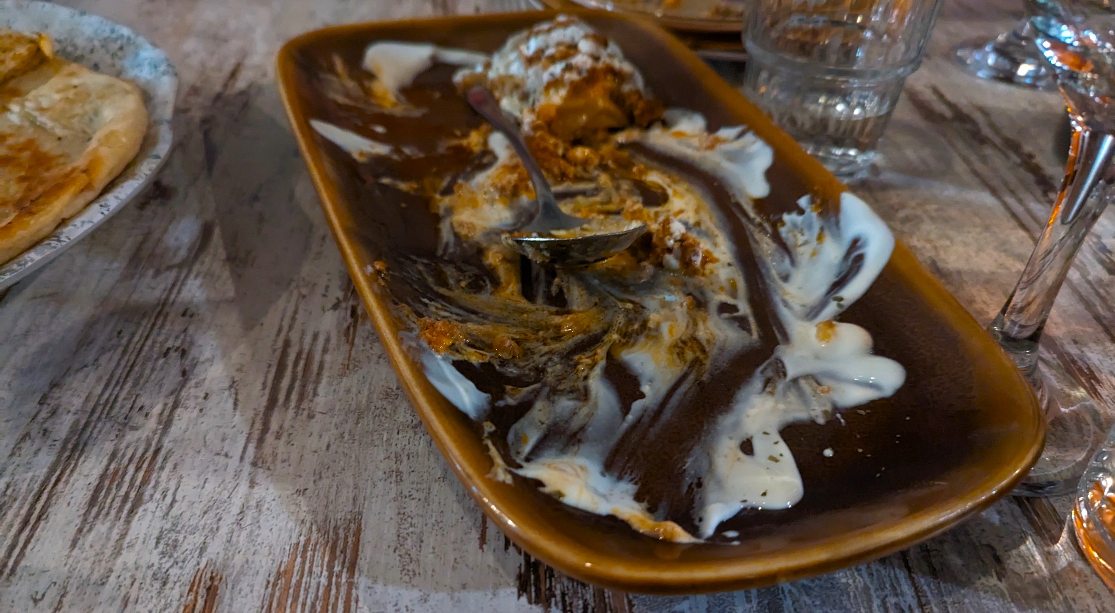 Entrees came with a magnificent mixed grill which comprised chicken, and lamb meatballs. There was a salad, a selection of accompanying sauces, dumplings and a stuffed bread dish. The mains we chose were the prawns, lamb, chicken, and eggplant. All were delicious, but the prawn dish really stood out.