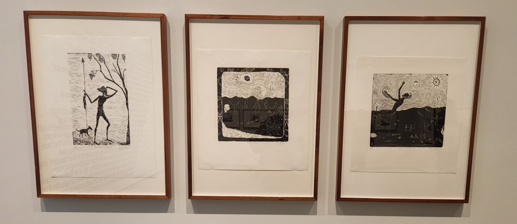 Left to right, linocuts: Boothung and Mirrigarn, 1967/1990; Corroboree Spirits, 1965/1990; Christmas Eve in the Land of the Dispossed, 1968/1992.