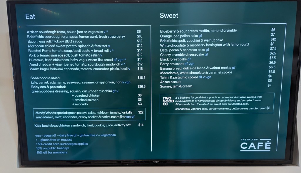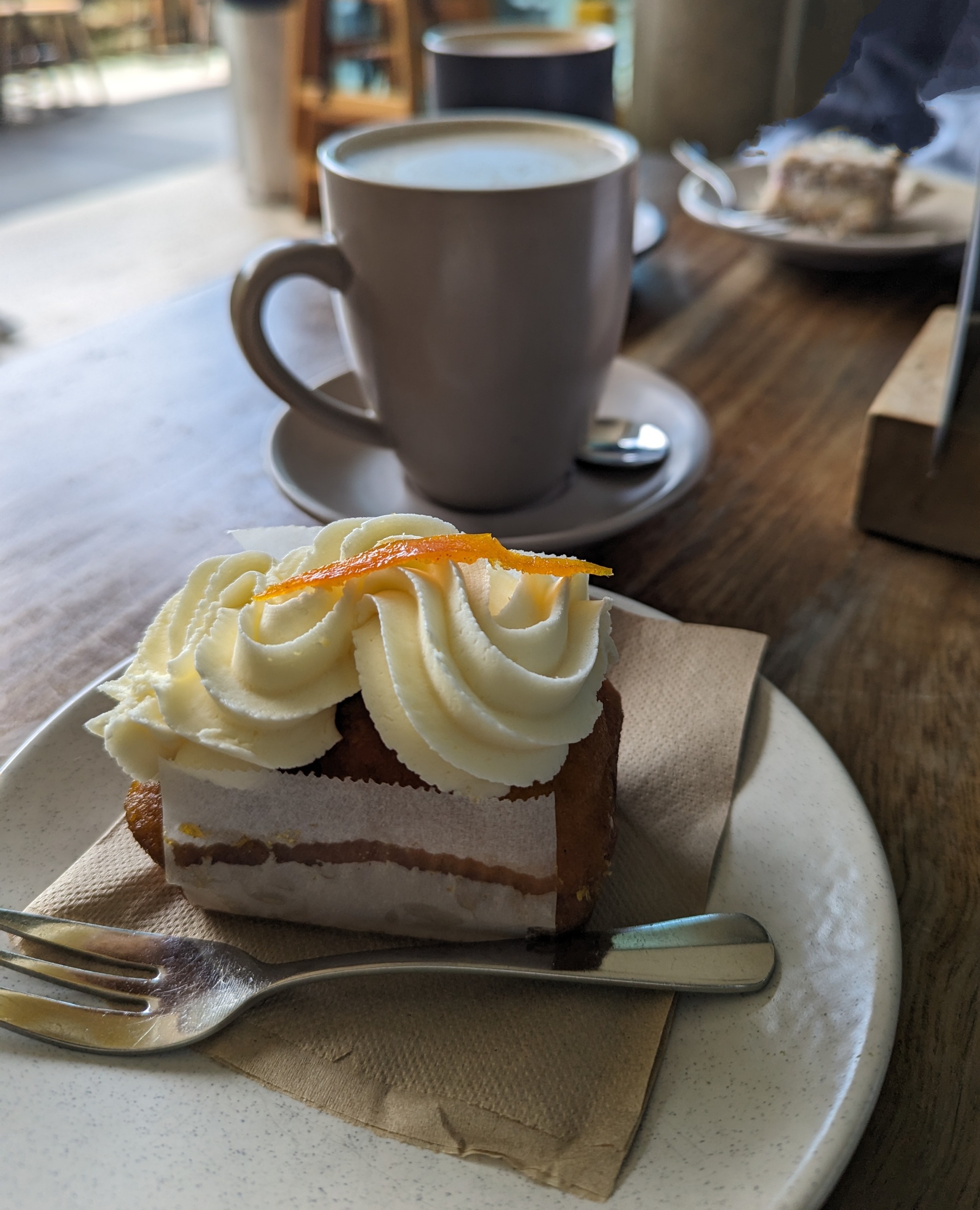 This is a lovely spot to eat, and enhanced for me by the connection with Mindy Woods, a Master Chef competitor whom I followed on the show. Alas, I did not order the healthy salad promoted in her name, the cakes looked too inviting and it was too early for lunch. Perhaps next time…