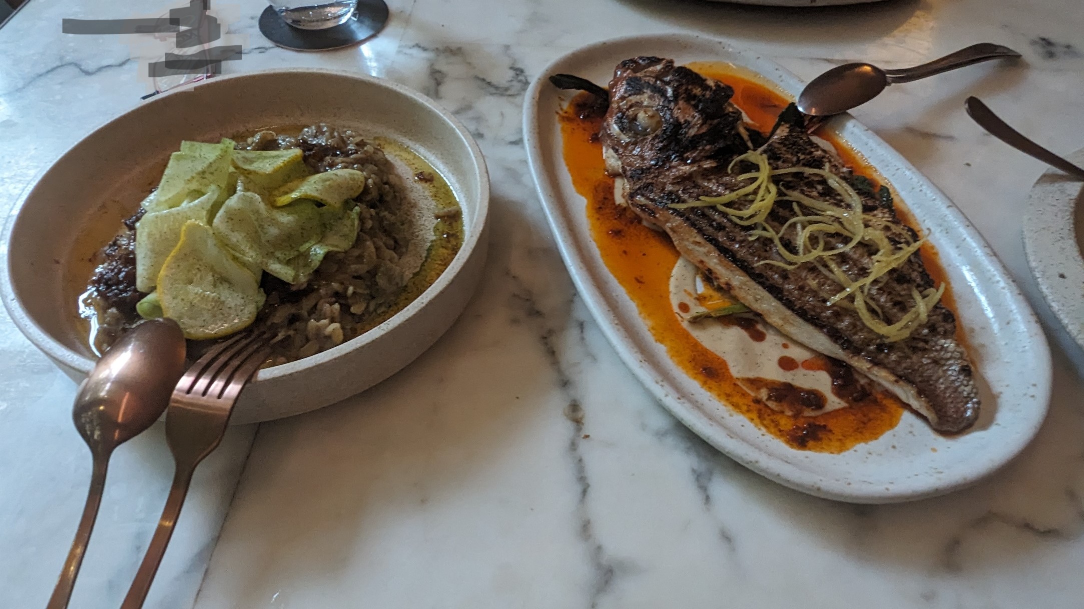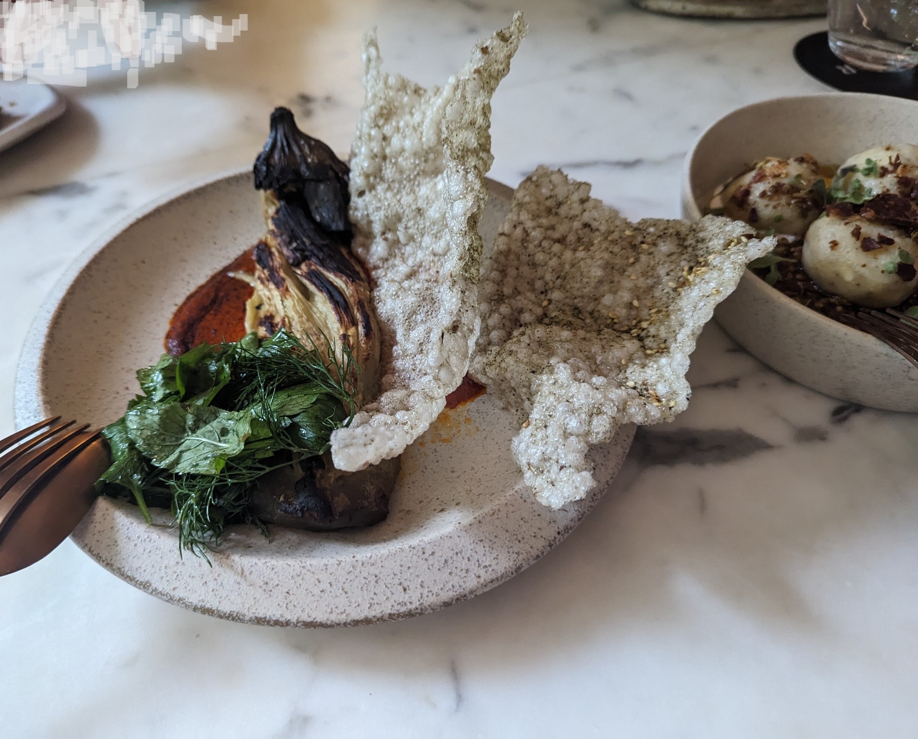 Nour was a wonderful experience, from the welcoming smiles as we arrived, to the friendly farewells at the end of the night. We had a marvellous waiter who was most helpful in ensuring that we had a good understanding of portion sizes, the best way to enjoy the dishes (mix the eggplant with the sauce, which I think we did not really achieve so it was a disappointing dish) and the number of dishes that would work well. I particularly enjoyed the mussel parfait with a hot roll, the Murray cod mezze, the fish main and the cauliflower side. I would order the Fattoush salad in preference to the mushroom dish next time. The fresh mint tea made a lovely end to the meal. Others enjoyed the lamb shoulder, meat mezzes and the scallops. There is an excellent range of small and larger mezzes, four main dishes plus a special, and well-proportioned side dishes ‘from the garden’.