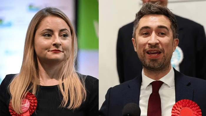 Gen Kitchen, left, won the by-election for Labour in Wellingborough while Damien Egan overturned the Conservative majority in Kingswood © FT Montage/Getty/Reuters