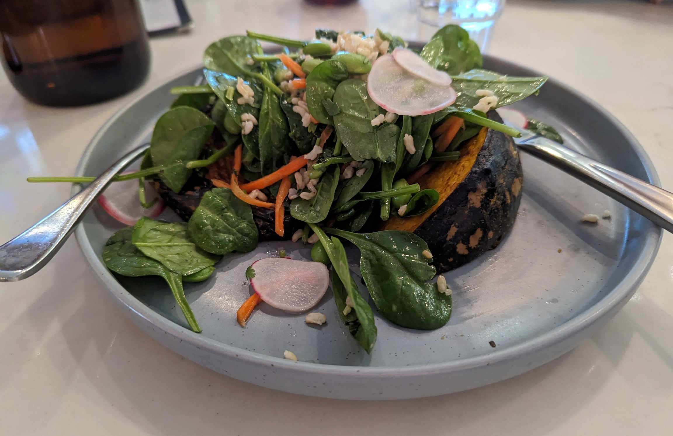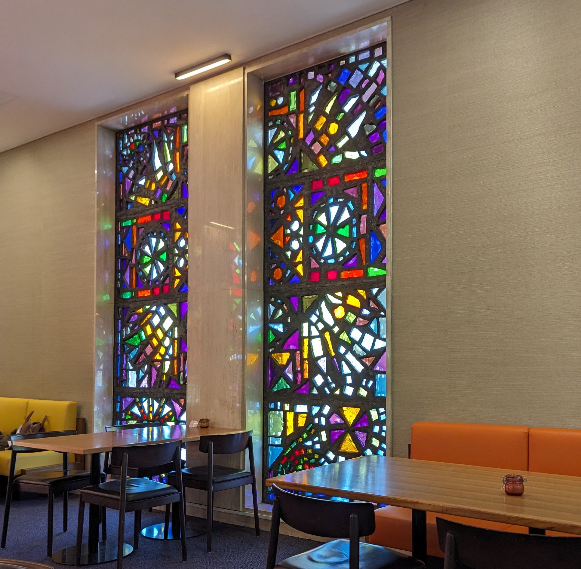 Bookplate at the National Library has changed its menu, so the sandwiches of the past are now provided at Paperplate, downstairs. Perhaps we’ll try that next time. The cooked meals, coffee and cakes at Bookplate are attractive, although I was disappointed that a brunch item (avocado and accompaniments) was not available at 11.45. I chose the pumpkin with miso salad. This was pleasant, but needed more miso, or possibly a different, tastier dressing. The coffees were fine, but not marvellous. An old-fashioned milk shake was a nice touch. Bookplate has a very attractive outdoor area with large umbrellas. But nothing can surpass being amongst the Leonard French panels around the indoors section.