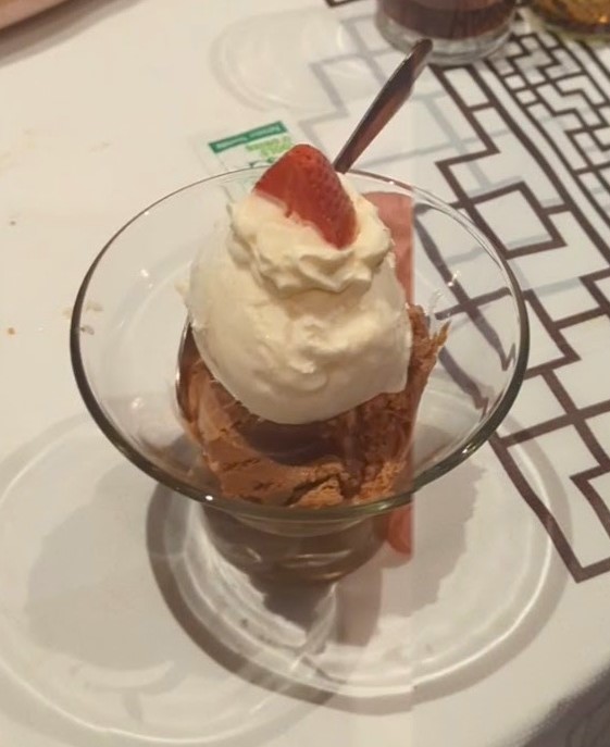The dessert menu was tempting and even more so when the chosen dishes, fried ice-cream, and two different flavours of ice-cream with a cream and strawberry topping arrived.