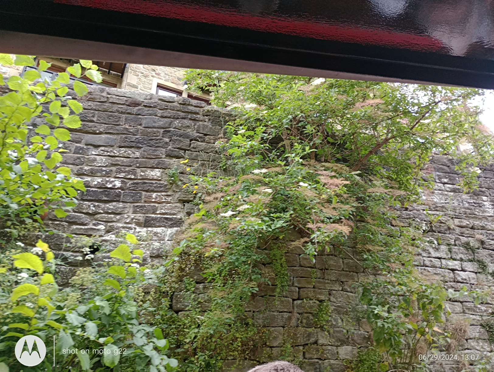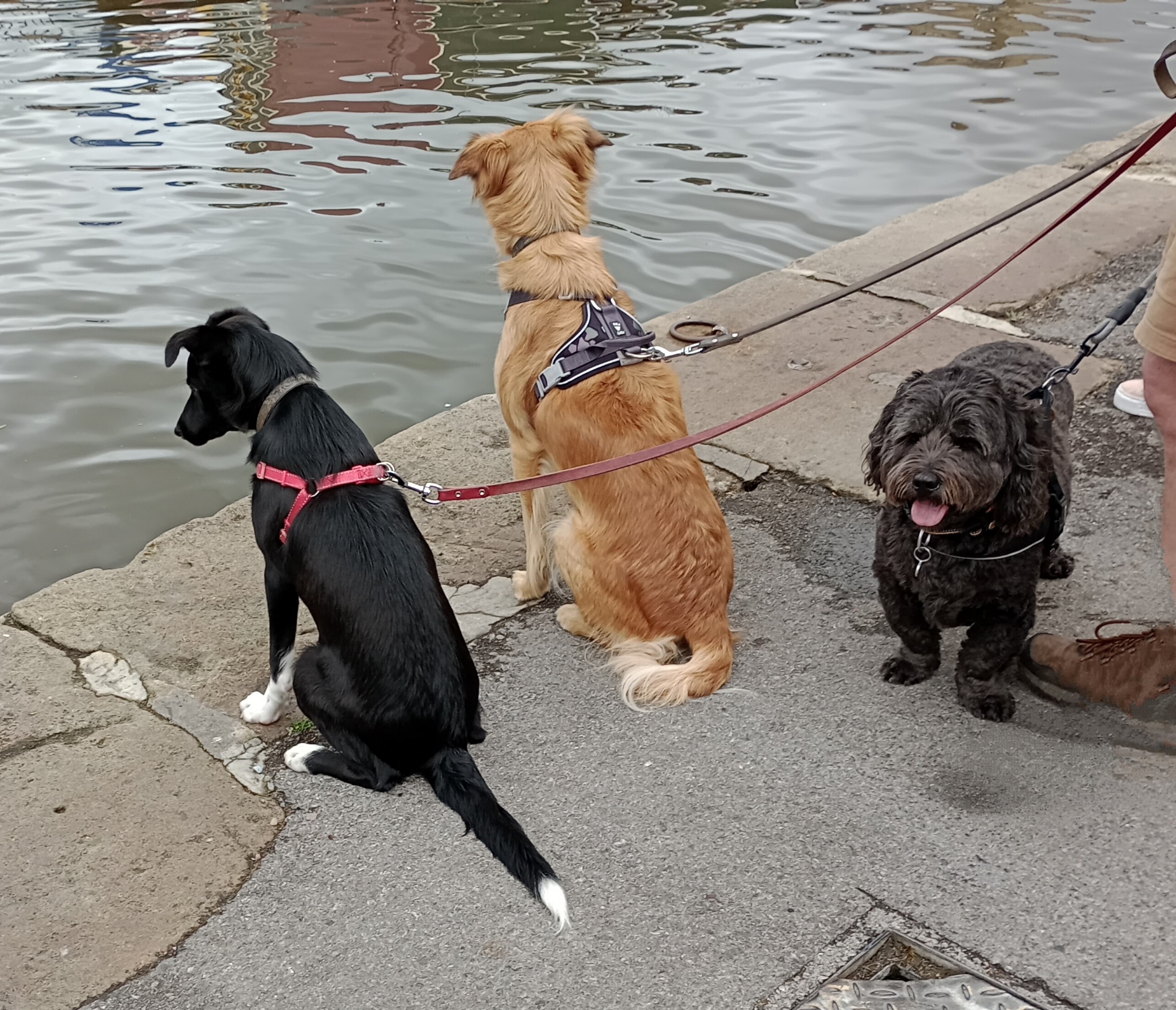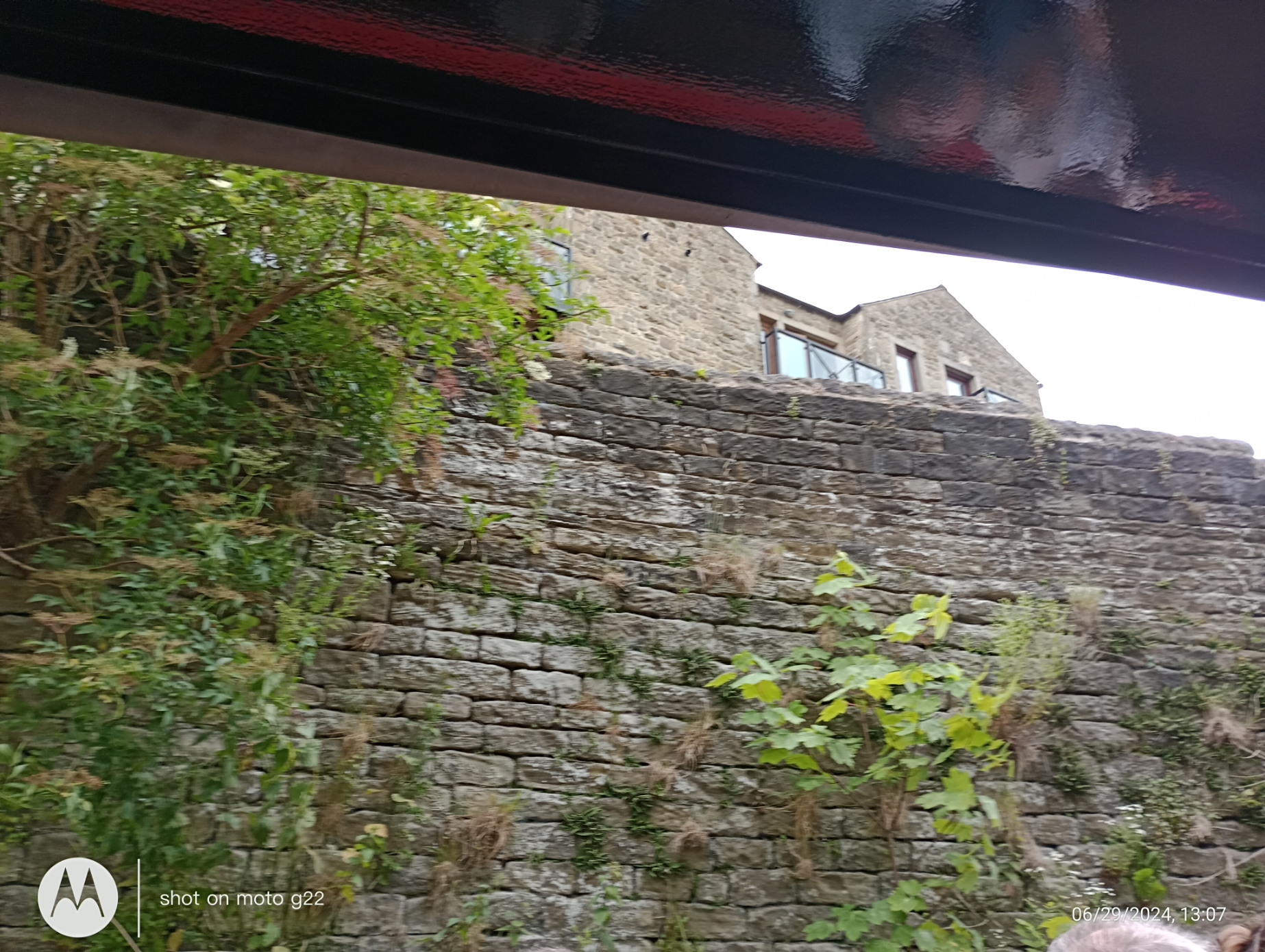 The barge provided a peaceful interlude with pleasant scenery. The dogs were still, having given up on receiving any more food than the kibble their owners gave them as we sailed. Dry stone walls (the first photos below) can be seen along the canal.