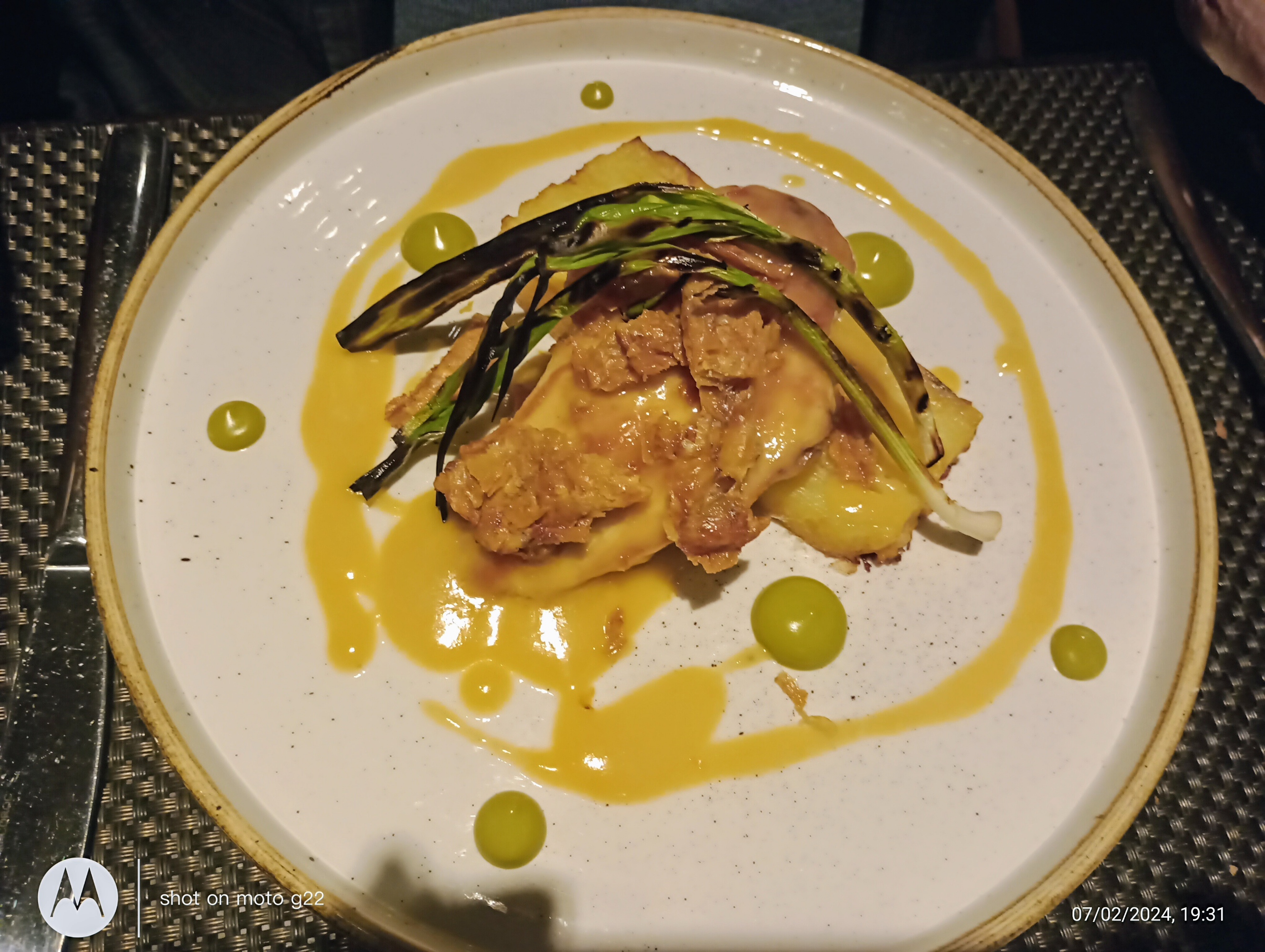 Main courses: HALIBUT, Lobster, Garlic Pomme Puree & Lemon Butter Sauce… CORN-FED CHICKEN, Yorkshire Cheddar Dauphinoise, New Leeks & Lovage