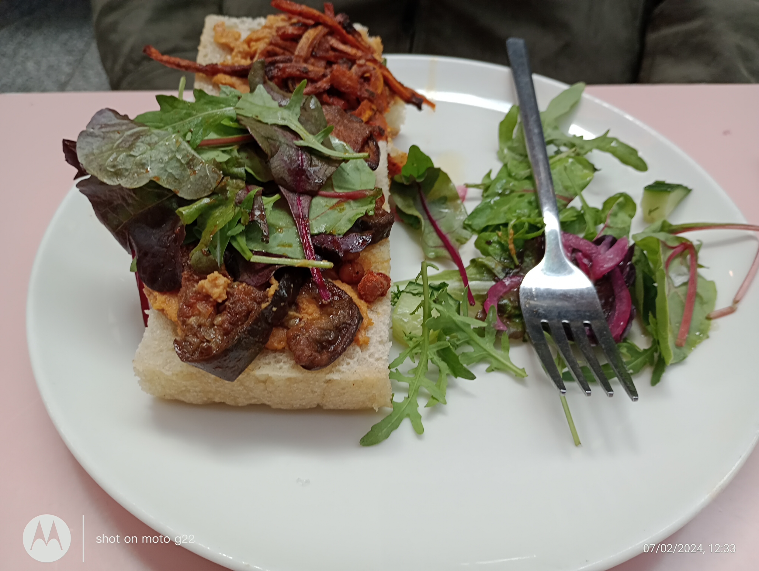 Set in an old arcade, with lovely architectural surrounds, Rabbit hole coffee makes a pleasant stop in the centre of the city. The service was really friendly and efficient, and the food delicious, although I think that my green soup probably doesn’t look particularly attractive! I had it with a half serve of toasted cheese sandwich. The eggplant, salad and meat offering looked delicious. It’s always fun to find a place such as this for a quick and easy meal, even if not tired and loaded down with shopping.