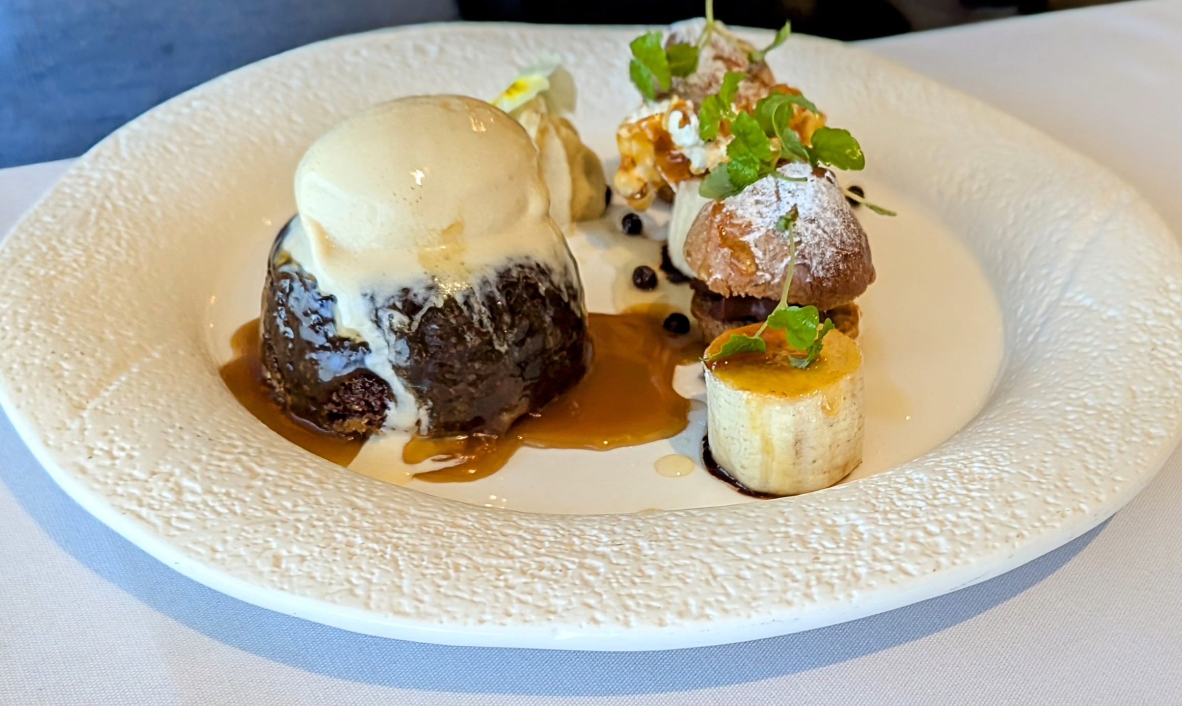 The menu was the same as last time I went so I tried something new. The different choices I made (apart from the familiar cheesecake dessert which I could not resist) were excellent. On this occasion the spatchcock on the menu was replaced with duck, which was beautifully cooked and served with brussel sprouts, Gruyere Cheese, Kipfler Potatoes, Leeks and Chorizo Veloute`and Chimichurri Sauce. I left the prosciutto which adorned it – the meal was generous enough! My entree was the Hiramasa Kingfish, Garlic Prawn, Aromatic Coconut Curry, Kaffir Lime, Buffalo Yoghurt, Tomato and Micro Coriander; the other choice at our table was the Charred Aubergine with Smoked Hummus, Mushroom, Sweet potato, Currants, Pine-nuts and Spicy Agrodolce which I also had last time. This was followed by the main of Wagyu Beef Cheek & Angus Beef Fillet, Cream Spinach Celeriac Puree, Baby Turnip, Dutch Carrot and Red Wine Jus.