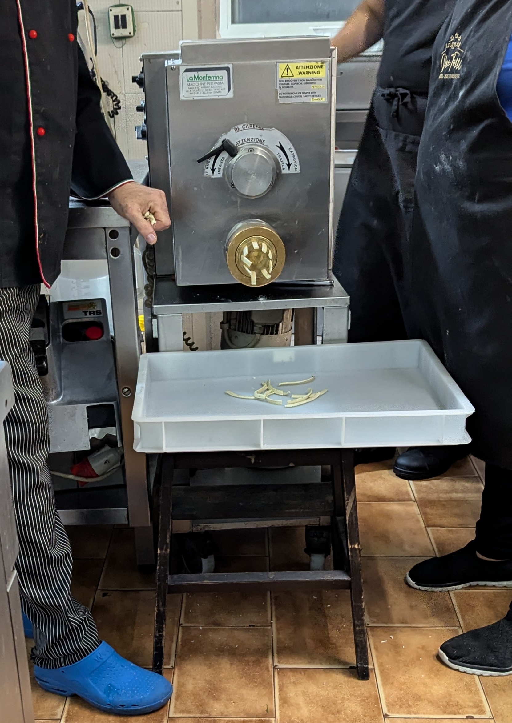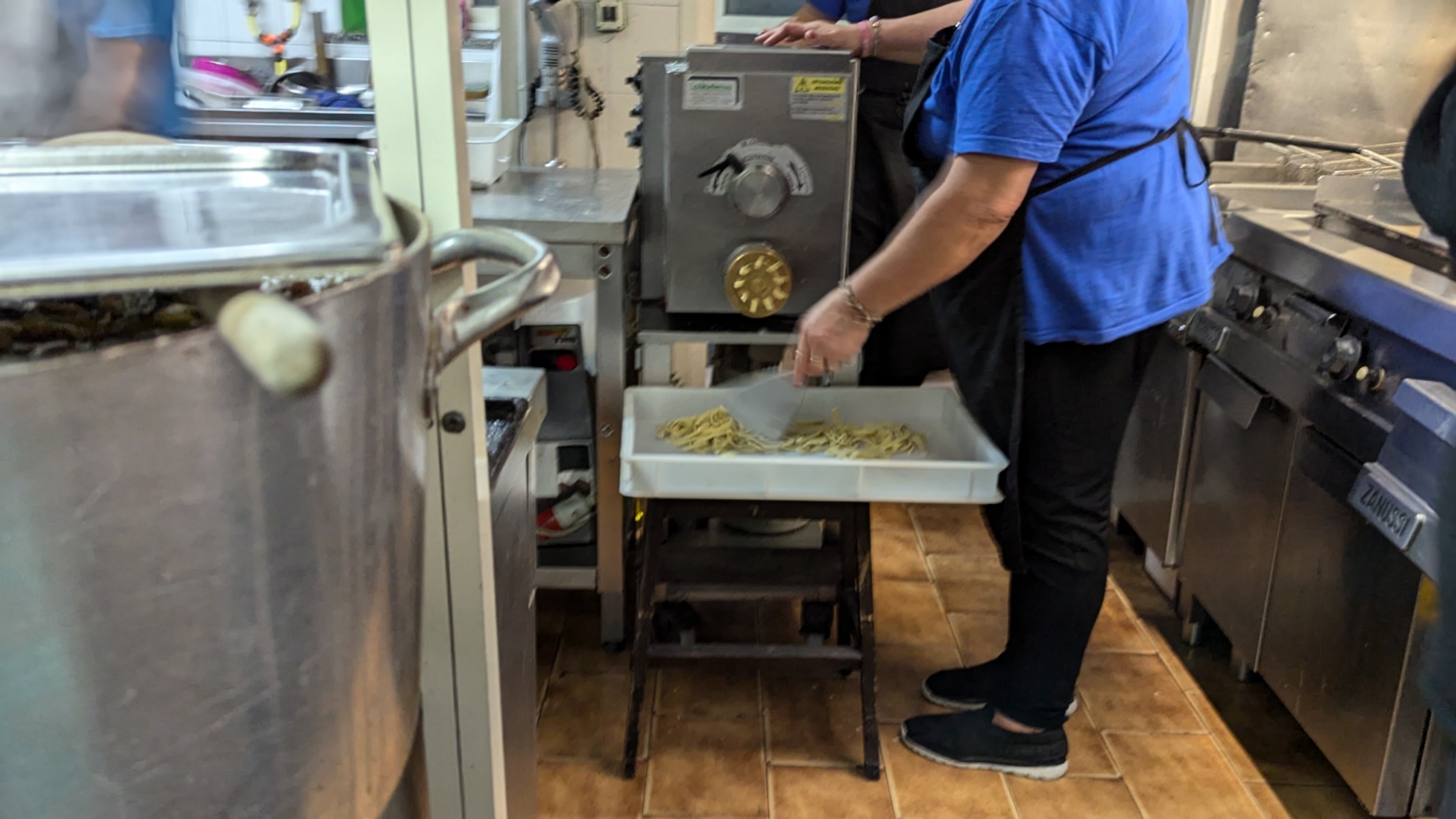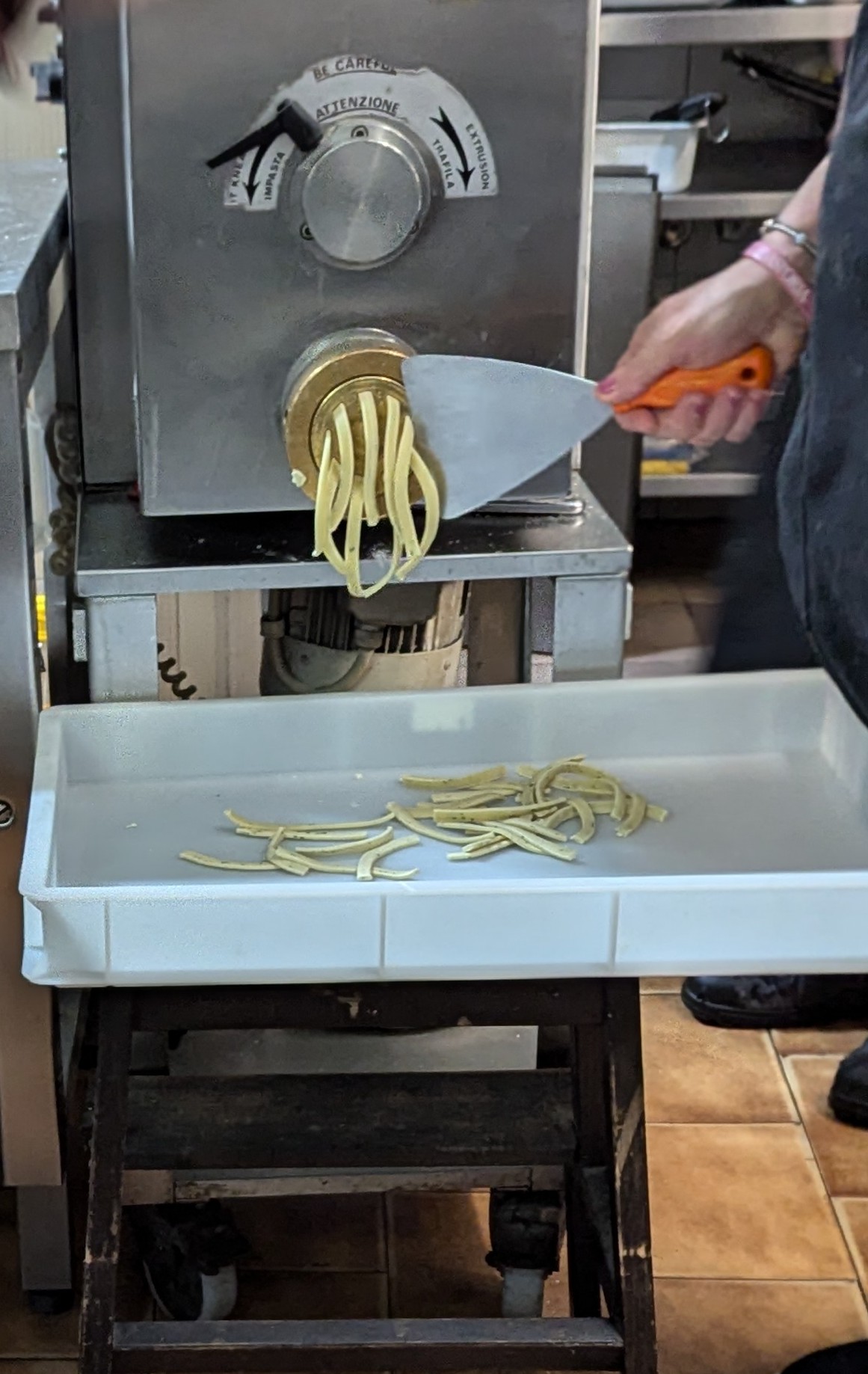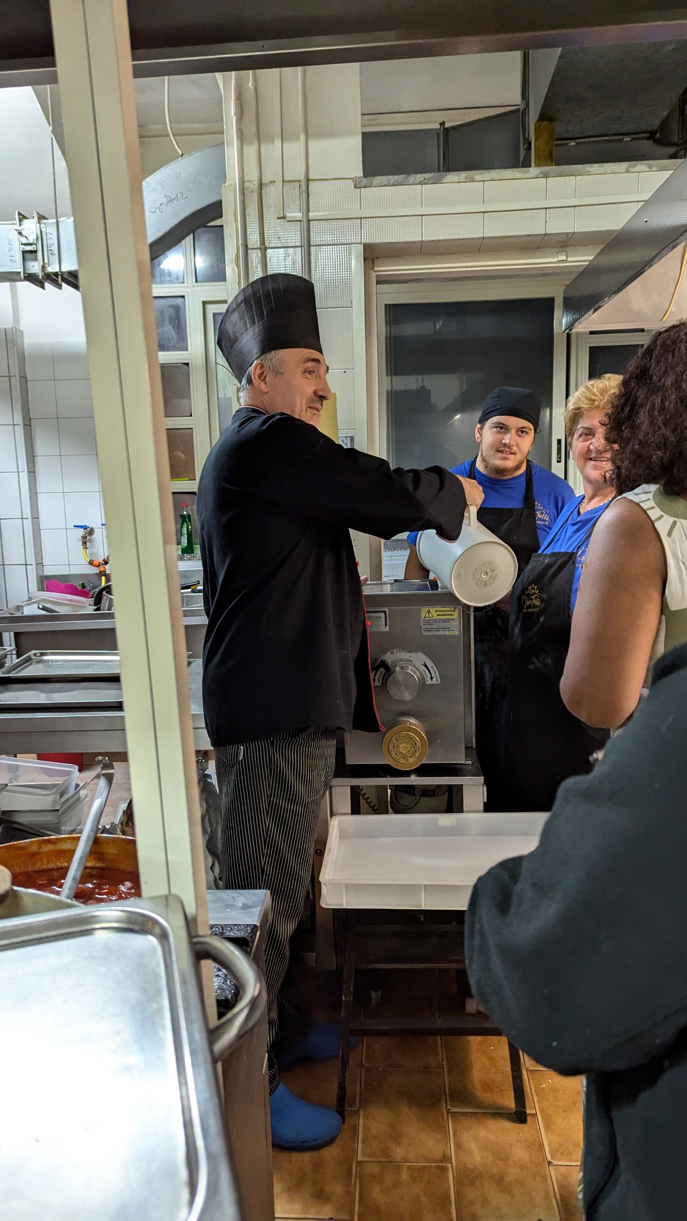 The pasta demonstration was accompanied by a feast of bread, cheese and jam with white wine while we watched. Much of the meal for that night was demonstrated – pasta, fish, tiramisu. The non-fish dish was artichokes which I understand were wonderful. I had the fish which was not nearly so nice as the clam and pipi pasta. The tiramisu was fantastic. One of the tour group assisted. The cream was a combination of whole eggs, egg whites, cream and mascarpone, with a dash of very strong coffee. It was great to see that the simple sponge fingers dipped in coffee were a feature of this elegant dish as well as the one I make. The soup was for another night – when we tasted it the necessity for cooking soup over a long period was made abundantly clear. It was delicious with a flavour that was mellow and developed with each mouthful.