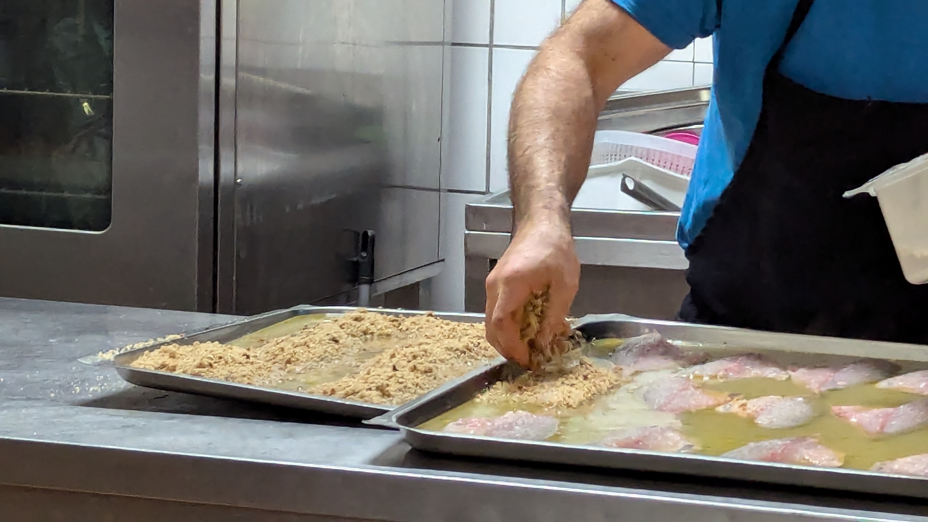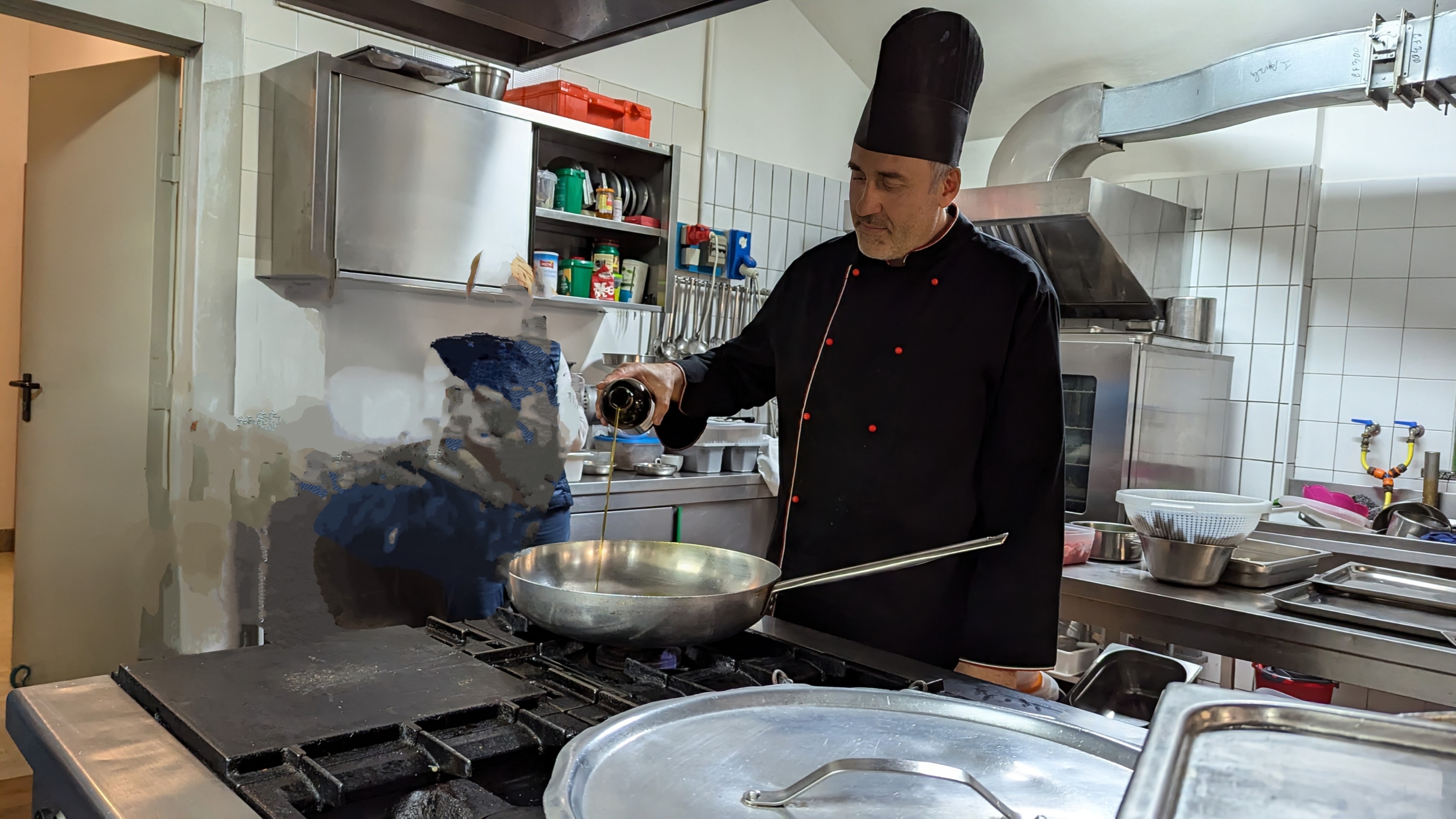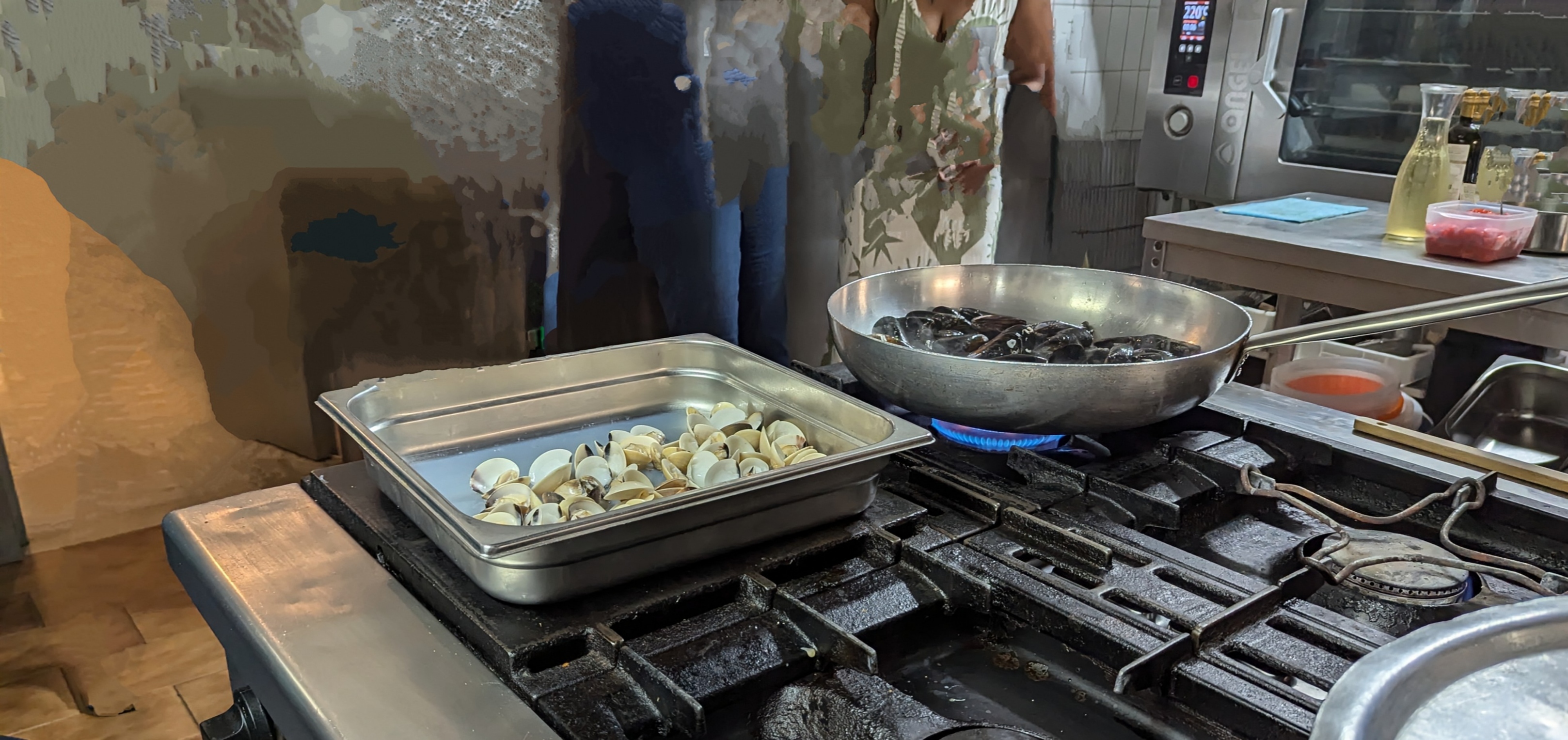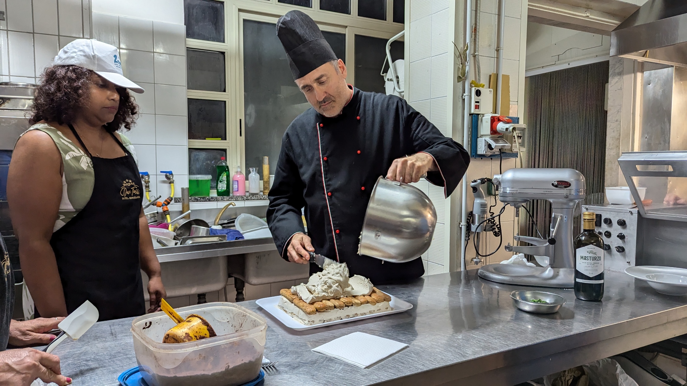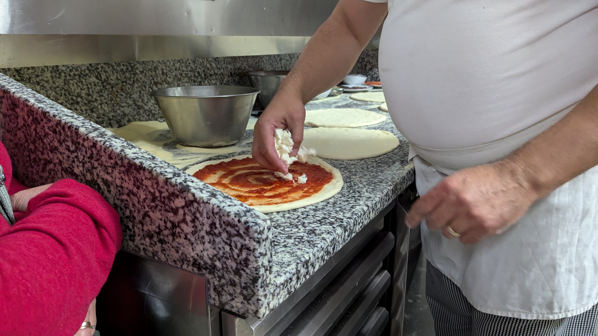 The pasta demonstration was accompanied by a feast of bread, cheese and jam with white wine while we watched. Much of the meal for that night was demonstrated – pasta, fish, tiramisu. The non-fish dish was artichokes which I understand were wonderful. I had the fish which was not nearly so nice as the clam and pipi pasta. The tiramisu was fantastic. One of the tour group assisted. The cream was a combination of whole eggs, egg whites, cream and mascarpone, with a dash of very strong coffee. It was great to see that the simple sponge fingers dipped in coffee were a feature of this elegant dish as well as the one I make. The soup was for another night – when we tasted it the necessity for cooking soup over a long period was made abundantly clear. It was delicious with a flavour that was mellow and developed with each mouthful.