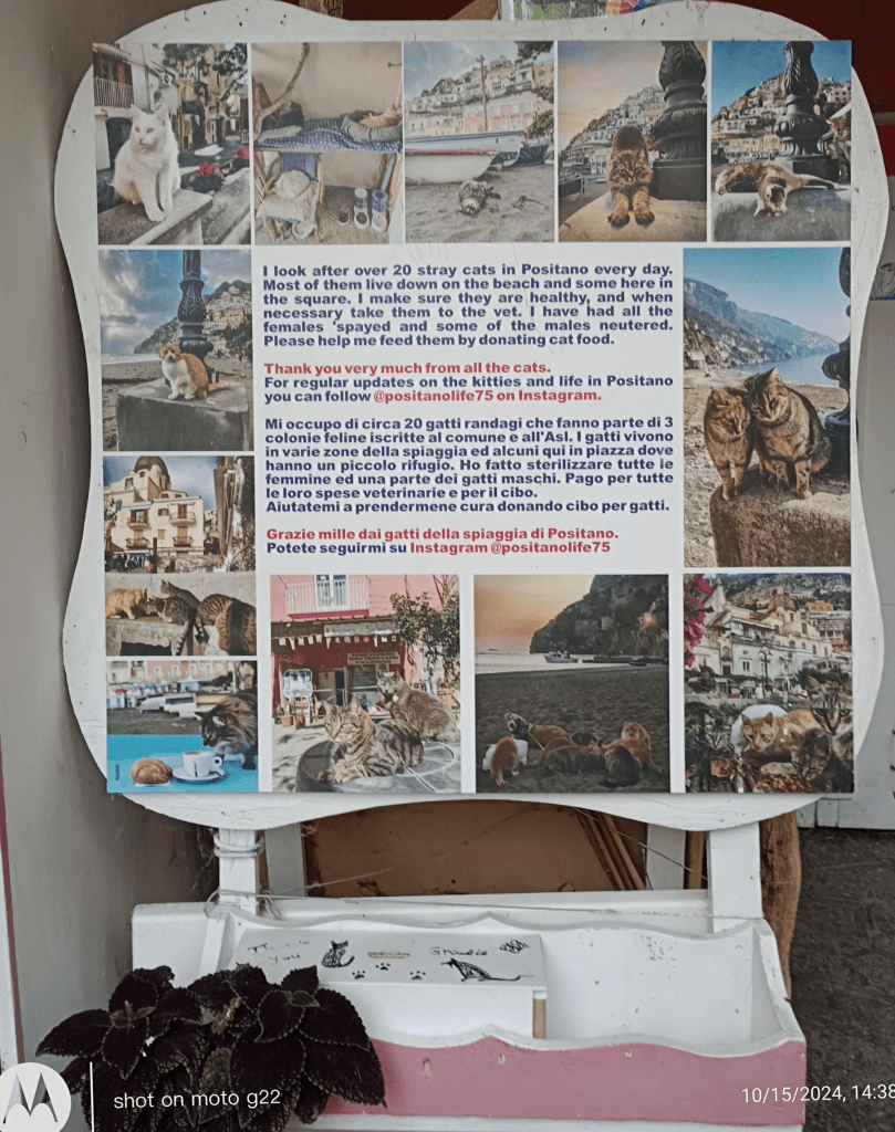 Positano is undeniably touristy – but thoroughly delightful in my opinion. The walks through the town are attractive, with domestic attributes as well as churches, glimpses of the ocean from the heights, and beach walks, ocean side eateries and picturesque ceramics amongst the stonework. The care for cats, although not as wholehearted as on Capri, is a lovely feature.
