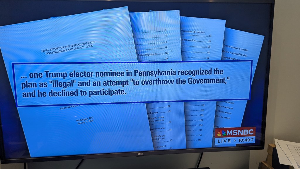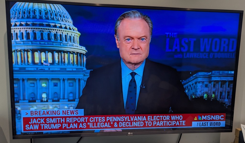 Neal Katyal and Andrew Weissmann, interviewed by Lawrence O’Donnell, gave excellent commentary on Jack Smith’s work, the outcome and the decision. There was also commentary on the response of one elector nominee (related to the fraudulent list of nominees for the Electoral College vote for the President) and that of the proposed Attorney General whose hearing will begin on the 15th of January 2025.