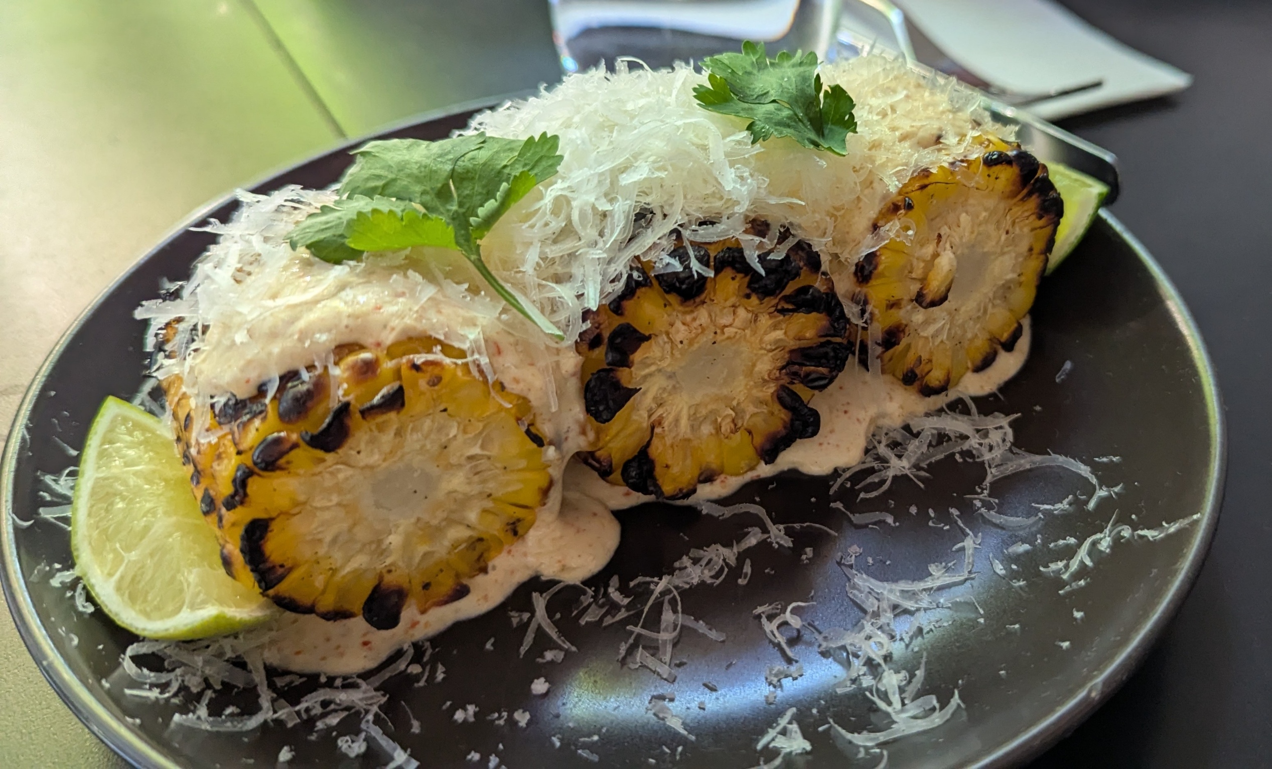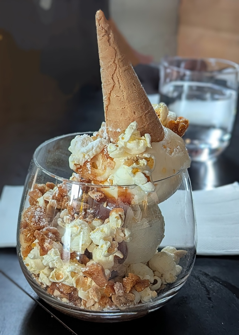 86 was great as usual. We sat outside as inside tends to become noisy – not that we are put off by this, the food and service more than make up for it. On this occasion there were four of us, and I was so busy talking (and eating) I forgot to take photos of some of the dishes. Those missing are the delicious spiced cauliflower, the broccolini (charred and with a generous portion of hazelnuts) the pumpkin tortellini with the sage and burnt butter sauce, and the crispy chicken with two sauces. Pictured are the entrees – the charred corn cobs with the most fantastic sauce and parmesan, and the duck bun, and the three desserts we chose. Of these, we found the frozen margherita a bit of a disappointment, but the strawberry cheesecake and the popcorn sundae made up for this. I enjoy the mocktails – the passionfruit is a favourite.