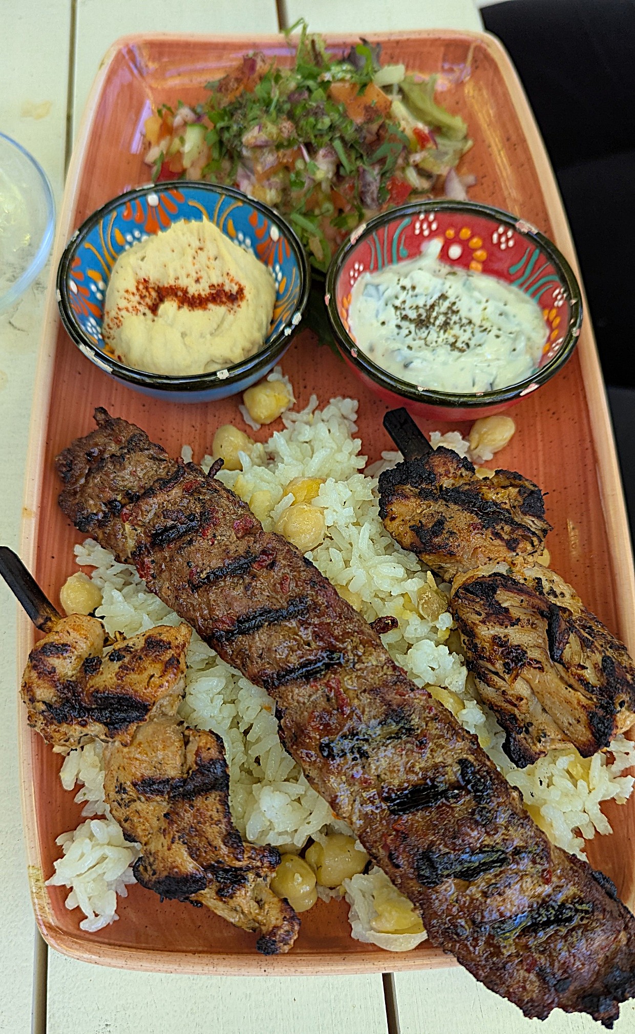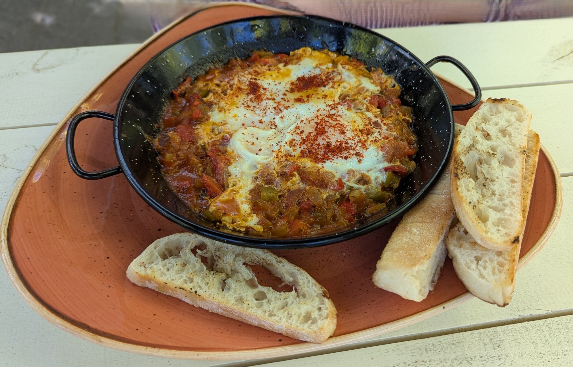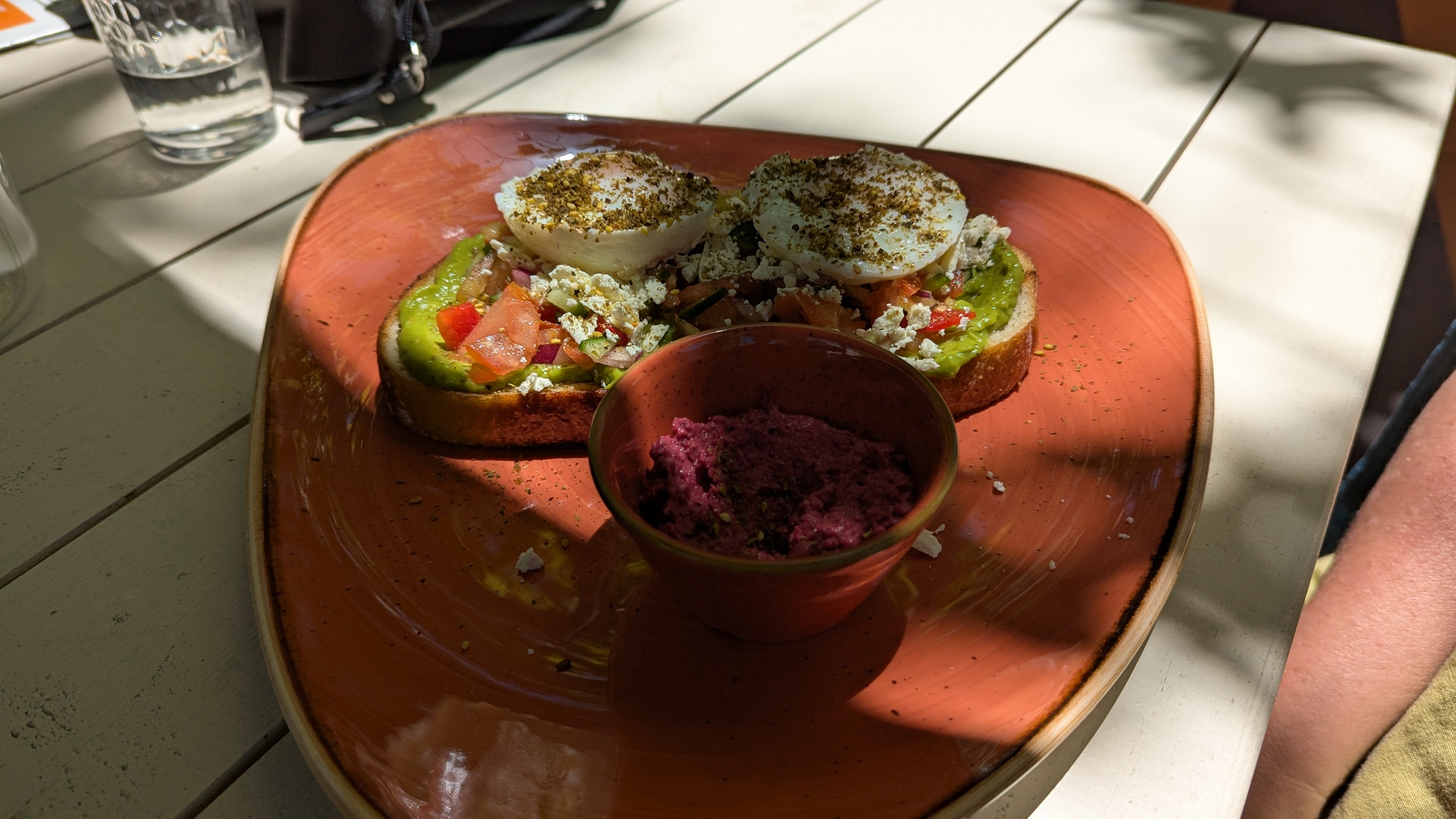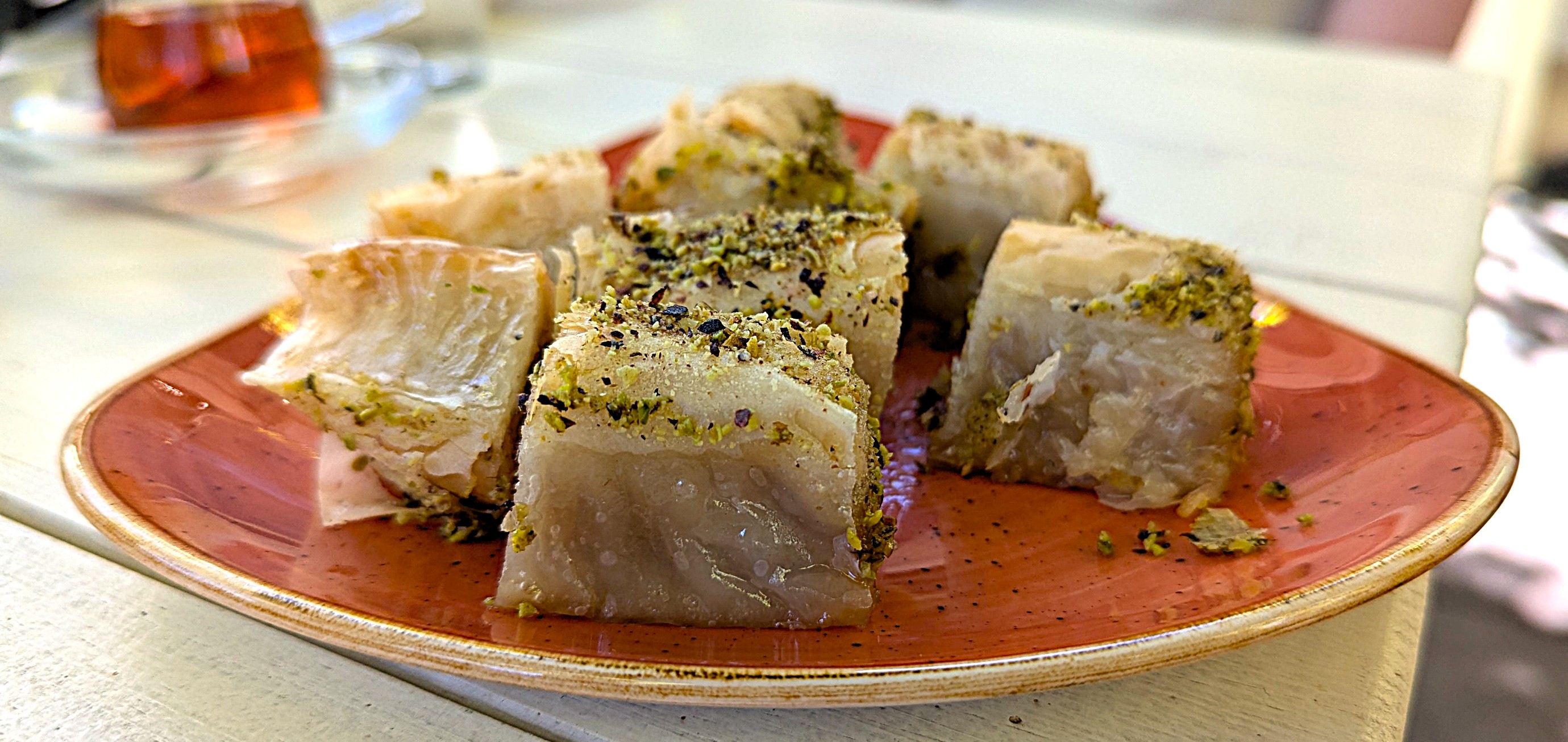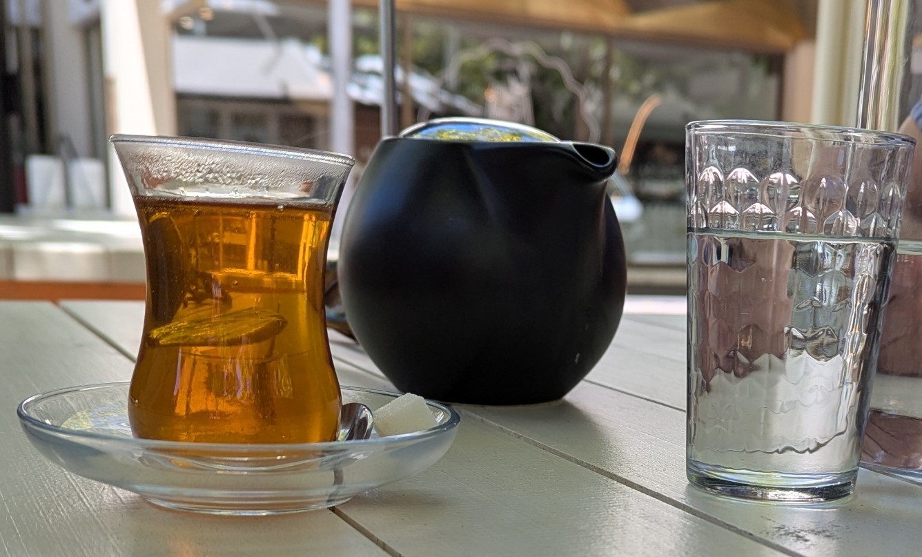 What a find! A great menu with a range of meals for breakfast and lunch the ones we chose from both sections of the menu were delicious. The service was friendly and there is a lovely outdoor setting. Complimentary baklava was a very generous touch. The zucchini fritters were full of zucchini and accompanied by a fabulous salad which cannot be seen in the photo. The Turkish tea looked fun, but water was also provided in carafes.