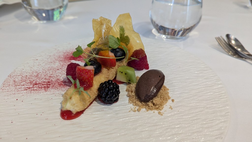Entrees that we often choose are the Meredith goats cheese cloud with tomatoes, avocado ash brioche and micro basil; and the Atlantic salmon tartare with popcorn prawns (on this occasion the chef added many more to the dish which was ordered as a main), baby capers, cukes and a brandy Rose Marie sauce. Favourite main dishes are the White Pyrenees lamb cutlets and rump with hummus, Persian fetta, salt baked carrots, and beetroot vingerette; the market fish (John Dory and a huge prawn on both recent occasions), baby spinach, marinated vegetables, basils pesto and aloili. The desserts are beautifully presented and have been accompanied by candles for the several birthdays we have celebrated. Choices have been white chocolate cheesecake, burnt butter crumb, spring berries, lemon balm and chocolate sorbet; Kensington mango semi-freddo, pistachio biscuit, coconut and raspberry gel, black berries; and Cherry chocolate bon bon, yoghurt sorbet, chocolate soil, meringue and cherry compote. Images of the meals described above appeared in last week’s blog.