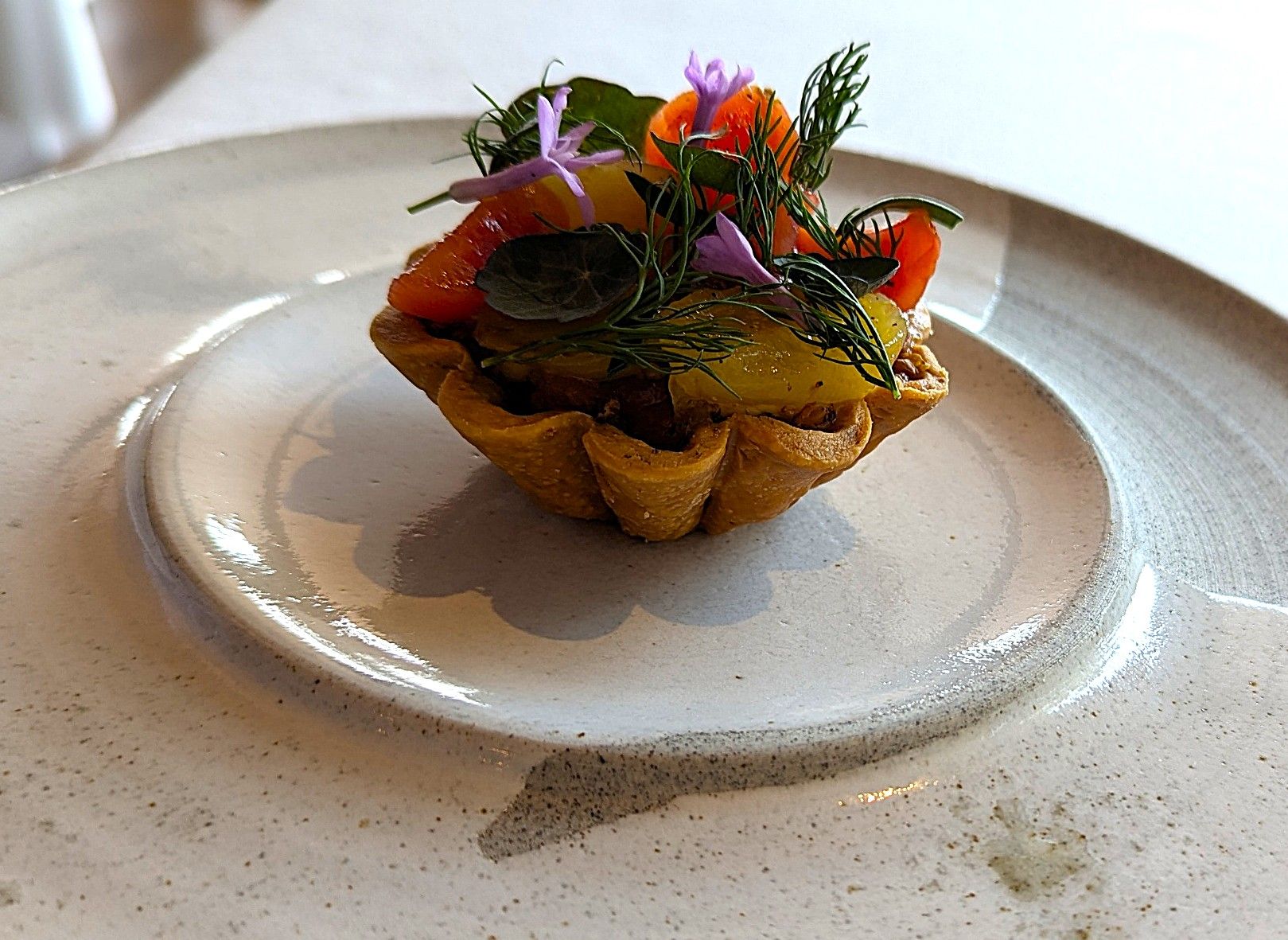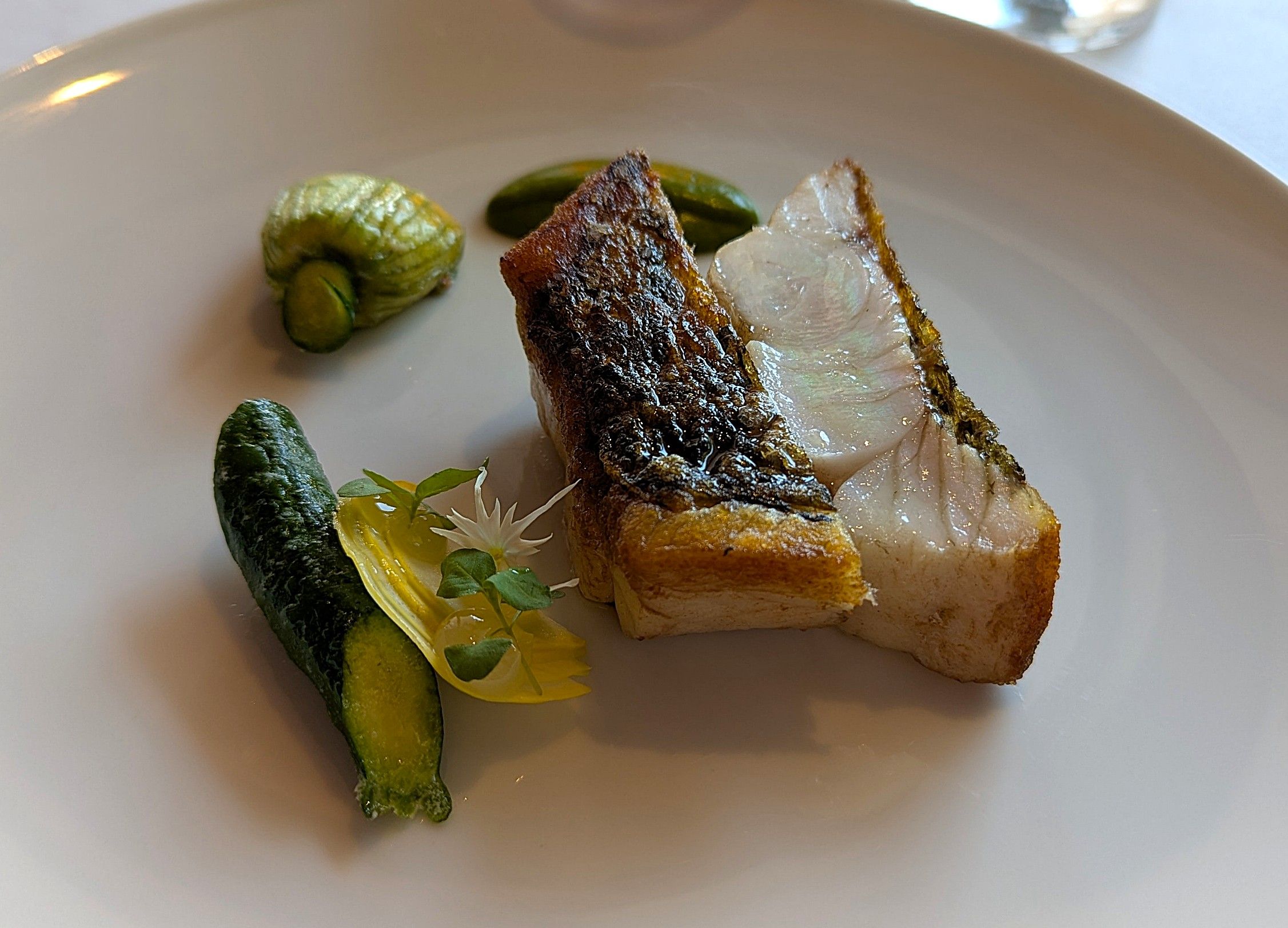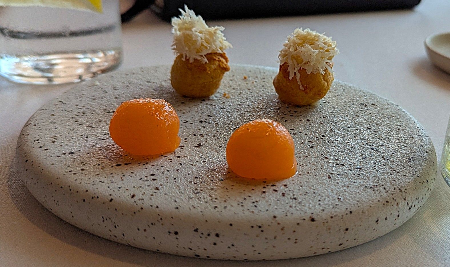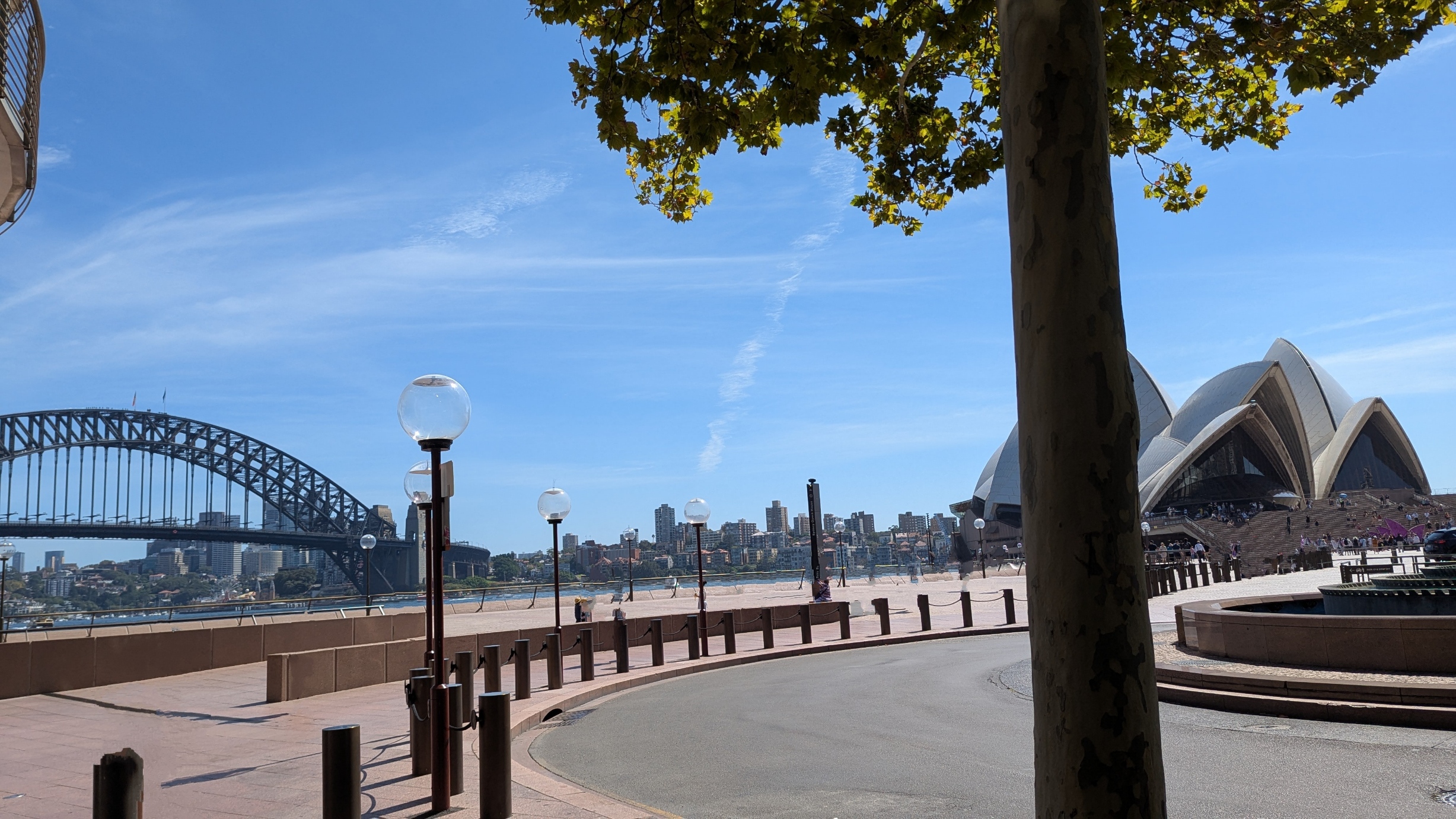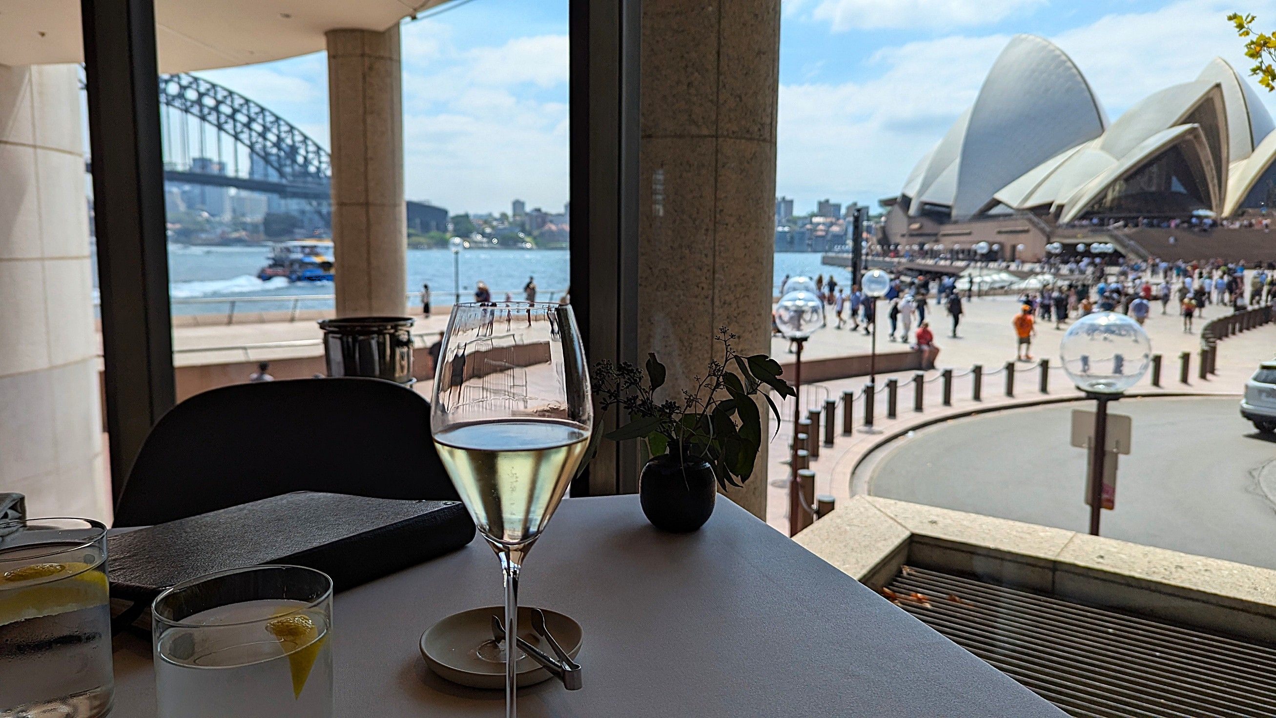 It was lovely to be at our favourite restaurant once again. Seated so that we could see both the Sydney Harbour Bridge and the Opera House was a benefit shared by most (if not all) of the customers – this is a brilliant feature of Aria. The dishes that we chose from the three-course menu were enhanced by the warm crusty bread and butter and the Amuse Buche of compressed melon and a zucchini ball with parmesan cheese (a very plain description of the Chef’s treat). The first courses were a tomato tart – heirloom tomato, artichoke, basil & buckwheat; and a spanner crab dish -K’gari spanner crab, corn, avocado & sorrel; followed by fish – barramundi, zucchini, tomatillo & basil and steak – O’Connor pasture fed angus fillet, kohlrabi, shallot, green peppercorn. The side of potato with burnt butter was amazing. Desserts – peach, hazelnut & earl grey ice-cream and a passionfruit souffle, liquorice & white chocolate were very special.